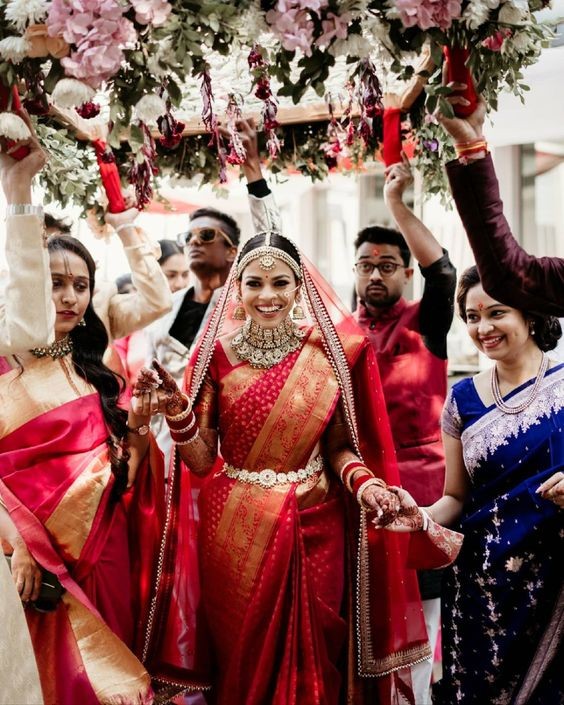 The perennial favorite among Indian brides, red symbolizes love, passion, and purity. It is deeply rooted in tradition and is believed to bring good luck and prosperity. Whether you opt for a deep maroon or a vibrant scarlet, a red saree is a timeless choice that radiates elegance and regality.