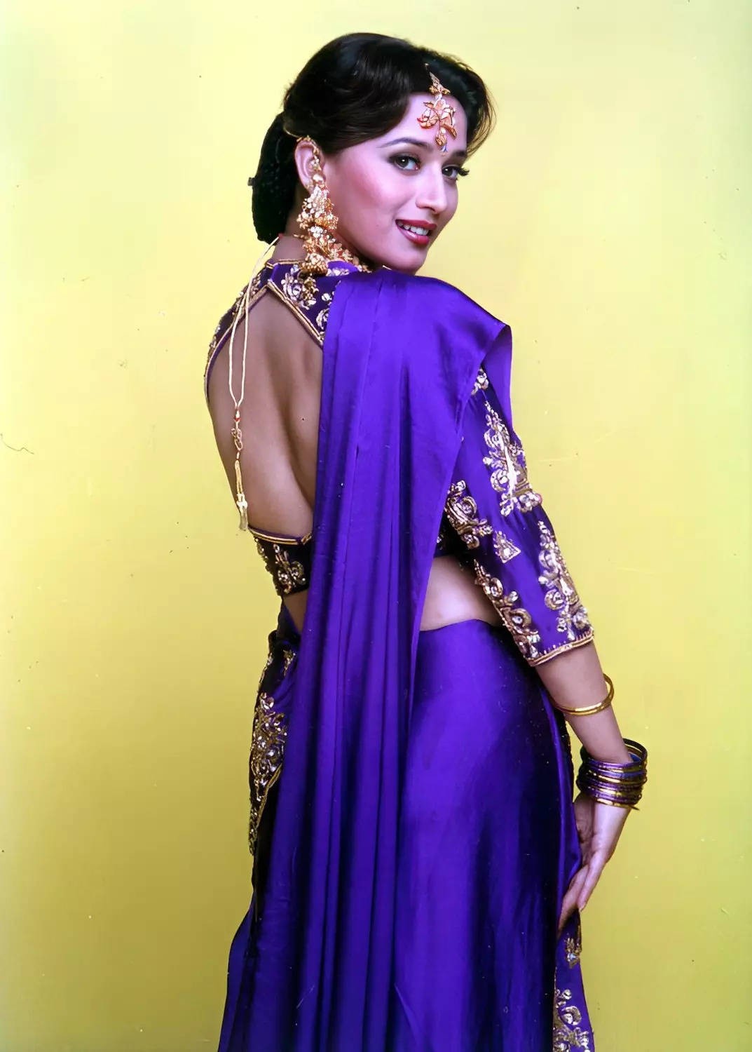 The power of Bollywood made it impossible to hold a baby shower without recalling Madhuri Dixit Nene and Salman Khan’s memorable song ‘Didi Tera Devar’ from ‘Hum Aapke Hain Koun..!’ Her purple embellished saree, complemented by a backless khidki blouse, attained the distinction of becoming the most-talked-about Bollywood saree of its time.