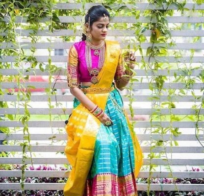 To achieve the half-saree drape, start by tucking one end of the saree into the waistband of your petticoat, allowing the rest of the fabric to fall freely. Take the other end of the saree and make pleats, securing them at the waist to create a skirt-like effect. Arrange the pallu over your shoulder and let it fall gracefully. You can experiment with different draping styles for the pallu, such as pleating it or leaving it loose for a relaxed and carefree look. Add a stylish blouse and statement accessories to complete the ensemble.
