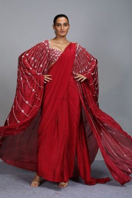 Adding a cape overlay to your saree is an excellent way to add drama and sophistication to your ensemble. This experimental drape involves draping the saree pallu over a stylish cape or jacket, creating a stunning fusion of traditional and western aesthetics. The cape overlay saree drape is a perfect choice for special occasions and evening events, where you can effortlessly make a bold fashion statement.