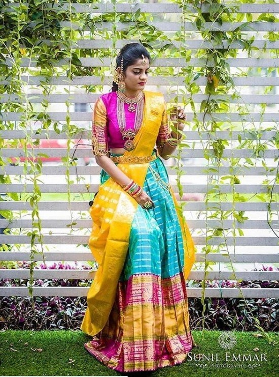 To achieve the half-saree drape, start by tucking one end of the saree into the waistband of your petticoat, allowing the rest of the fabric to fall freely. Take the other end of the saree and make pleats, securing them at the waist to create a skirt-like effect. Arrange the pallu over your shoulder and let it fall gracefully. You can experiment with different draping styles for the pallu, such as pleating it or leaving it loose for a relaxed and carefree look. Add a stylish blouse and statement accessories to complete the ensemble.