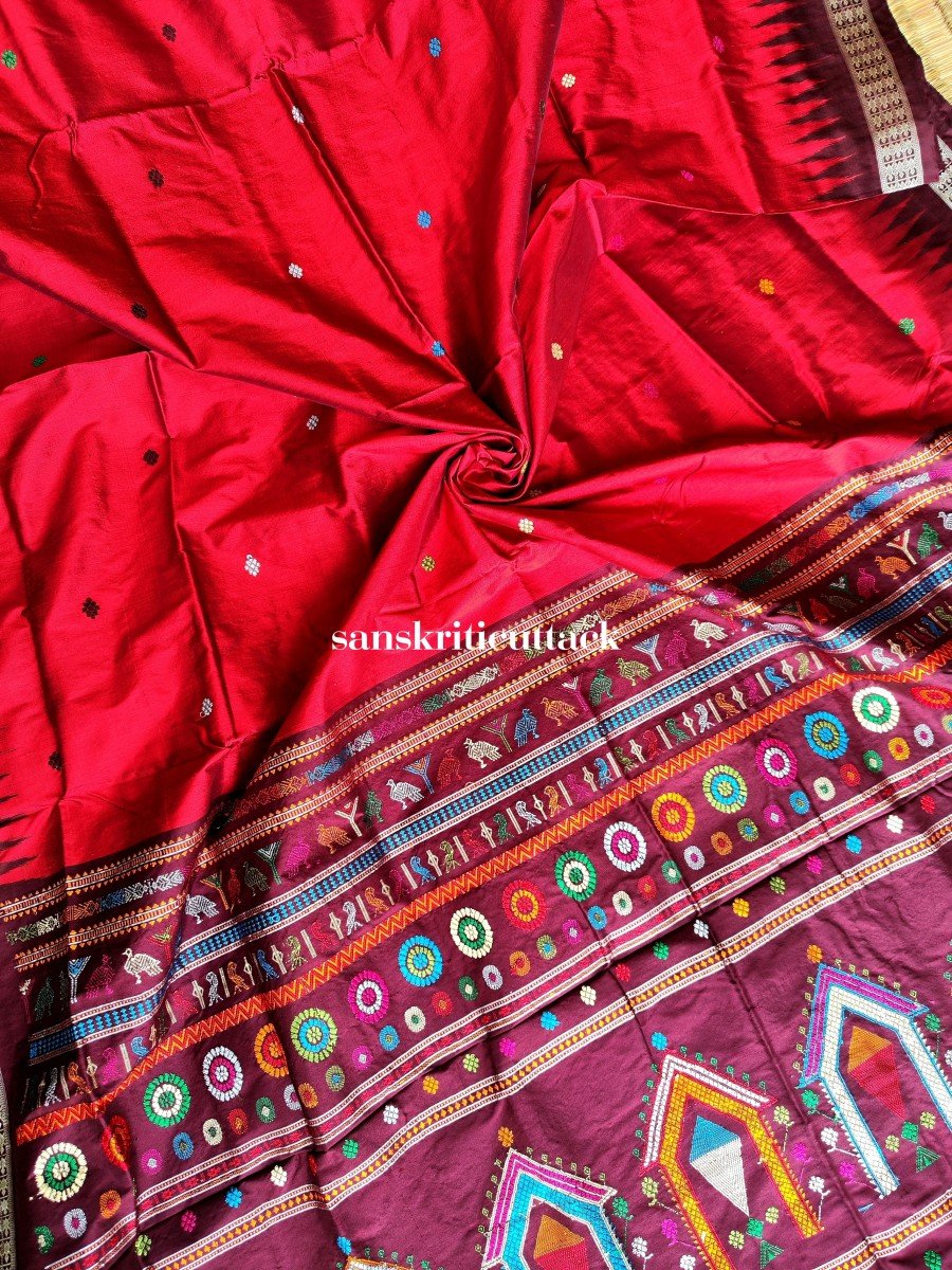 The body of the saree is relatively plain and simple, with multicolored butas. The pallu, on the other hand, is very colorful and depicts turtles, parrots, and Dola (chariots). The colorful part of the saree is offset against the plain body, which actually makes it look regal. The feel of the saree is so soothing to the heart and mind that it is no wonder that it is a popular choice among women.