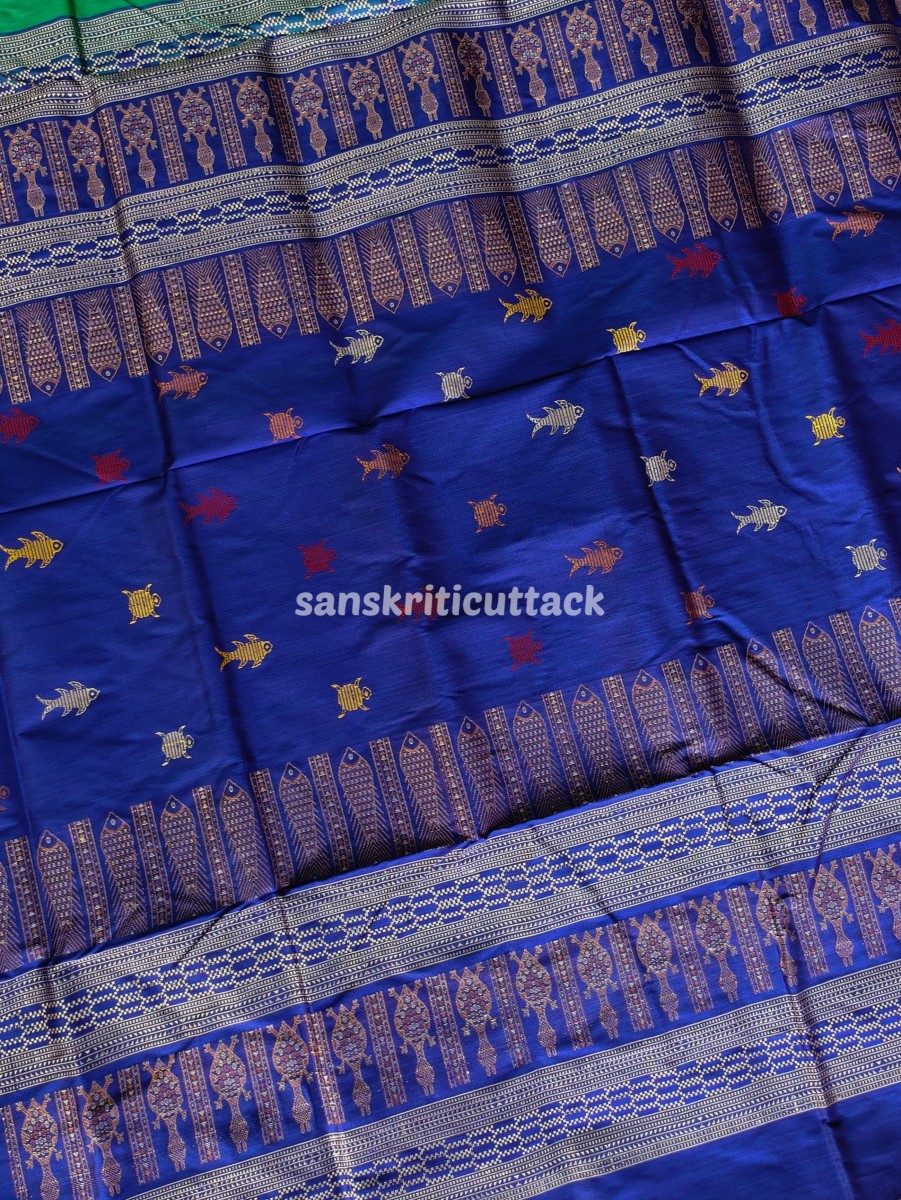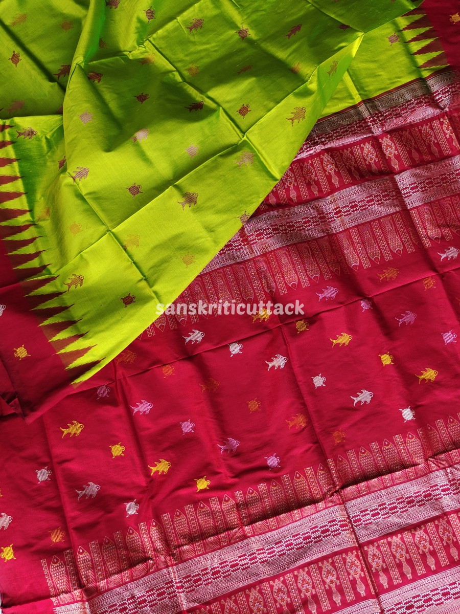 The Habaspuri handloom saree slowly lost its charm with the decline of the dynasty after the 19th century. But thanks to master weaver Ugrasen Meher in Chicheguda, the Habaspuri Silk Saree was revived and has won hearts since then. The textile of Habaspuri Saree is a cotton handloom and has unique designs like Kumbha (temple), fish, and flowers that are woven into the sarees. The longitudinally arranged temple motifs are the speciality of the Habaspuri Silk Saree. These motifs on the yarn and the yarn to fabric are woven on a frame and fitted with a dobby.