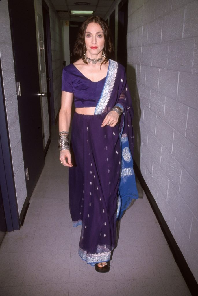 Madonna, the queen of pop, embraces the serenity of a blue saree, proving that this traditional garment can be both trendy and timeless.