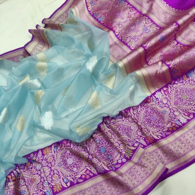 • To preserve the quality of organza and tissue sarees, it is recommended to store them in a cool, dry place, away from direct sunlight. Folding them carefully and using muslin or cotton covers can help prevent creasing and damage.