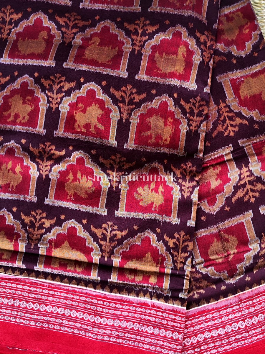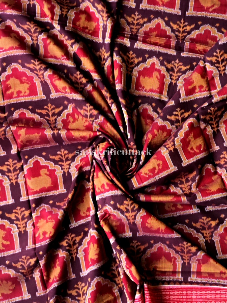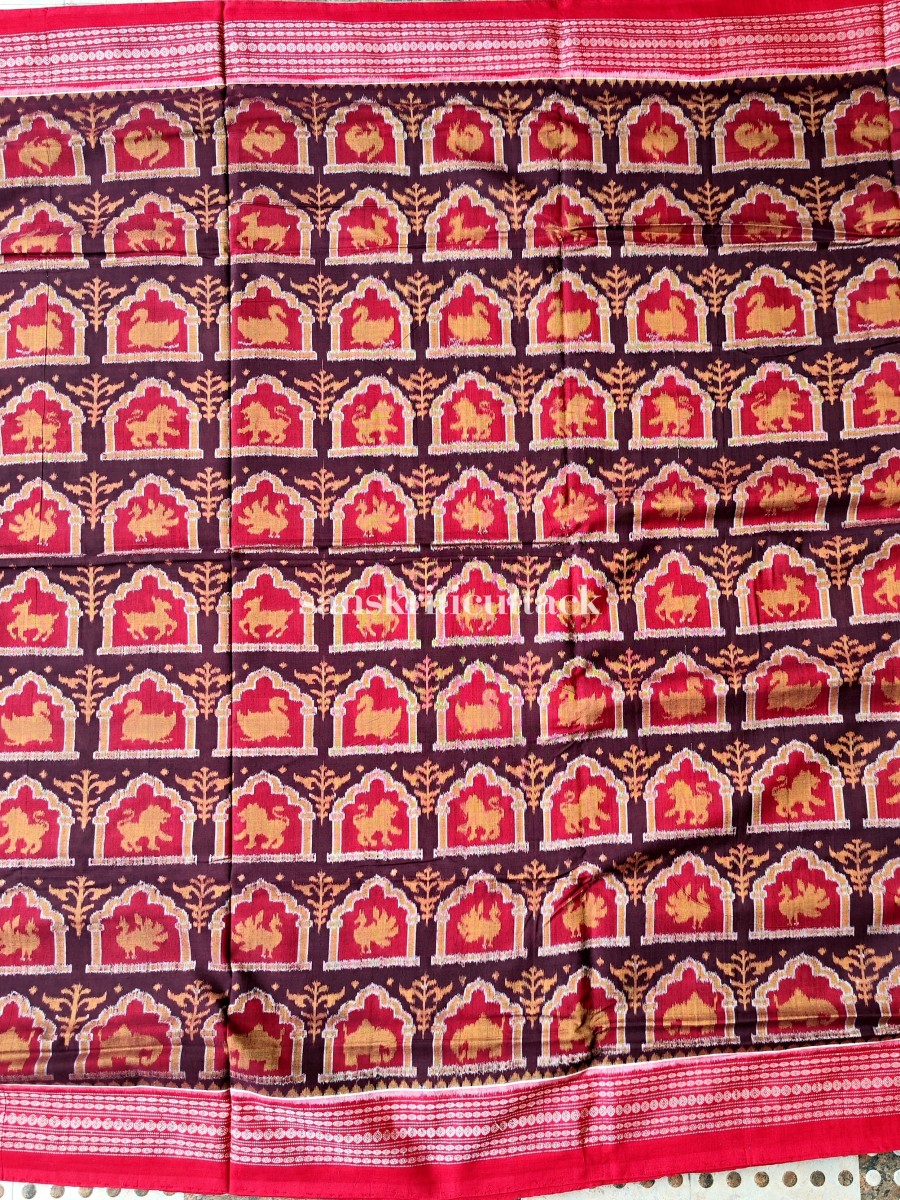 Discover elegance in our Animal Motifs Coffee Maroon Handloom Ikat Sambalpuri Cotton Saree. Crafted by skilled artisans, it showcases intricate animal motifs in contrasting coffee and maroon hues. Crafted from premium Sambalpuri cotton, the saree is lightweight, soft, and enduring, destined to be treasured for years. This piece is ideal for women who adore distinctive elegance that mirrors their individuality, perfect for any occasion. Elevate your wardrobe with our Animal Motifs Coffee Maroon Handloom Ikat Sambalpuri Cotton Saree.