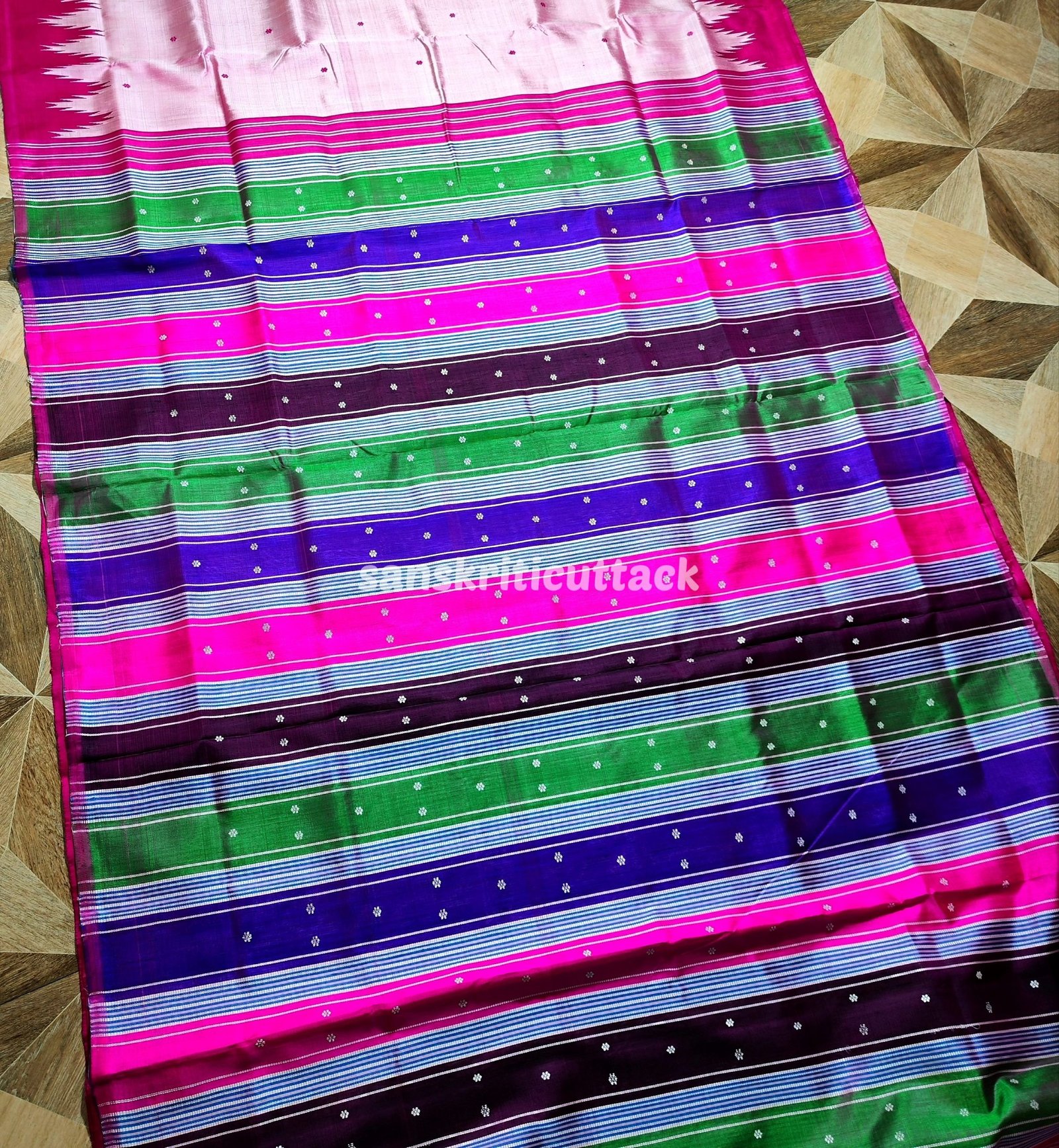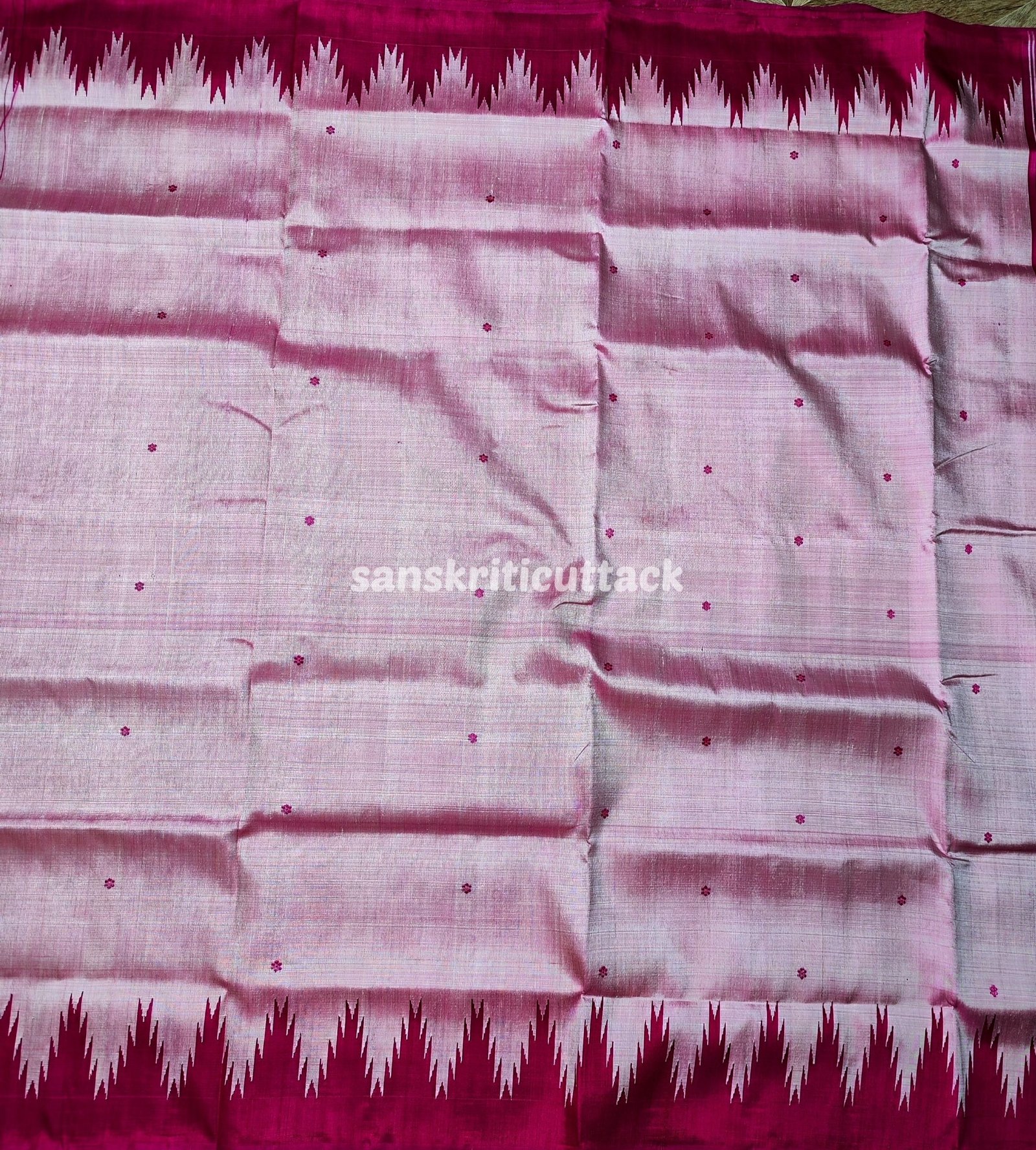 Elevate your style with the exquisite Berhampuri Double Pallu Light Pink Silk Saree. Crafted with precision, this saree embodies timeless elegance. The delicate light pink hue exudes grace, making it a captivating choice for any occasion. Its intricate design showcases the rich cultural heritage of Berhampur. Made from pure silk, it drapes luxuriously, flattering your silhouette. The double pallu adds a unique touch, allowing you to drape it in multiple ways. Whether it’s a wedding celebration or a festive event, this saree is the epitome of traditional charm. With limited stock, seize the opportunity to own a piece of art that merges tradition with contemporary style. Turn heads and make a statement with this mesmerizing Berhampuri silk saree.