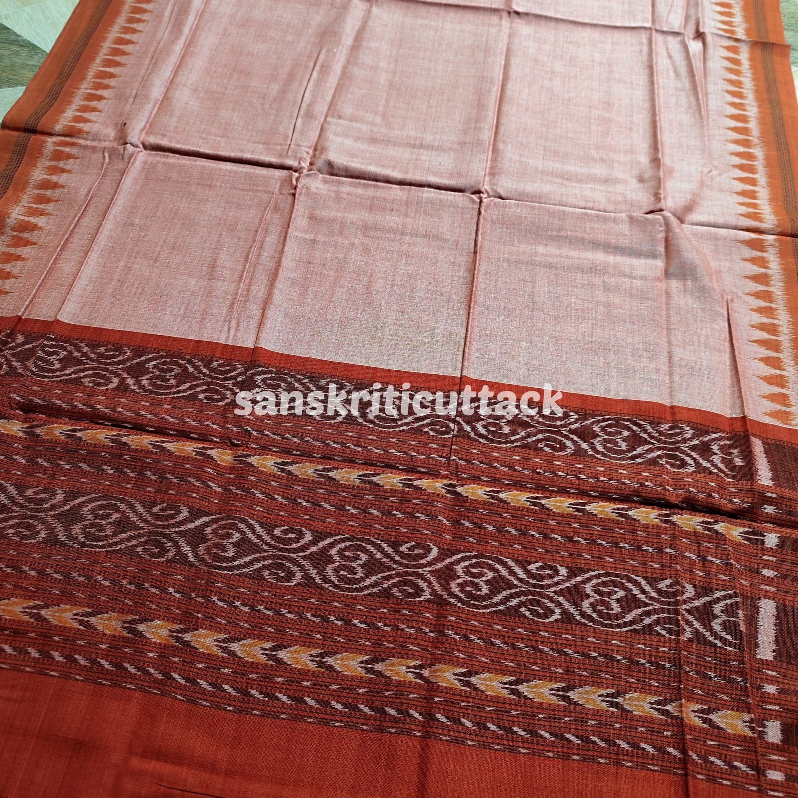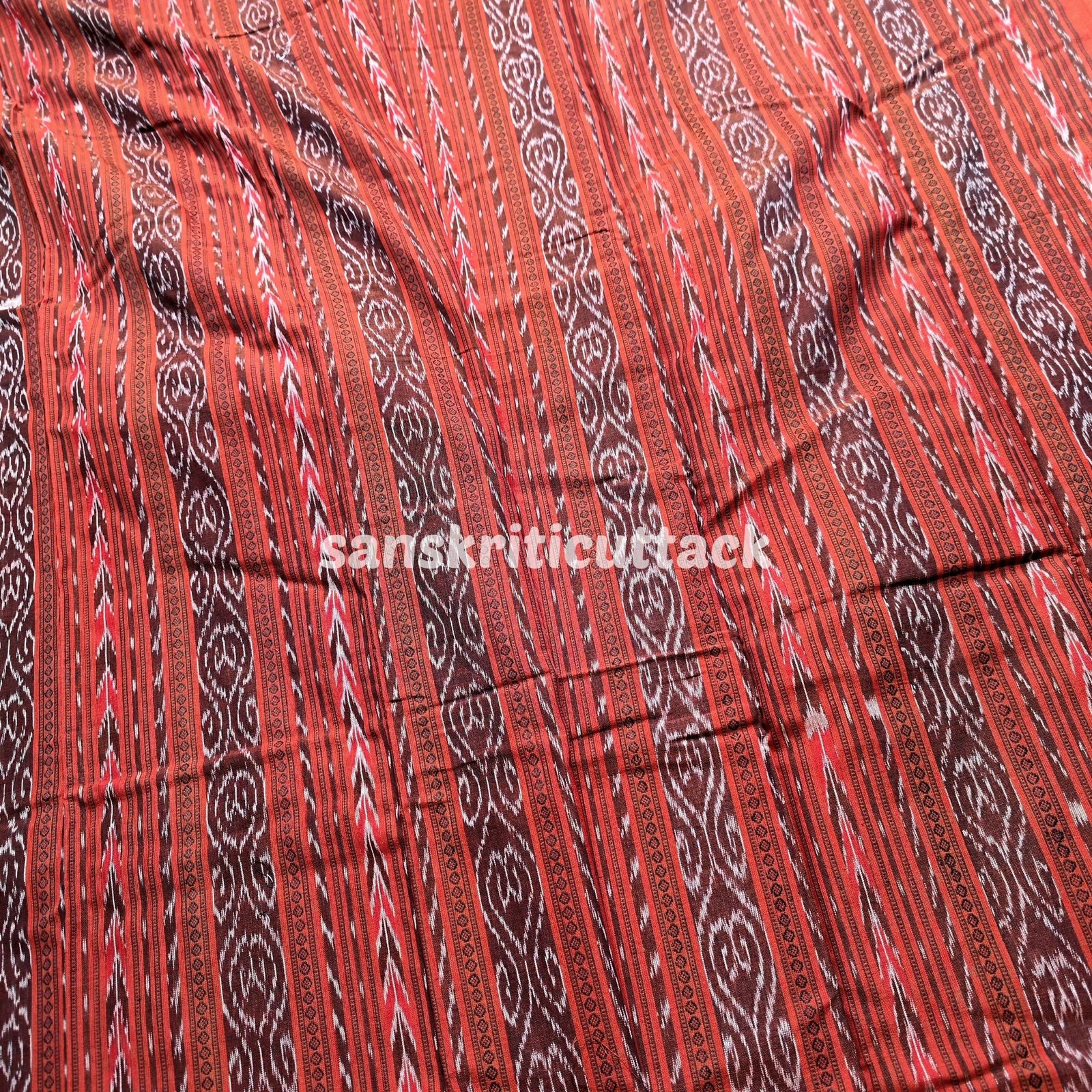 The top fabric boasts a mesmerizing Clay Orange hue, crafted from premium-quality ikat fabric. The intricate patterns and vibrant shades are a testament to the skilled craftsmanship and rich heritage of Sambalpuri designs. Embrace the elegance and grace of this handloom masterpiece.