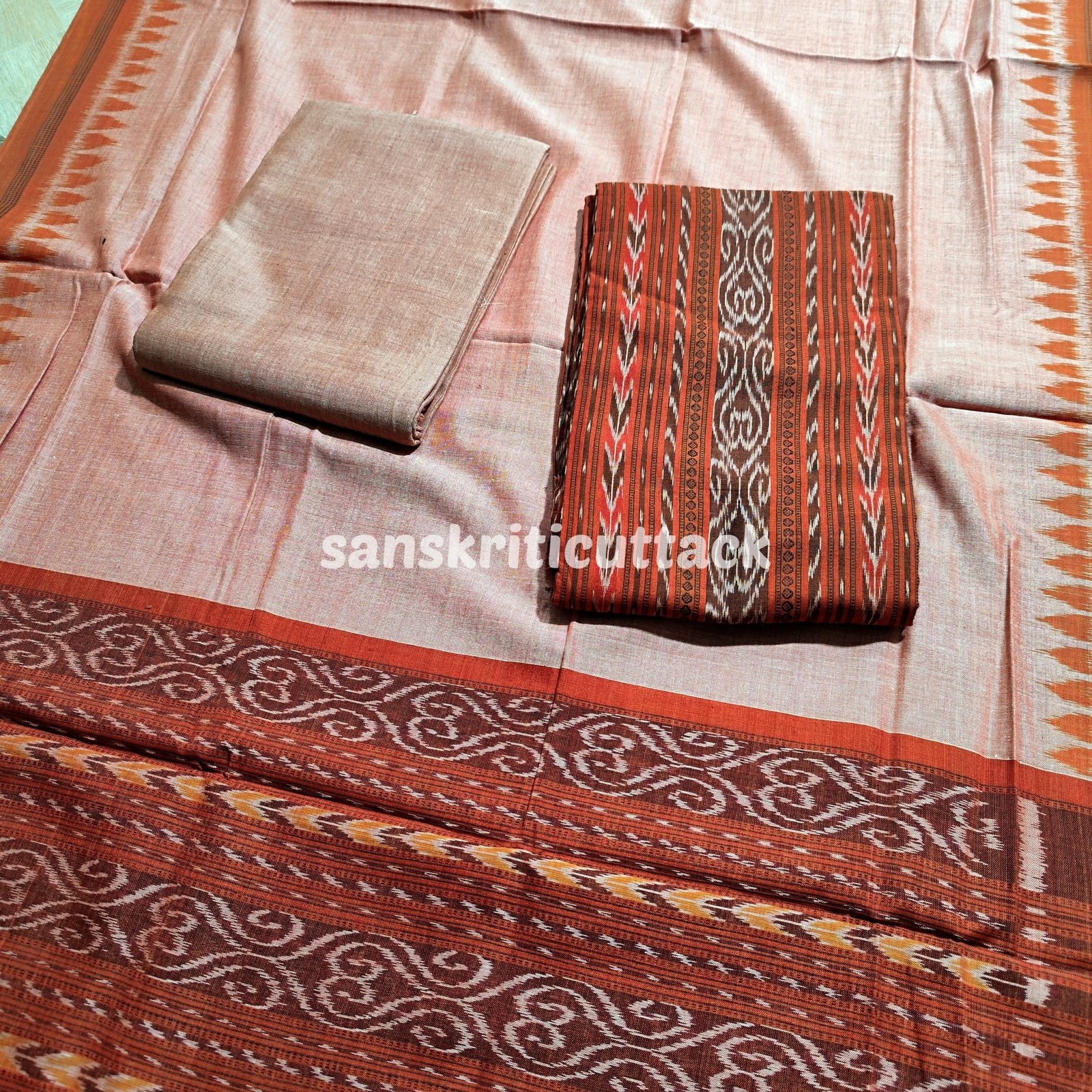 Clay Orange Cotton Handloom Sambalpuri Ikat Dress Material