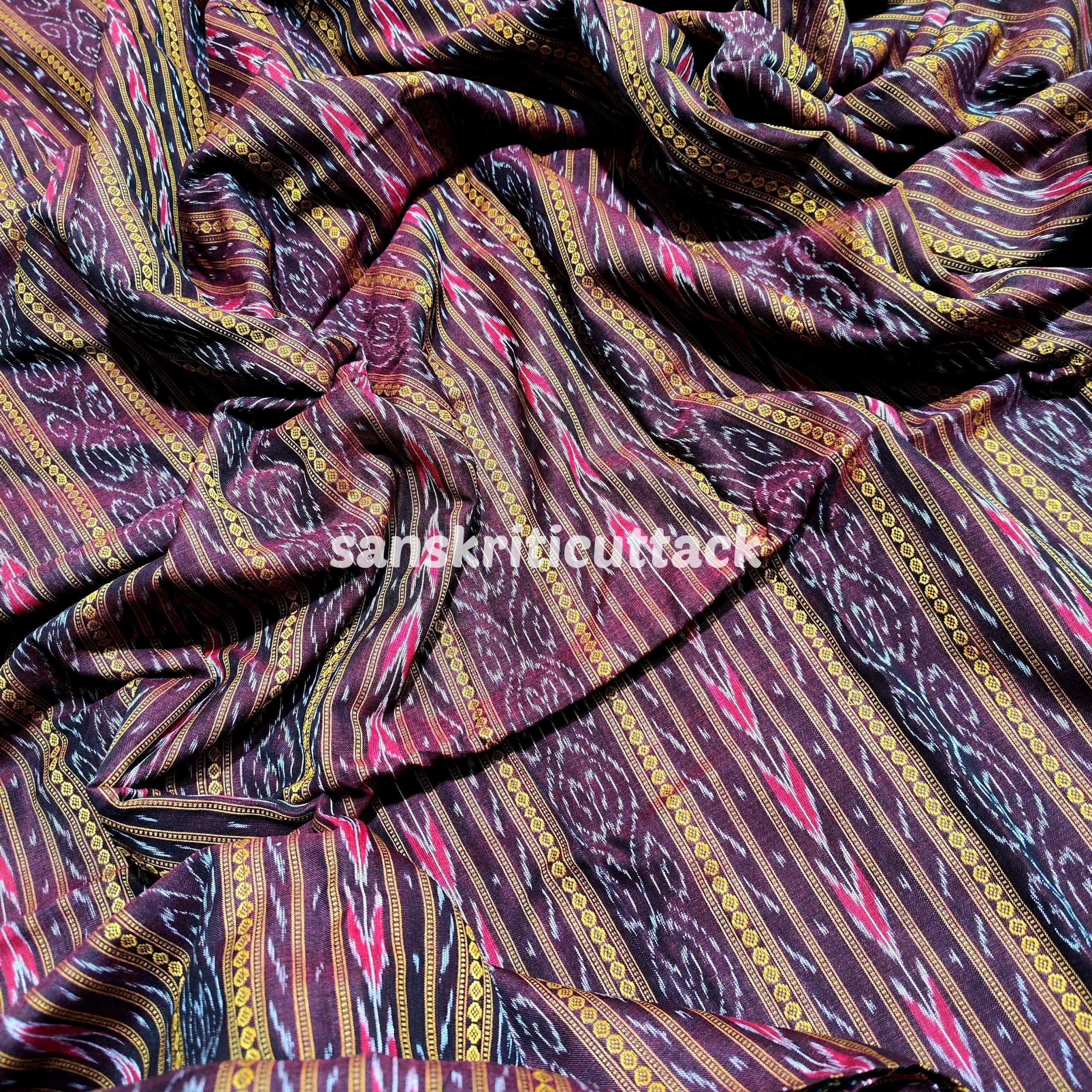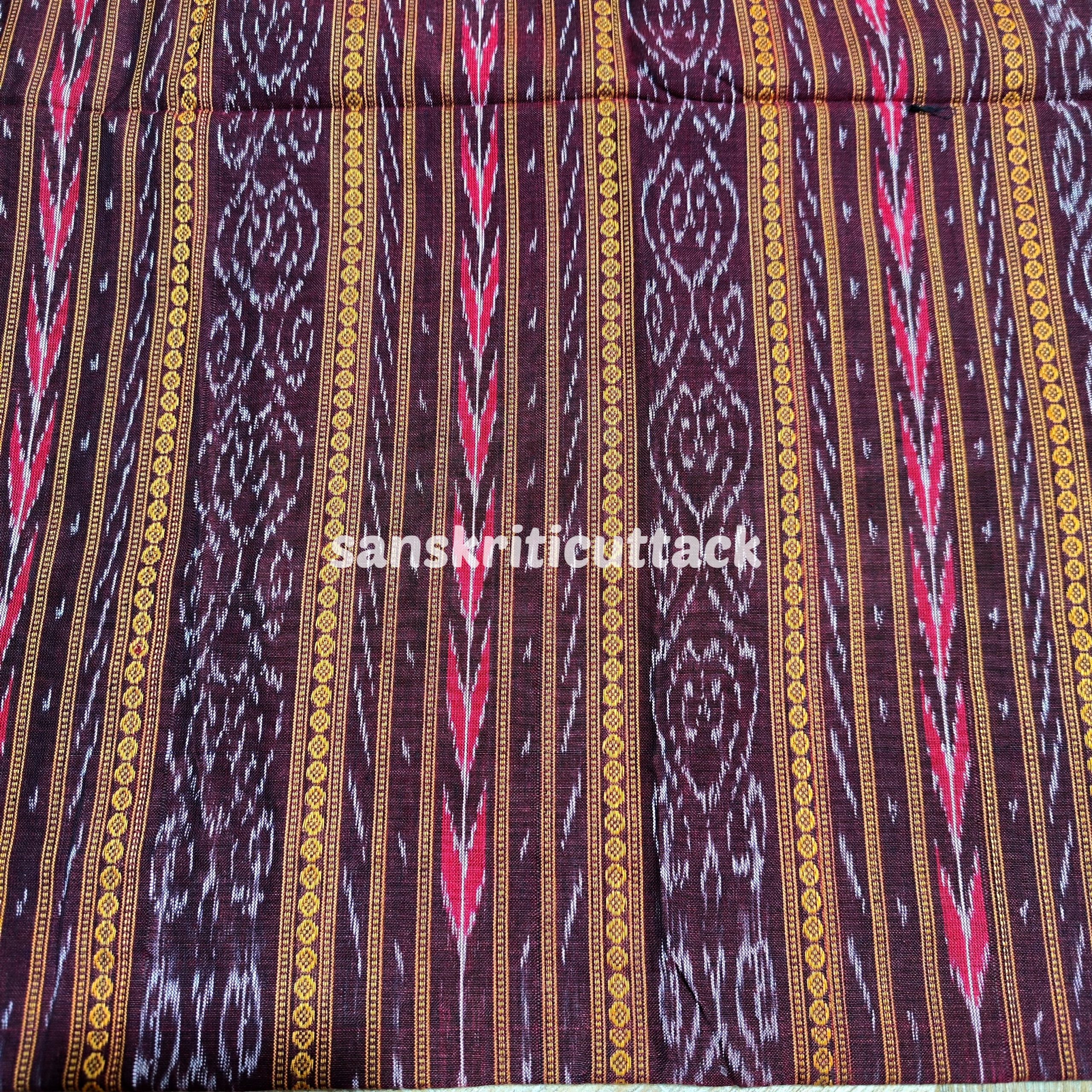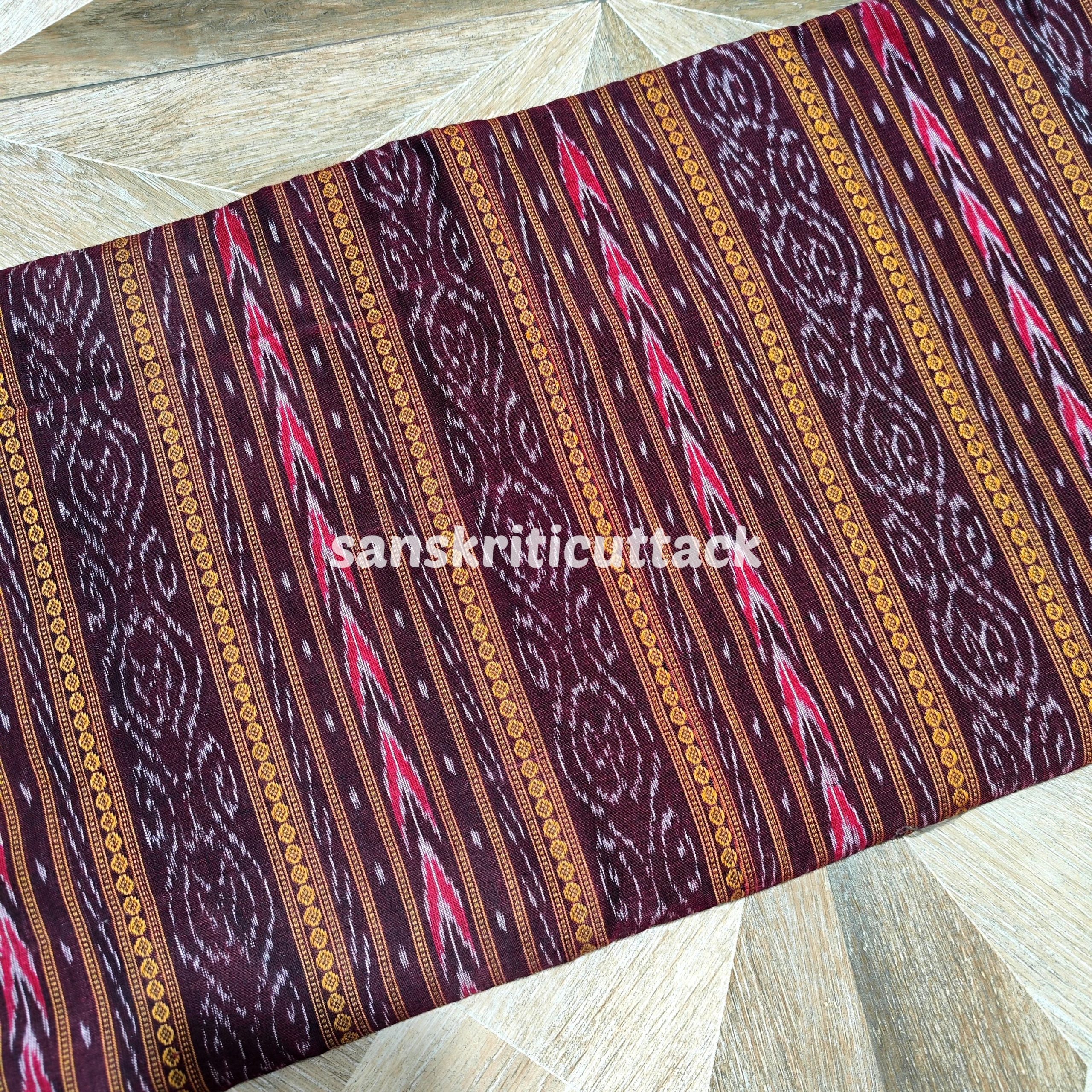 This beautiful Coffee handloom cotton fabric is crafted using the traditional Sambalpuri Ikat pattern. Handwoven with the Ikat technique, this fabric features joyful colors and intricate designs. Ikat (Ikkat) is a dyeing technique that employs a resist dyeing process similar to tie-dye on either the warp or weft fibers prior to dyeing. This fabric is made from pure cotton, which makes it lightweight, breathable, and comfortable to wear. Sambalpuri Ikat fabrics are world-famous for their extremely beautiful colors, texture, and designs. Elevate your wardrobe with our Coffee Handloom Cotton Sambalpuri Ikat Fabric. Handwoven by skilled artisans, this fabric features a unique ikat design that showcases the beauty of traditional weaving techniques. Made with soft cotton and natural dyes, this sustainable and eco-friendly fabric is perfect for creating vibrant and colorful Ikat clothing. The intricate Ikat pattern and traditional Ikat weave make it a must-have for any fashion enthusiast looking to make a statement with their clothing. Shop now and add a touch of ethnic elegance to your wardrobe!