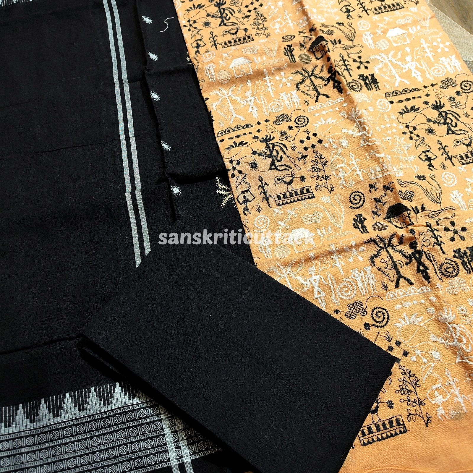 Step into the realm of timeless elegance with our Cream Black Embroidery Nuapatna Handloom Cotton Dress Material. Crafted by the skilled artisans of Nuapatna, Odisha, this handloom cotton suit material set is a masterpiece of tribal artistry.