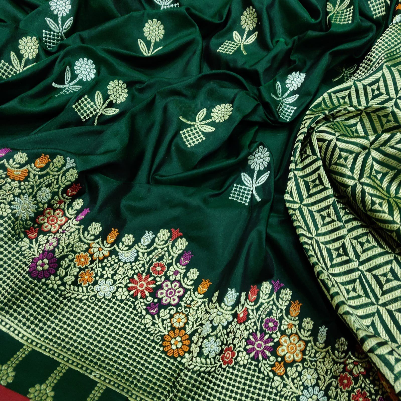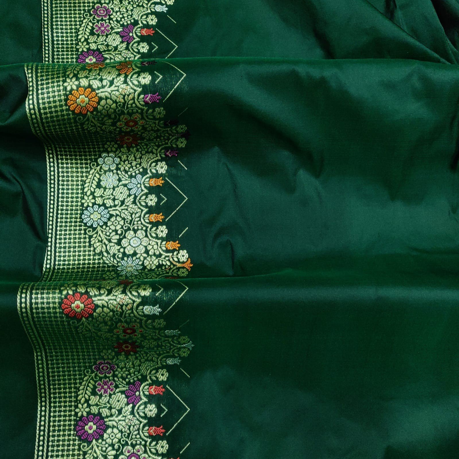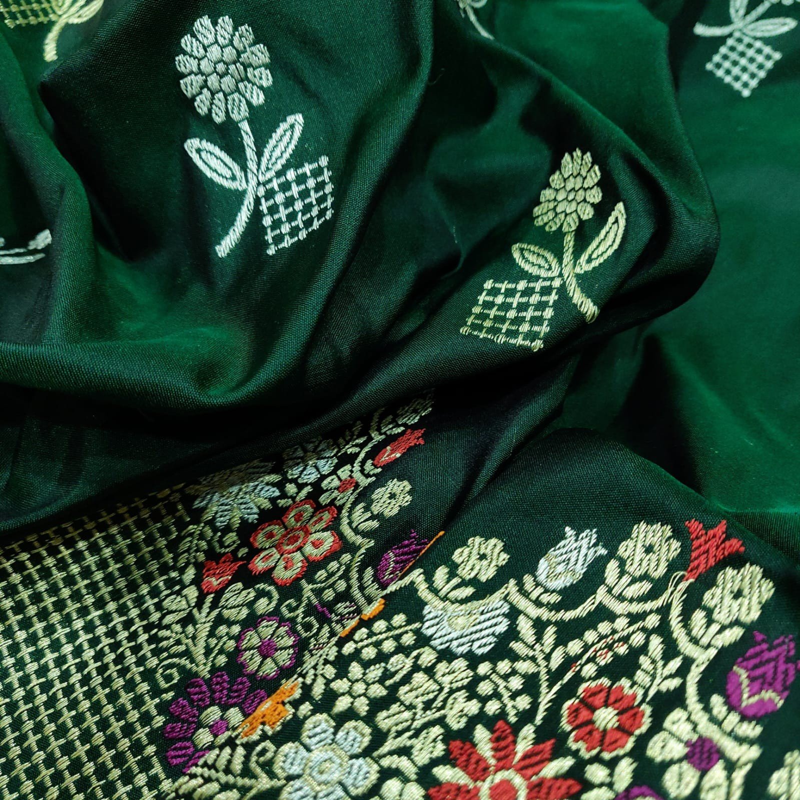Dark Green Handwoven Katan Silk Banarasi Saree with Kadwa Booties