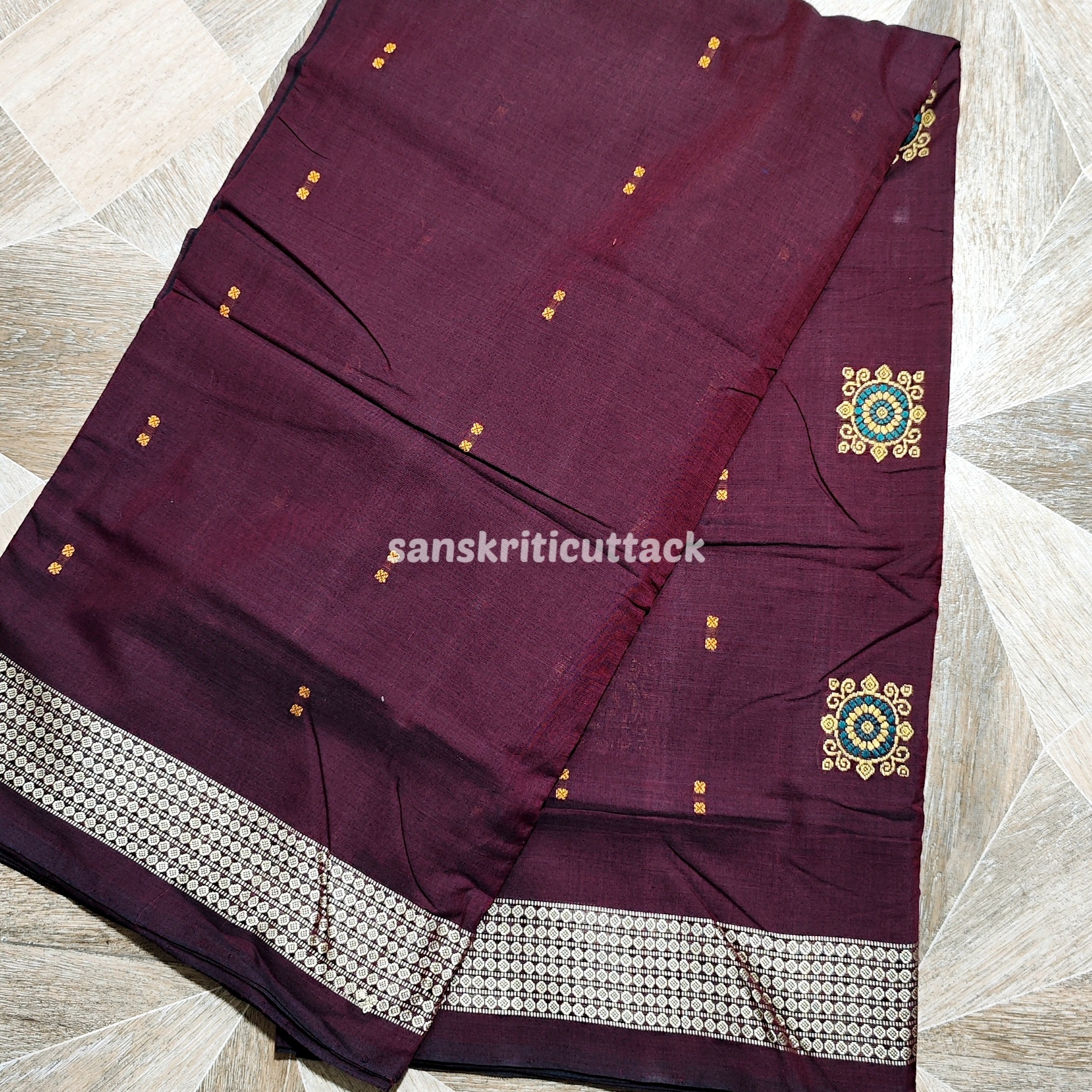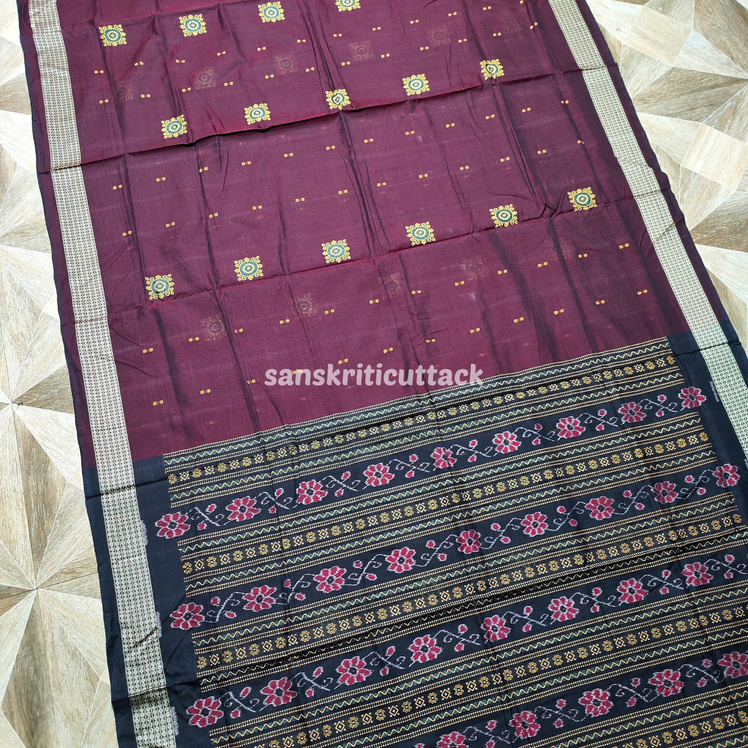 Handwoven by skilled artisans, this saree features a rich dark maroon and black color combination that exudes sophistication and charm. The Bomkai weave, known for its intricate patterns and textures, adds a touch of luxury to this classic piece. Made from high-quality cotton, this saree offers both comfort and durability, ensuring you look and feel your best all day long.
