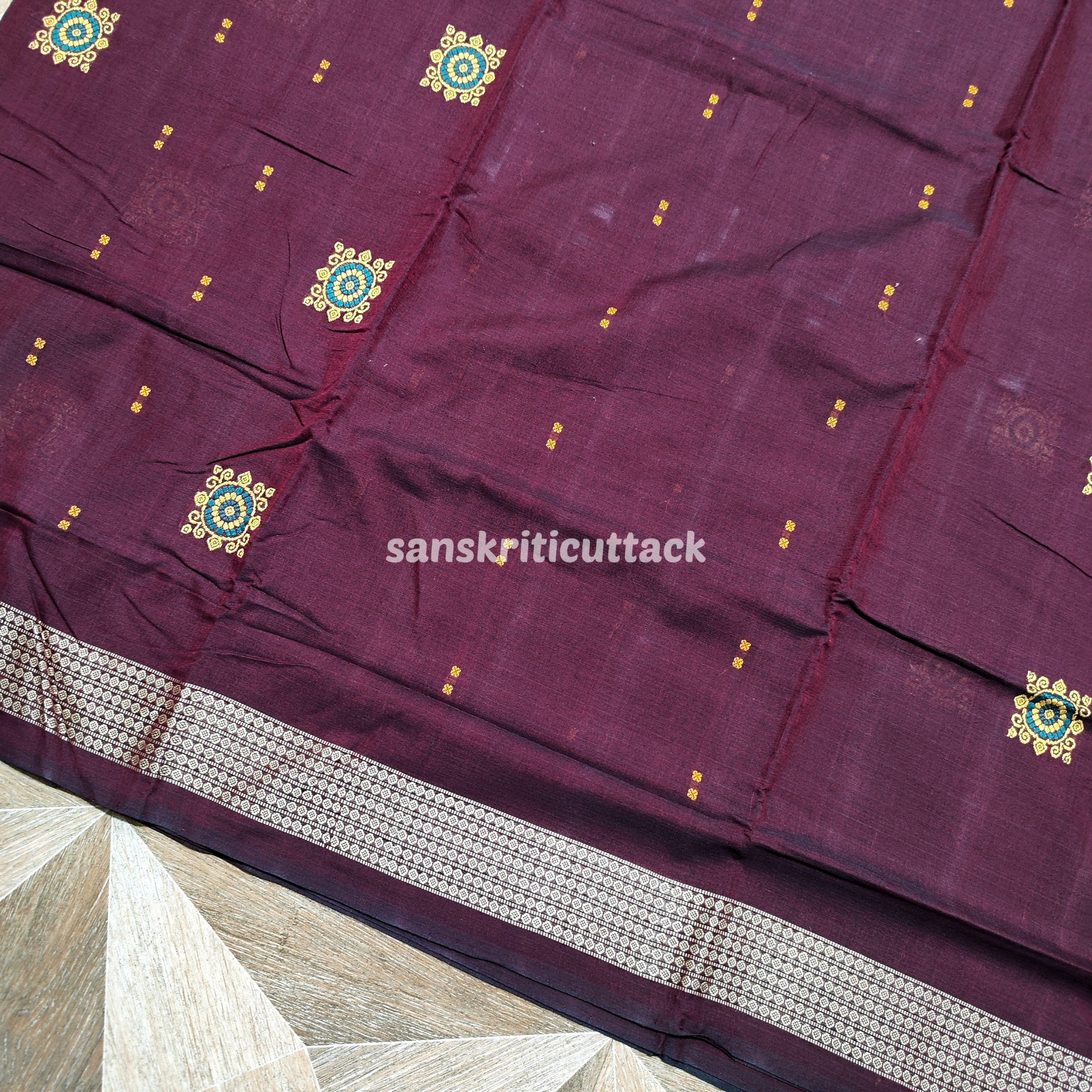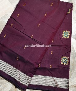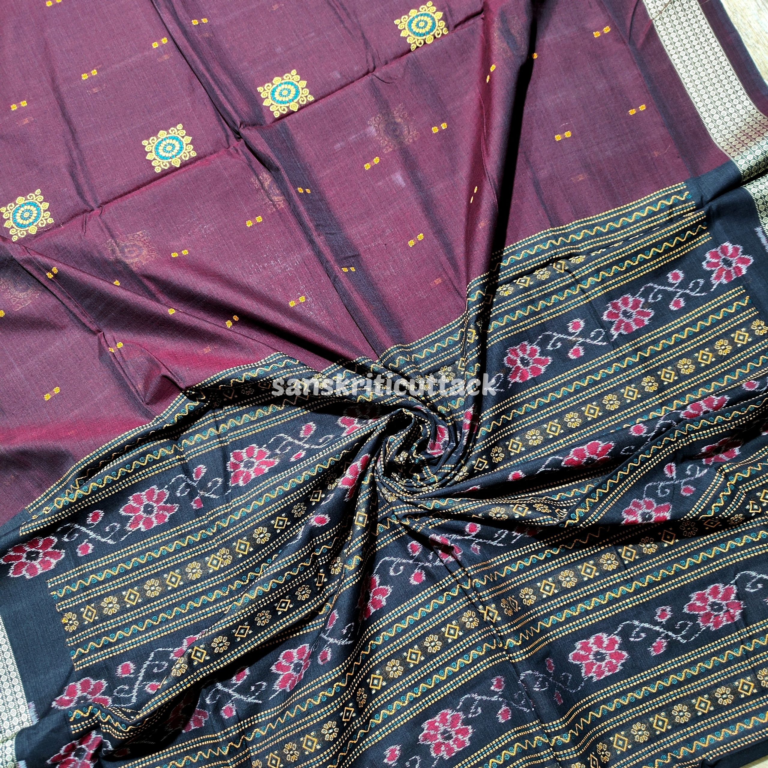 Elevate your wardrobe with our exquisite Dark Maroon Black Handcrafted Cotton Bomkai Saree. This stunning saree blends traditional craftsmanship with modern elegance, making it the perfect choice for any special occasion or everyday wear.
