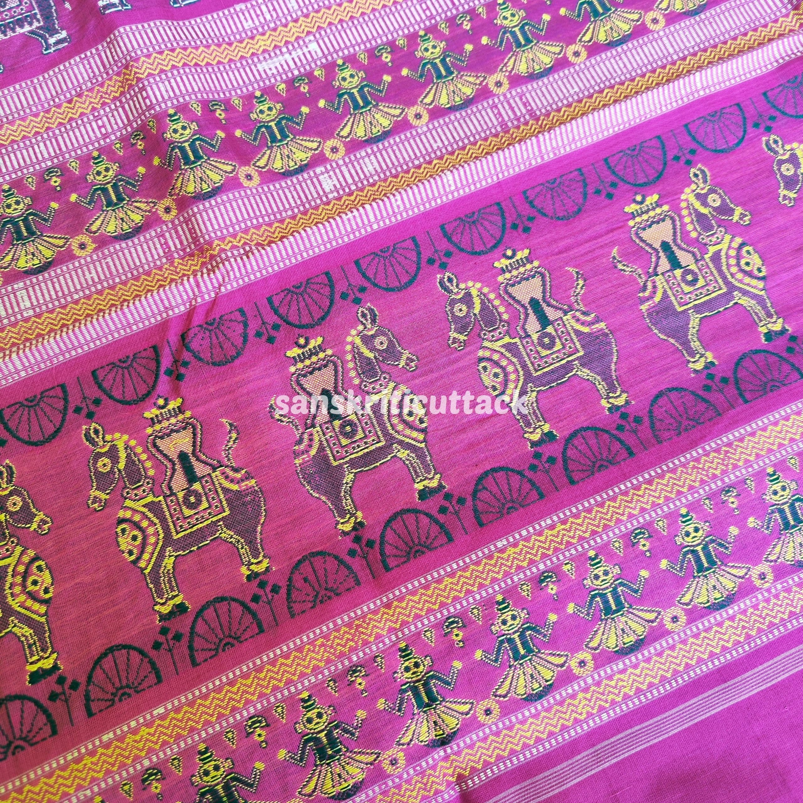 Experience the allure of tradition with our Dark Purple Bomkai Cotton Saree, a masterpiece of elegance. The exquisite Lavender Pallu boasts intricately handwoven motifs depicting the grace of Elephants, the majesty of Horses, and the charm of Dolls, all crafted using the extraordinary extra-weft technique. Elevate your fashion statement with this blend of Dark Purple and Lavender, perfect for special occasions. The saree comes with a matching blouse, allowing you to embrace the fusion of heritage and contemporary fashion. Indulge in the luxury of artistry and comfort, capturing attention with every drape. Shop now and immerse yourself in the beauty of age-old craftsmanship.”