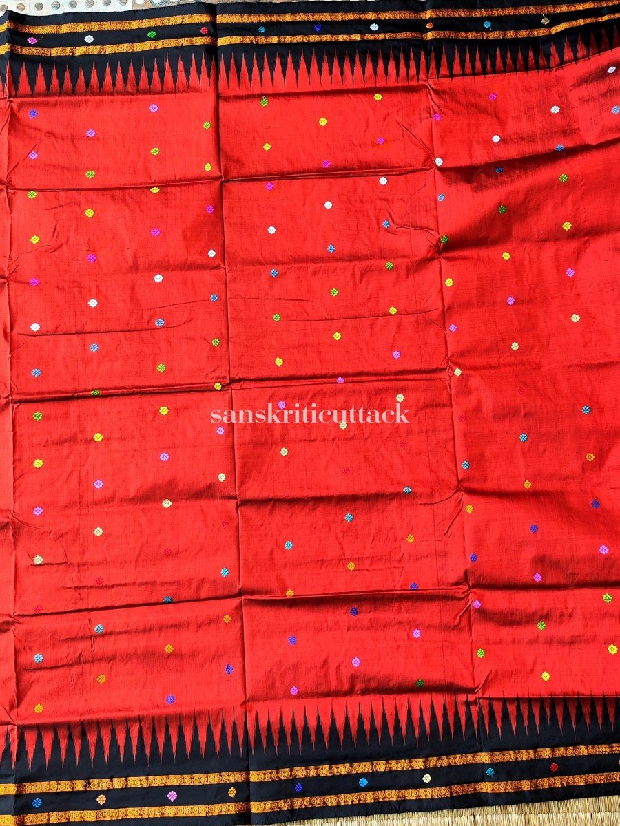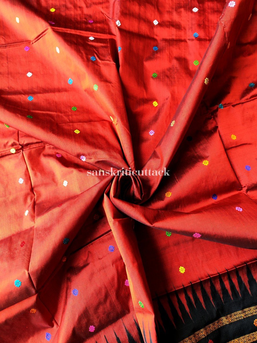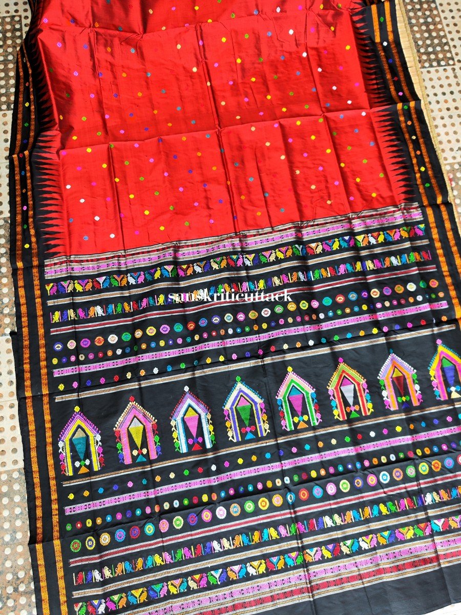 Indulge in the allure of the Dolabedi Brick Red Black Handwoven Silk Saree with its captivating charm and exquisite craftsmanship. Made from the finest mulberry silk, this saree celebrates the rich tradition of Odisha weaves and showcases the vibrant beauty of Dola Utsav.