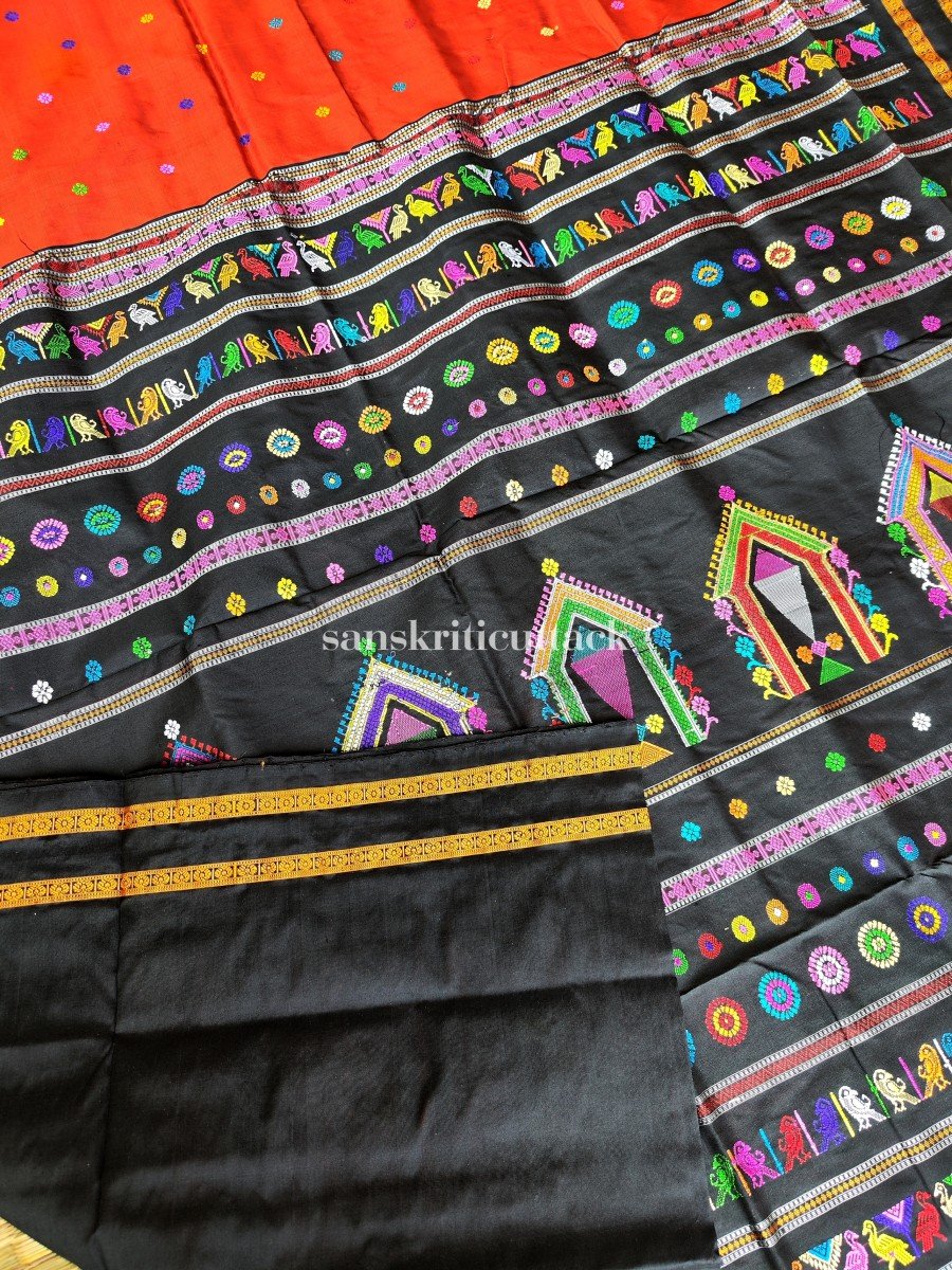 The saree’s striking brick red and black combination is enhanced by its colourful pallus, meticulously woven with extra weft. The pallus depict the traditional Dola Utsav, featuring motifs resembling triangles or domes, symbolizing joyous celebrations. The pallu is adorned with intricate designs of turtles, parrots, and chariots, adding an element of grace and elegance.