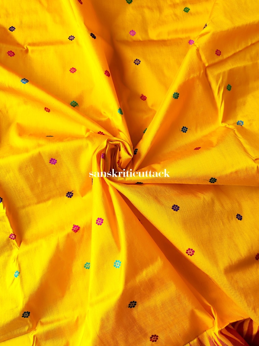 Adorned with a plethora of multicoloured butas scattered across the body, this saree creates a striking contrast between its vibrant pallu and relatively plain yet elegant body, elevating your overall look. The pallu itself boasts intricate patterns featuring turtles, parrots, and Dola (chariots), further enhancing its appeal and symbolizing auspiciousness.