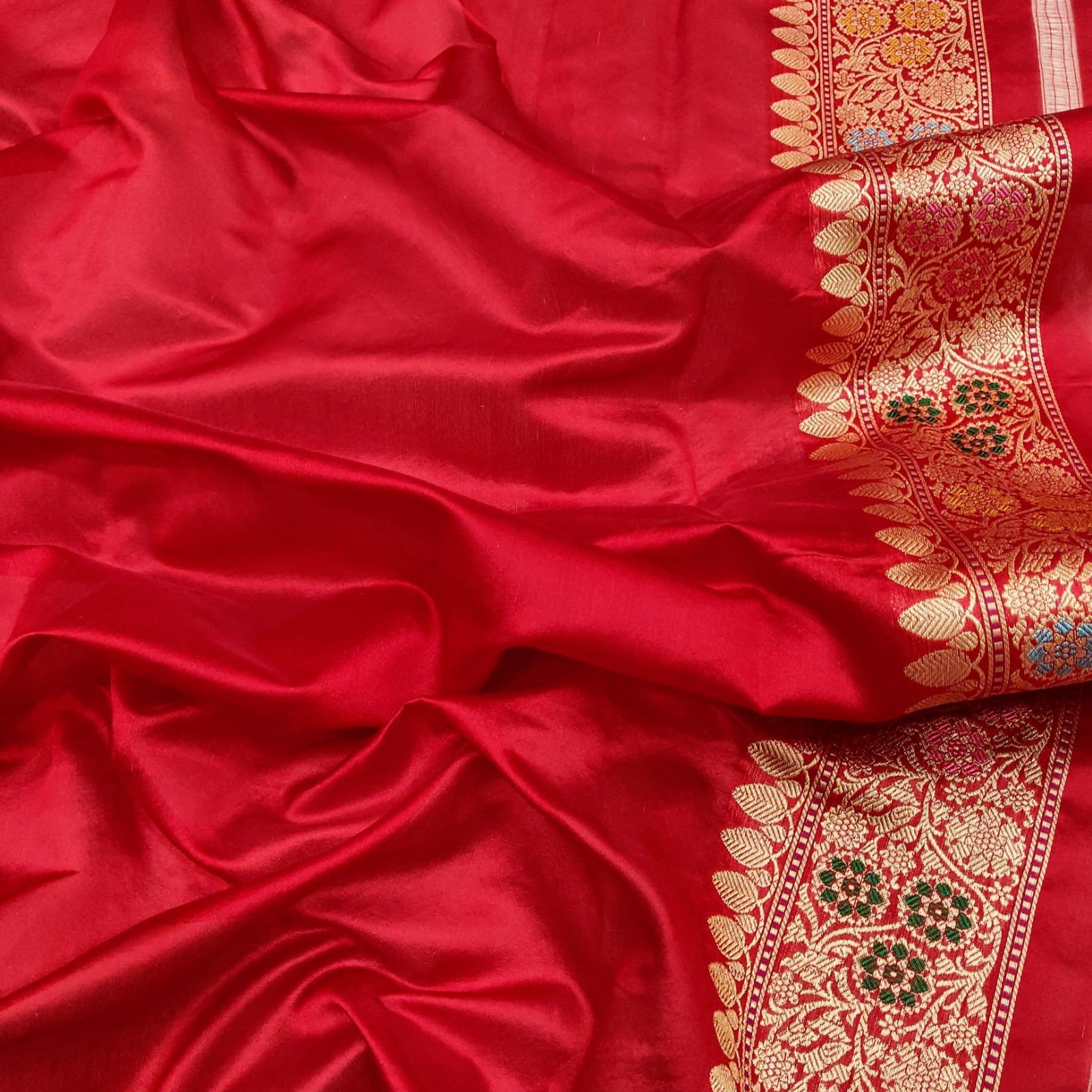 Every fold of this drapery narrates a story of devotion and tradition, as skilled artisans invest their passion into shaping this exclusive masterpiece. Complementing the saree’s charm is a striking red blouse, perfectly harmonizing with the overall look.