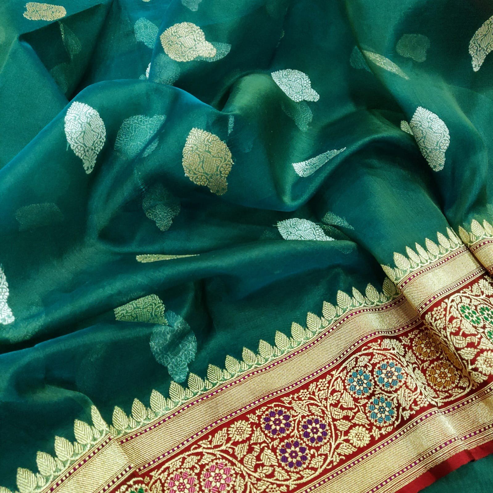 Experience the allure of our Green Handwoven Kadwa Silk Organza Saree, a testament to timeless elegance and exquisite craftsmanship. This Banarasi saree, meticulously handcrafted, boasts enchanting silver and gold zari bootas that exude sophistication. The designer Meenakari border adds a captivating contrast to the serene green palette.
