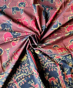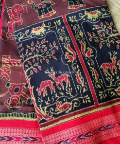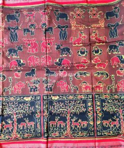 Elevate your style with our artisan-crafted hand-woven ikat cotton saree. A testament to ancient craftsmanship, this saree boasts intricate patterns and lively colors that captivate. The exclusive design featuring charming cartoon animal motifs like elephants, birds, and monkeys infuses a delightful and whimsical vibe.