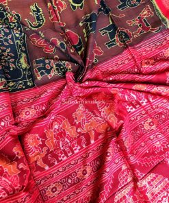 Elevate your style with our artisan-crafted hand-woven ikat cotton saree. A testament to ancient craftsmanship, this saree boasts intricate patterns and lively colors that captivate. The exclusive design featuring charming cartoon animal motifs like elephants, birds, and monkeys infuses a delightful and whimsical vibe.
