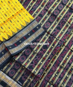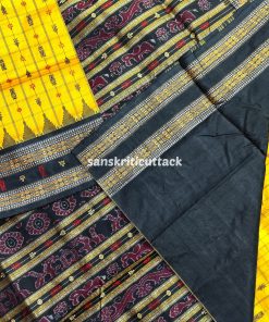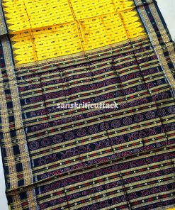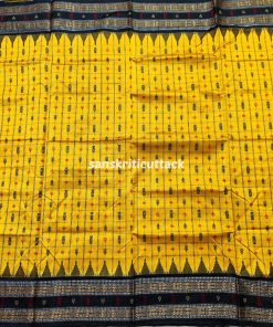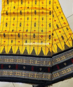 Indulge in the allure of our Golden Yellow Black Hazar Buti Phoda Kumbha Tussar Silk Saree. A stunning Sambalpuri creation, adorned with 1000+ meticulously crafted butis that span the length of the body. This masterpiece boasts intricate motifs, including turtles, fish, and flowers, set against a captivating checkered backdrop. The meticulous detailing creates a mesmerizing effect, making this saree a true work of art. Elevate your style with the perfect blend of tradition and sophistication, embodied in this golden marvel.