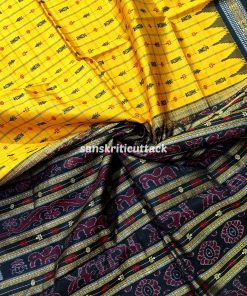 Indulge in the allure of our Golden Yellow Black Hazar Buti Phoda Kumbha Tussar Silk Saree. A stunning Sambalpuri creation, adorned with 1000+ meticulously crafted butis that span the length of the body. This masterpiece boasts intricate motifs, including turtles, fish, and flowers, set against a captivating checkered backdrop. The meticulous detailing creates a mesmerizing effect, making this saree a true work of art. Elevate your style with the perfect blend of tradition and sophistication, embodied in this golden marvel.