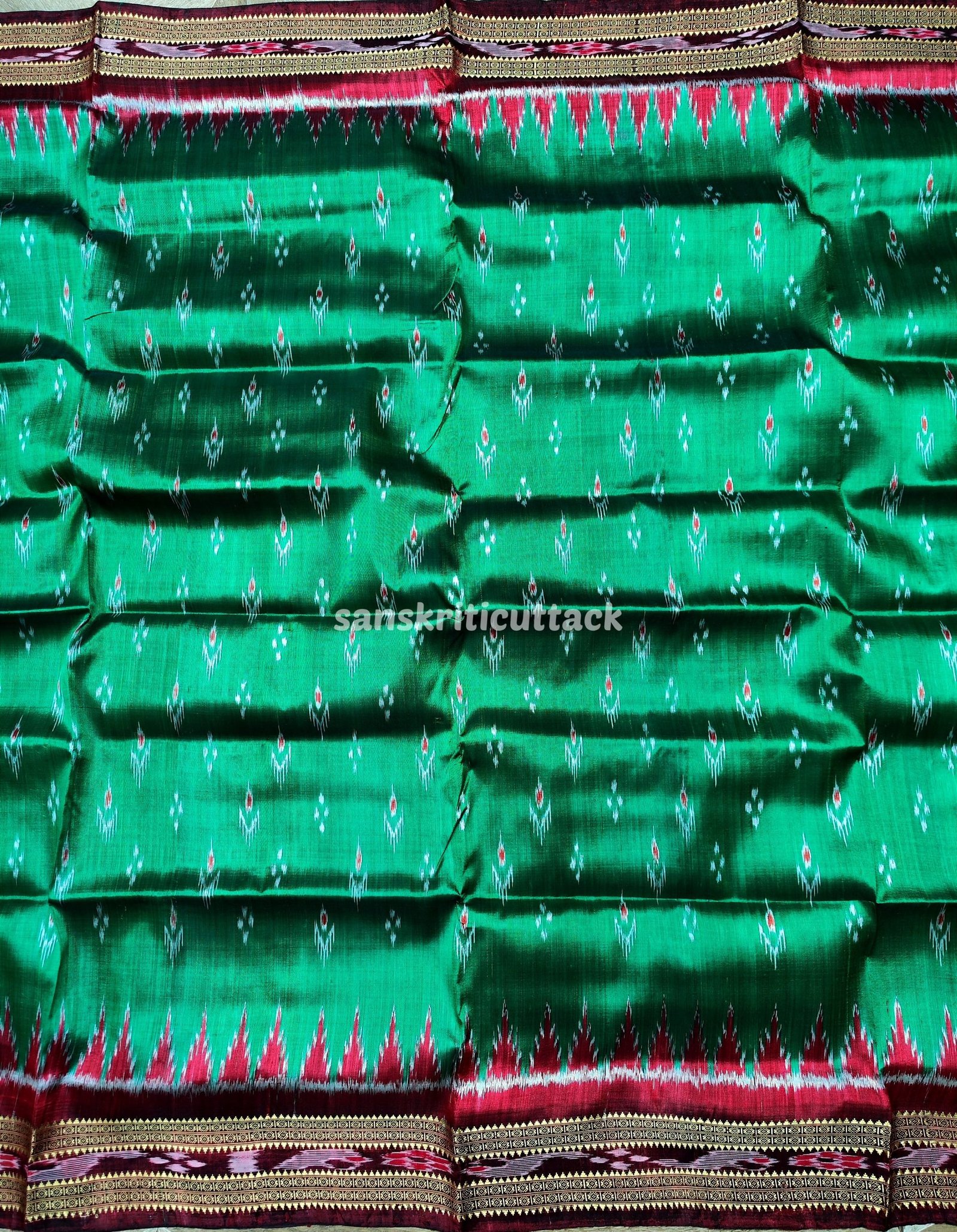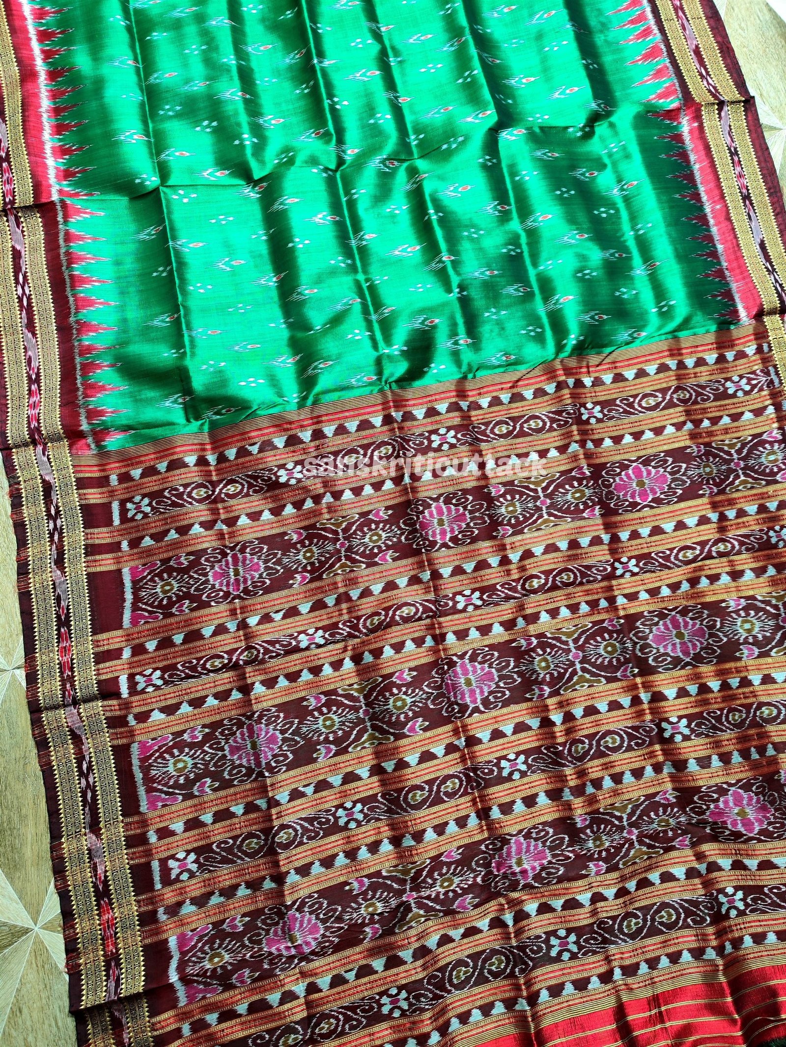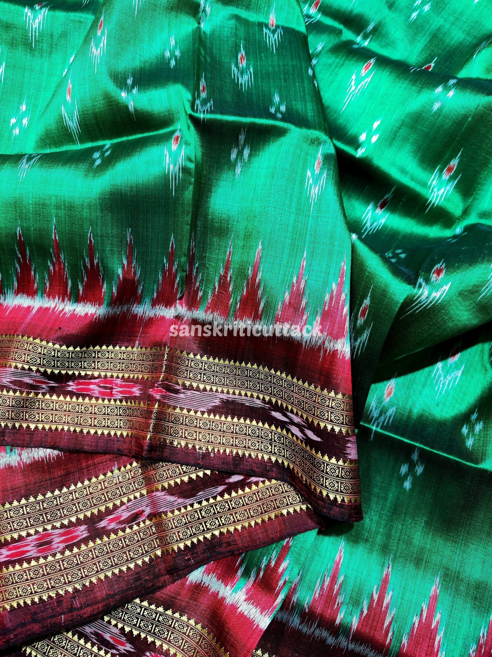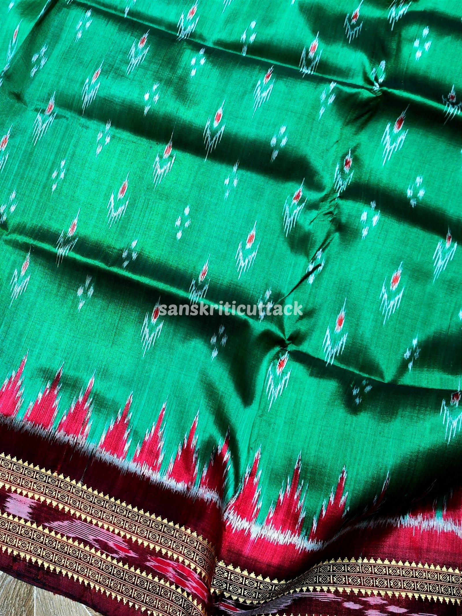 Elevate your style with the mesmerizing beauty of our Green Maroon Mayur Chandrika Handwoven Ikat Silk Khandua Pata Saree. Crafted with precision and love, this saree showcases traditional handloom weaving. The vibrant green and maroon hues blend seamlessly, creating an enchanting color palette that catches the eye. Adorned with intricate Mayur Chandrika motifs, this saree embodies grace. Made from premium silk, it drapes gracefully and exudes a luxurious feel. Perfect for weddings, festivals, or special events, this saree symbolizes Indian heritage and craftsmanship.
