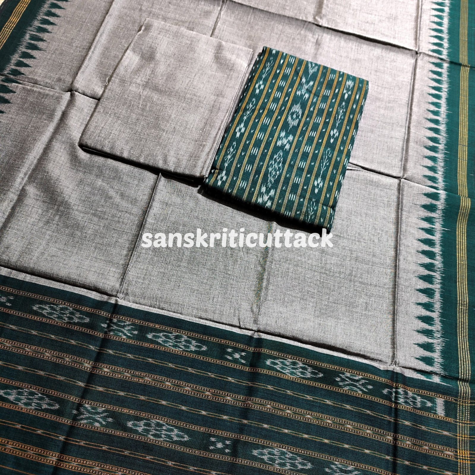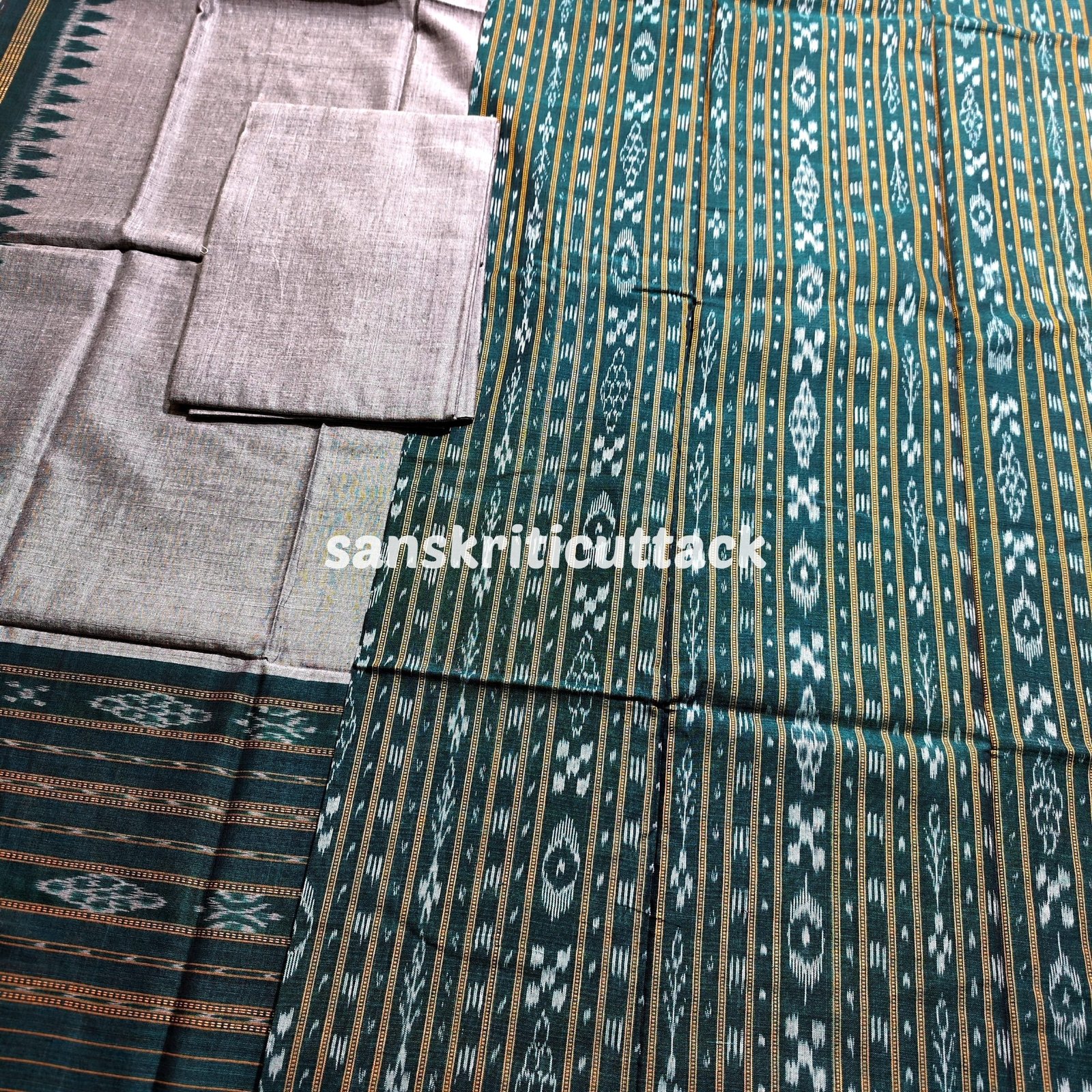 Elevate your style with our Green Sambalpuri Cotton Handloom Ikat Dress Material with Matching Dupatta. Immerse yourself in the allure of traditional handloom craftsmanship and the rich heritage of Sambalpuri artistry. This exquisite dress material set is a true gem, meticulously woven to perfection.