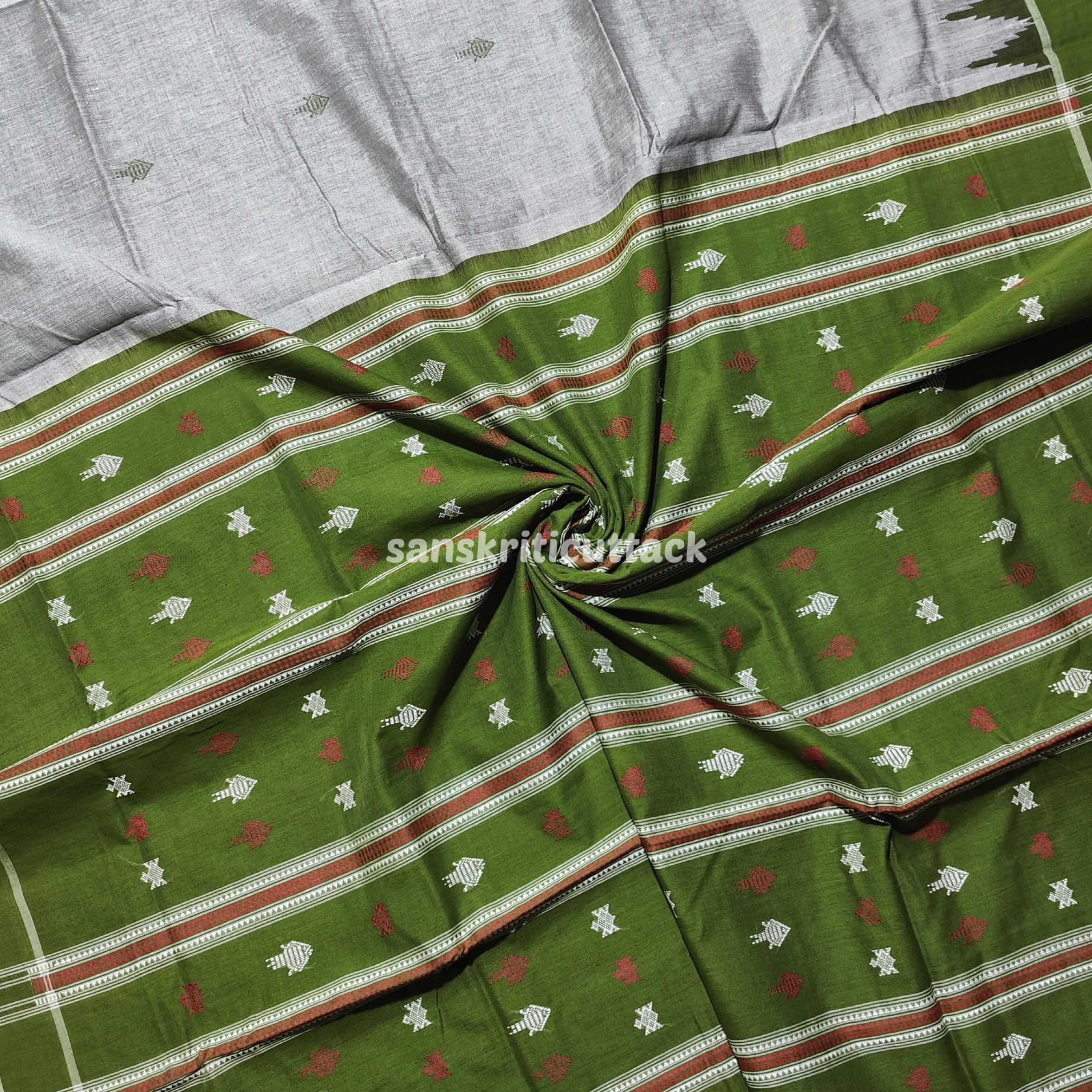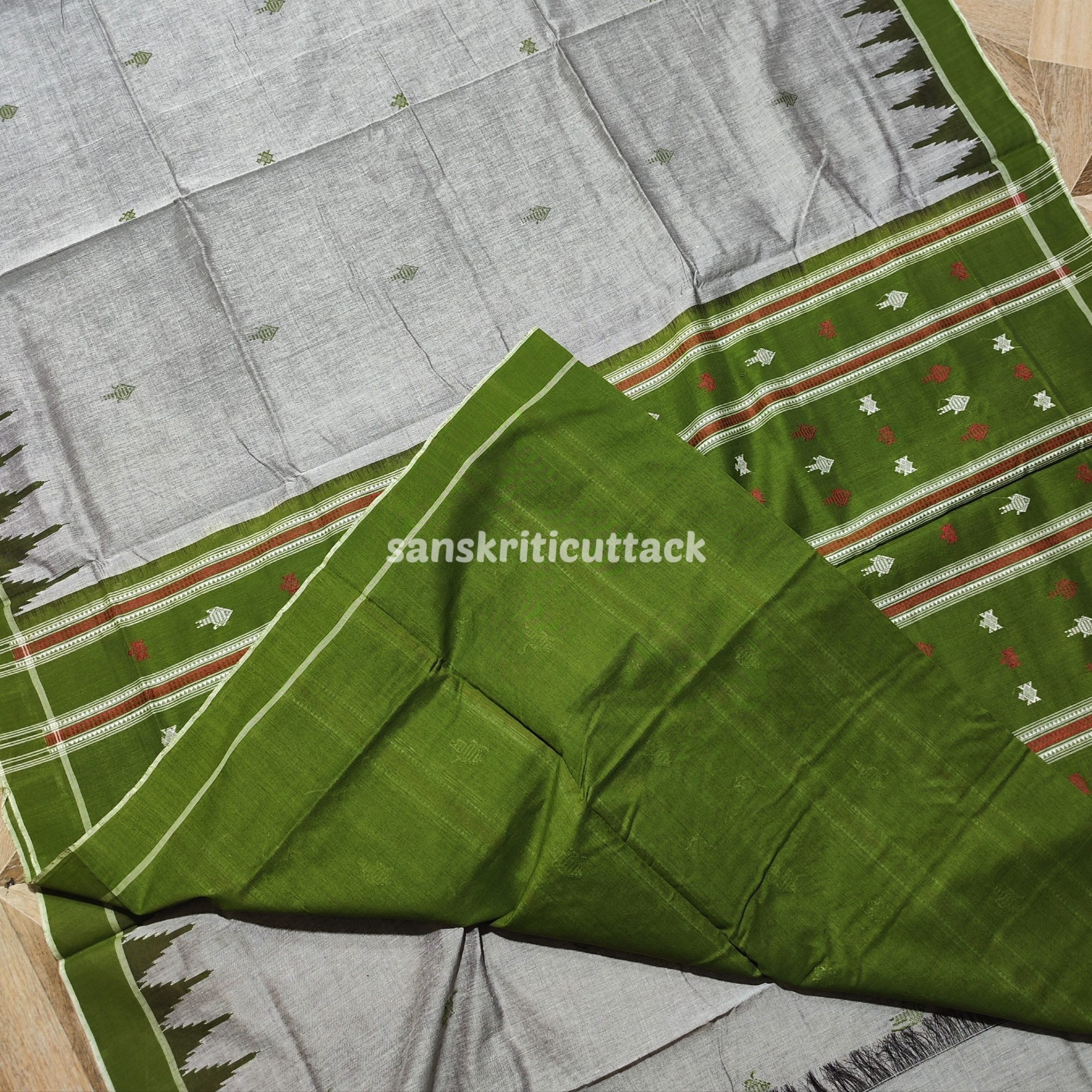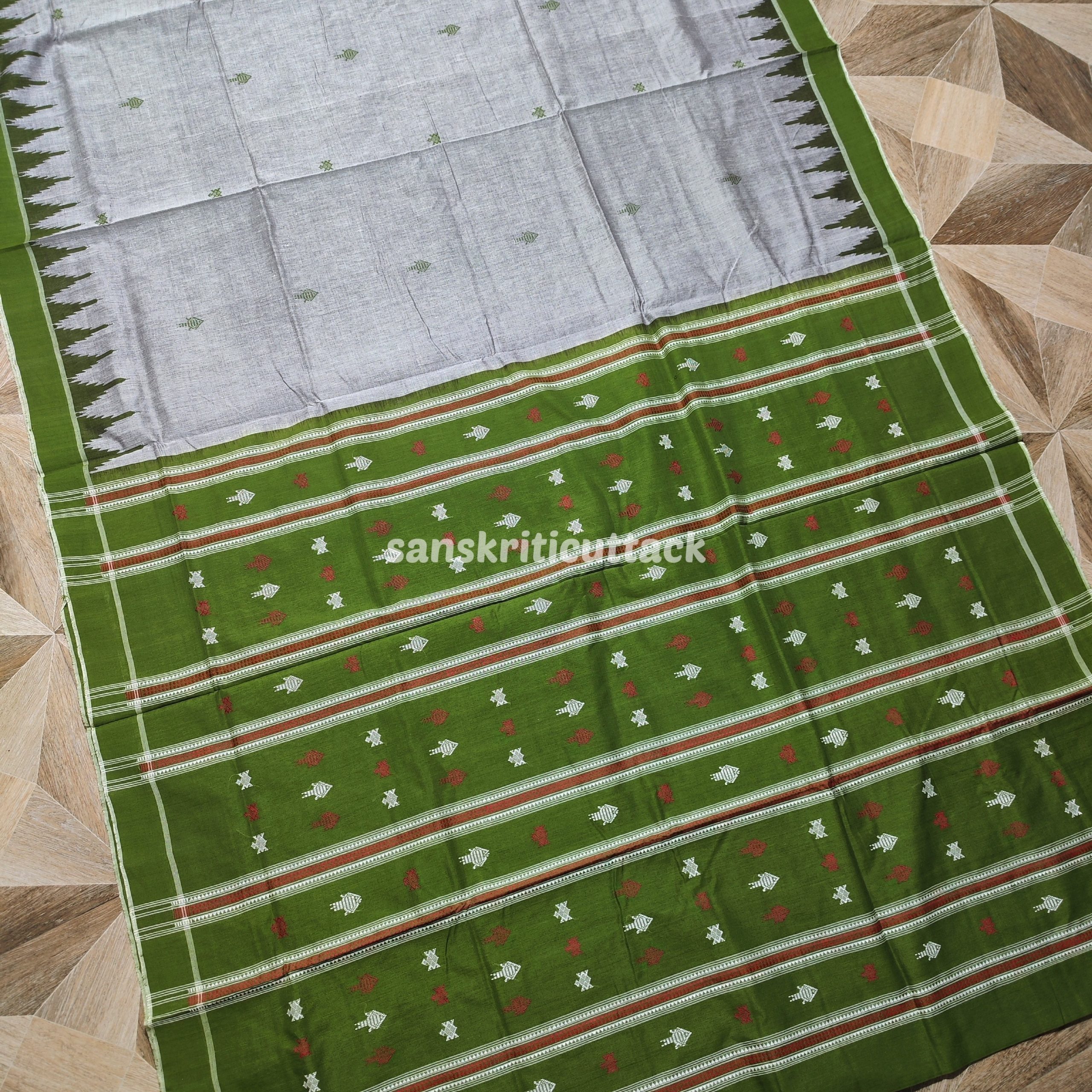 Experience the heritage of Odisha’s handloom artistry with our Grey & Heena Green Kotpad Cotton Saree — a meticulously woven fabric that reflects rich cultural symbolism and artisanal skill. The graceful grey body is adorned with intricate turtle and fish motifs, traditional designs that represent prosperity, peace, and heritage in tribal culture. These motifs aren’t printed — they’re woven into the fabric, showcasing craftsmanship that’s truly authentic.