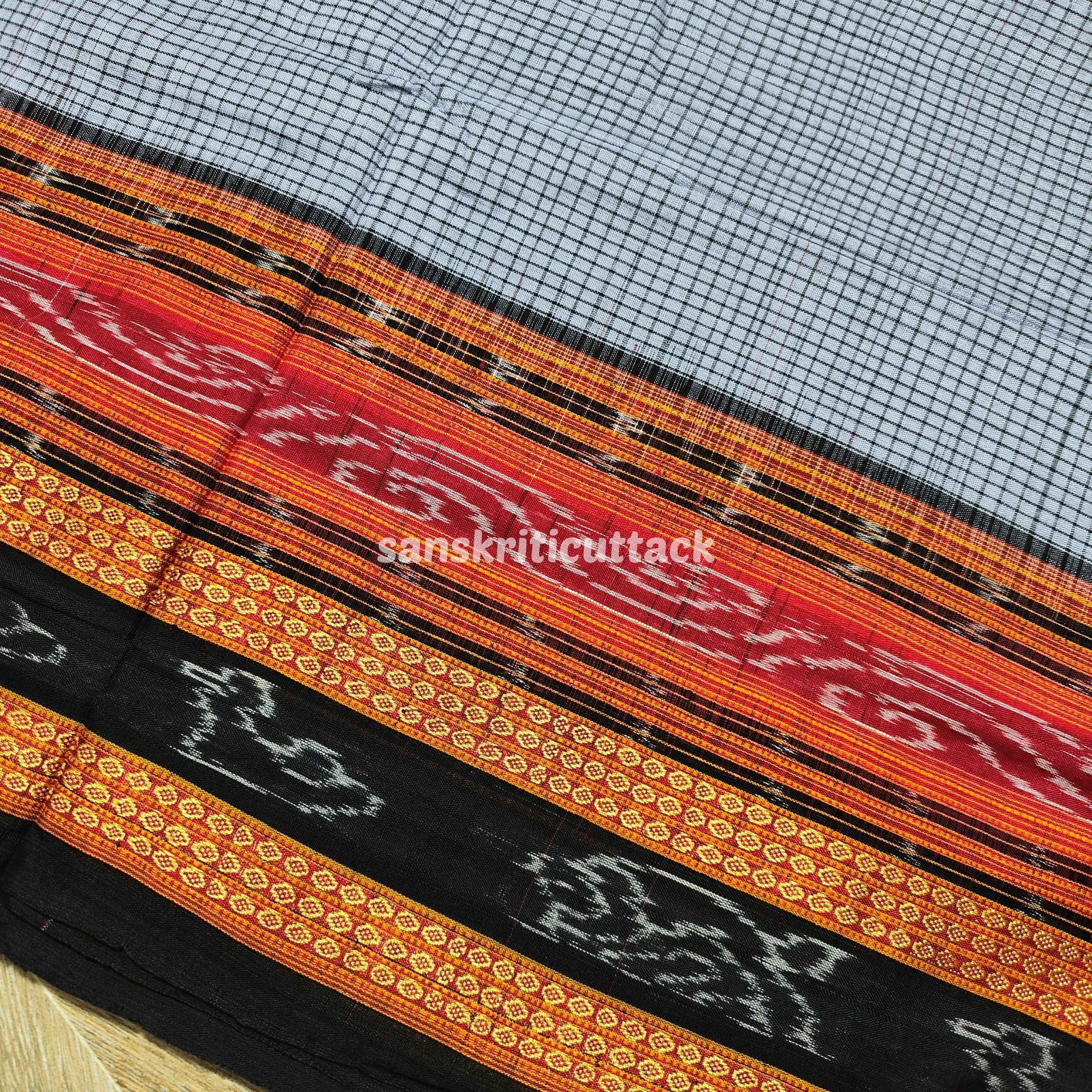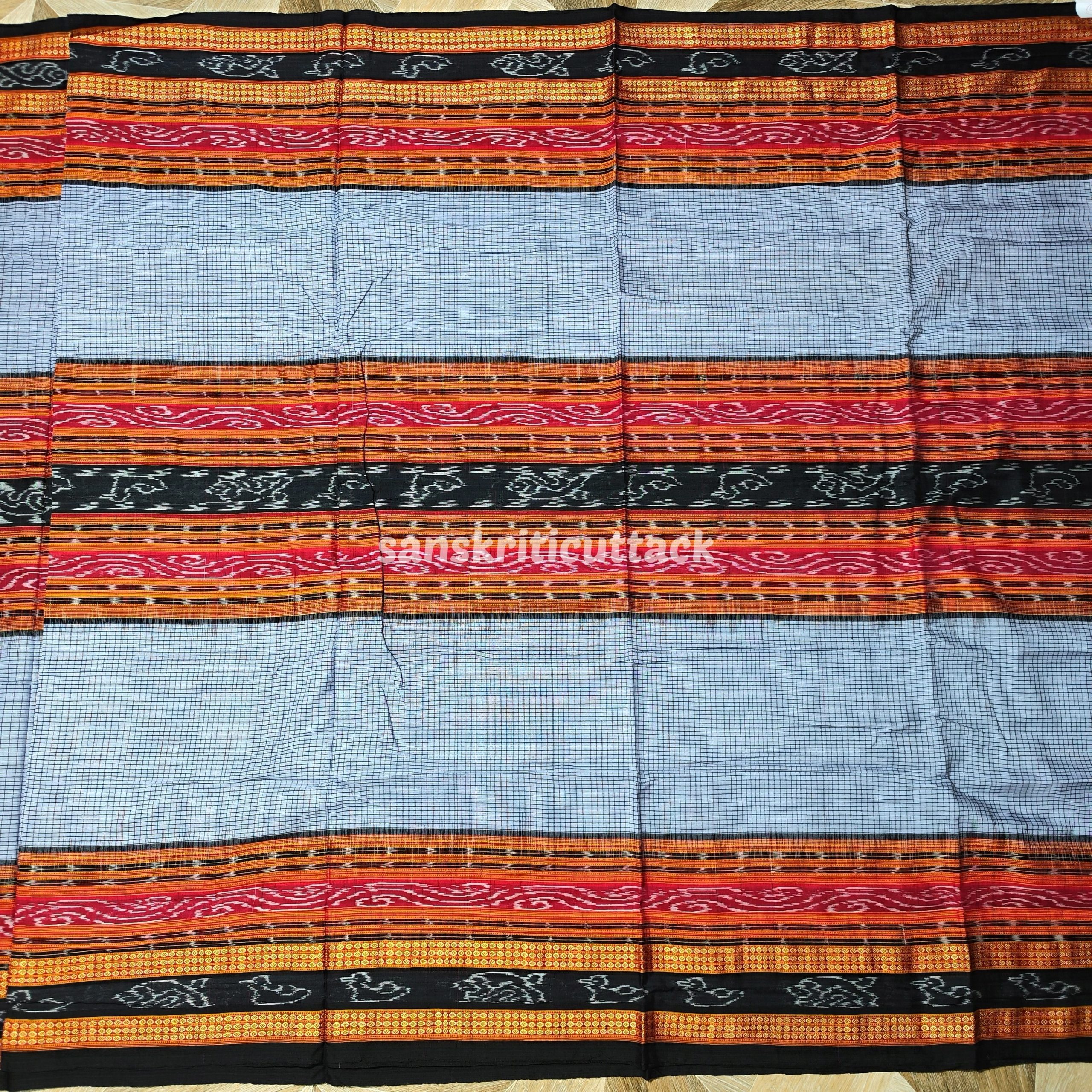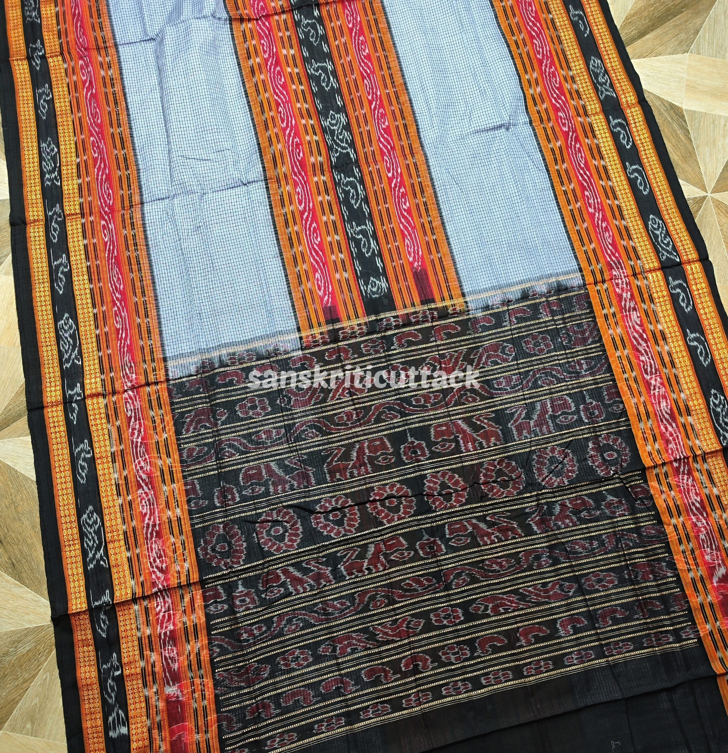 Indulge in the timeless beauty of our Grey Red Black Bichitrapuri Sachipar Cotton Saree without Blouse. Crafted with exquisite craftsmanship and attention to detail, this saree showcases a mesmerizing blend of traditional and contemporary elements. The graceful grey base is adorned with intricate red and black patterns, creating a striking contrast that captivates attention. Made from high-quality cotton fabric, this saree offers comfort and breathability, making it perfect for all-day wear. Whether you’re attending a wedding, festival, or any special occasion, this saree will make you stand out with its elegance and charm. Please note that the blouse shown in the images is for styling purposes only and is not included with the saree.