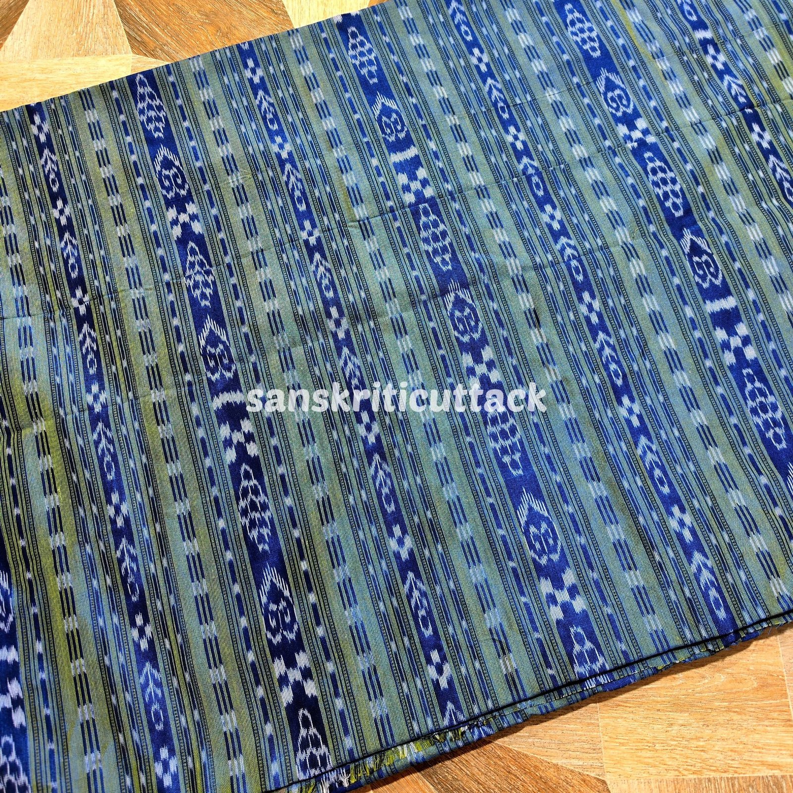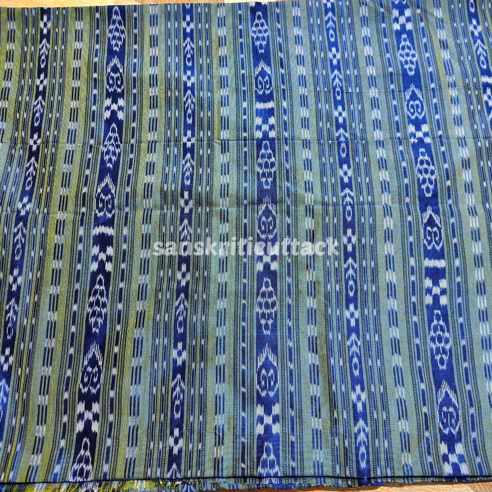Experience the essence of traditional Indian craftsmanship with our Handloom Blue Green Stripes Sambalpuri Cotton Ikat Fabric. This exquisite fabric showcases the artistry of skilled weavers who have meticulously created beautiful patterns using the age-old handloom techniques.