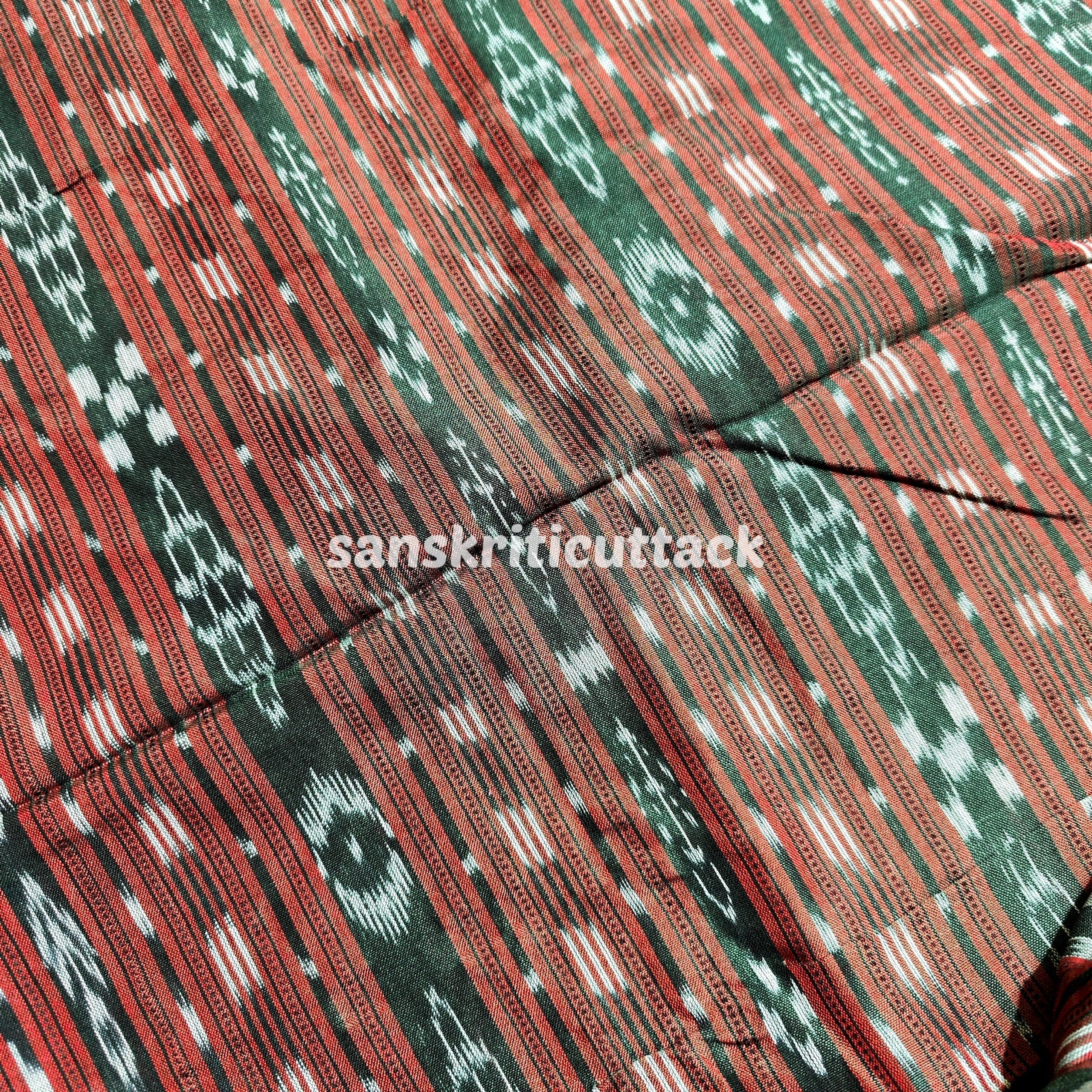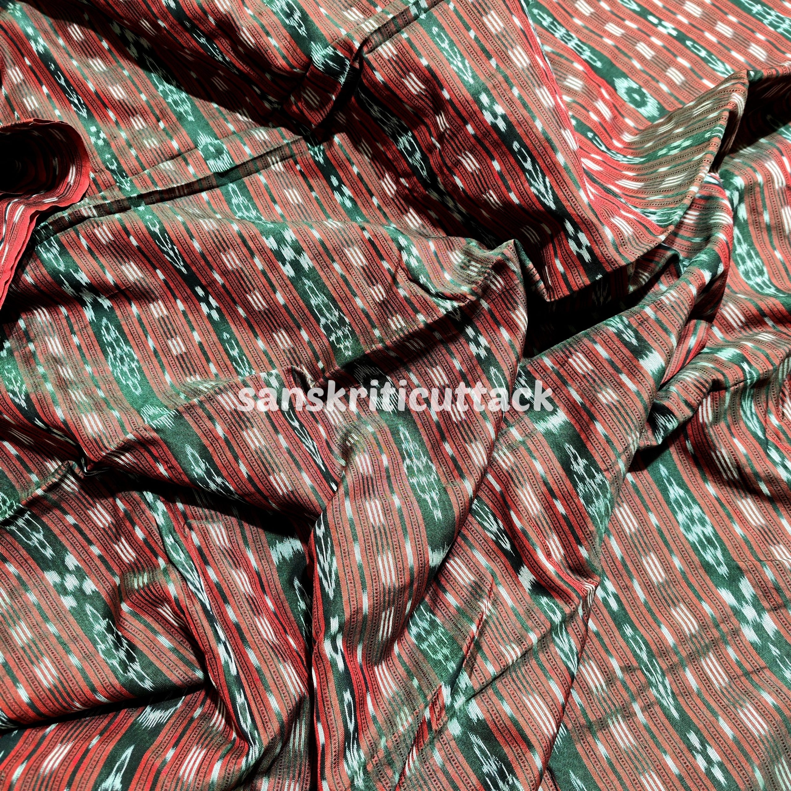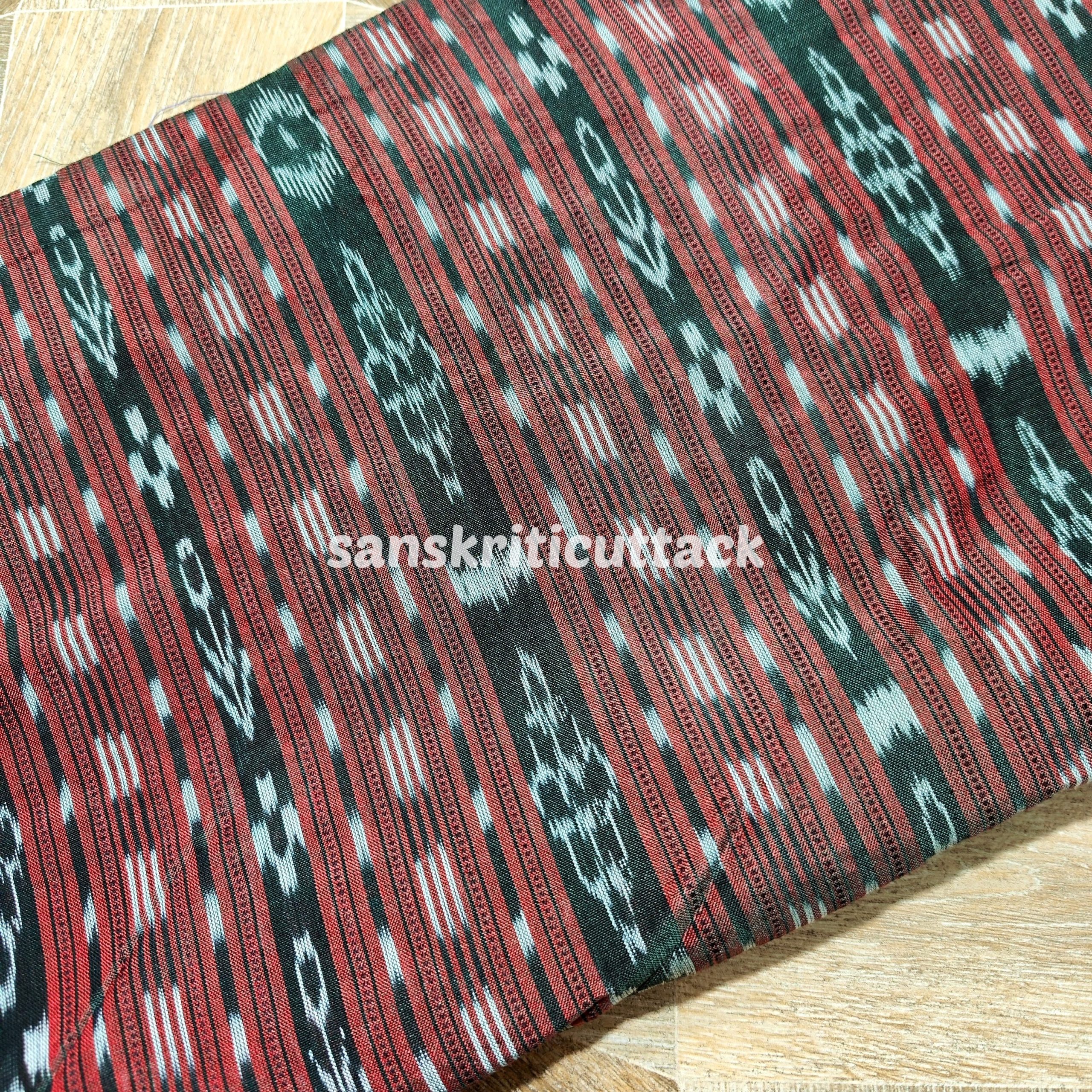 Indulge in the timeless beauty of our Handloom Dual Tone Maroon Stripes Sambalpuri Cotton Ikat Fabric. Crafted with precision and care, this fabric exudes elegance and sophistication. The intricate dual-tone maroon stripes on a soft cotton base create a captivating visual appeal that is sure to make heads turn.