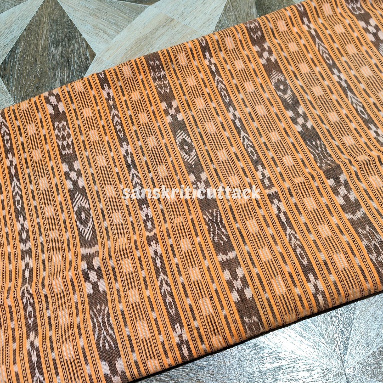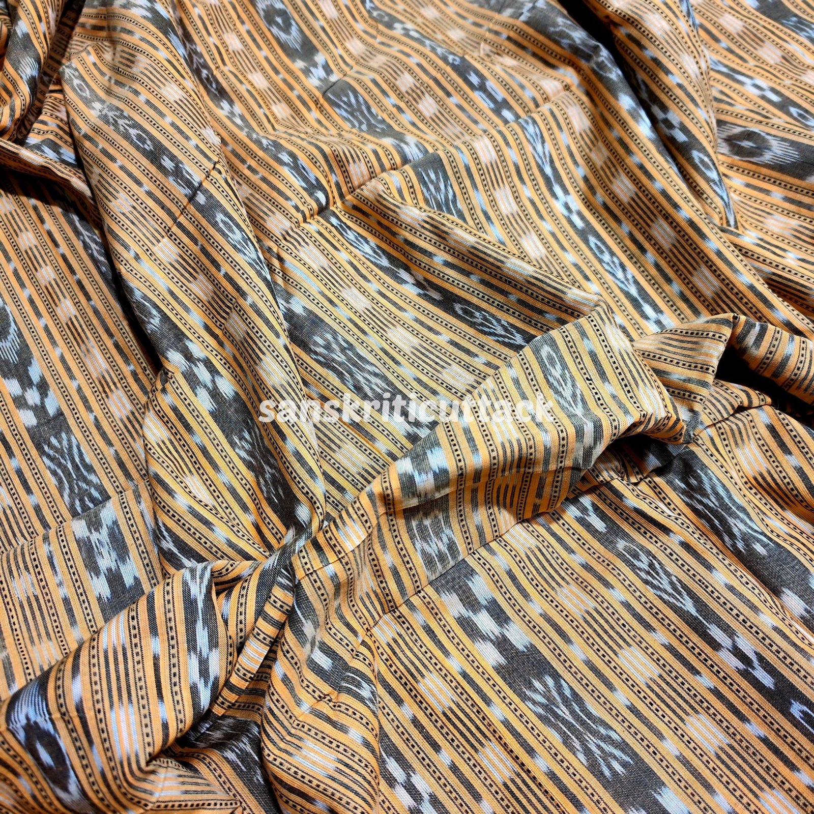 Handloom Peach Orange Stripes Sambalpuri Cotton Ikat Fabric