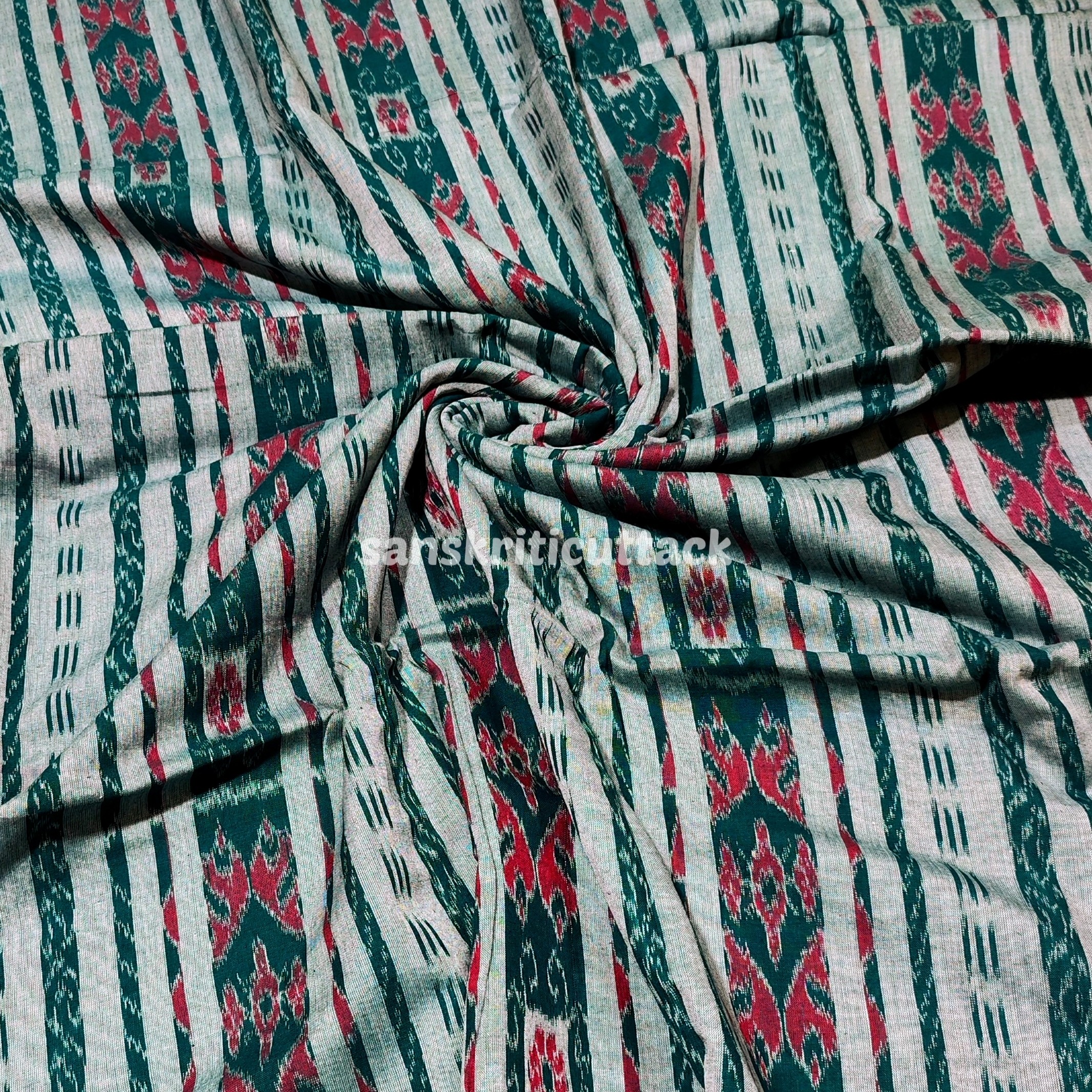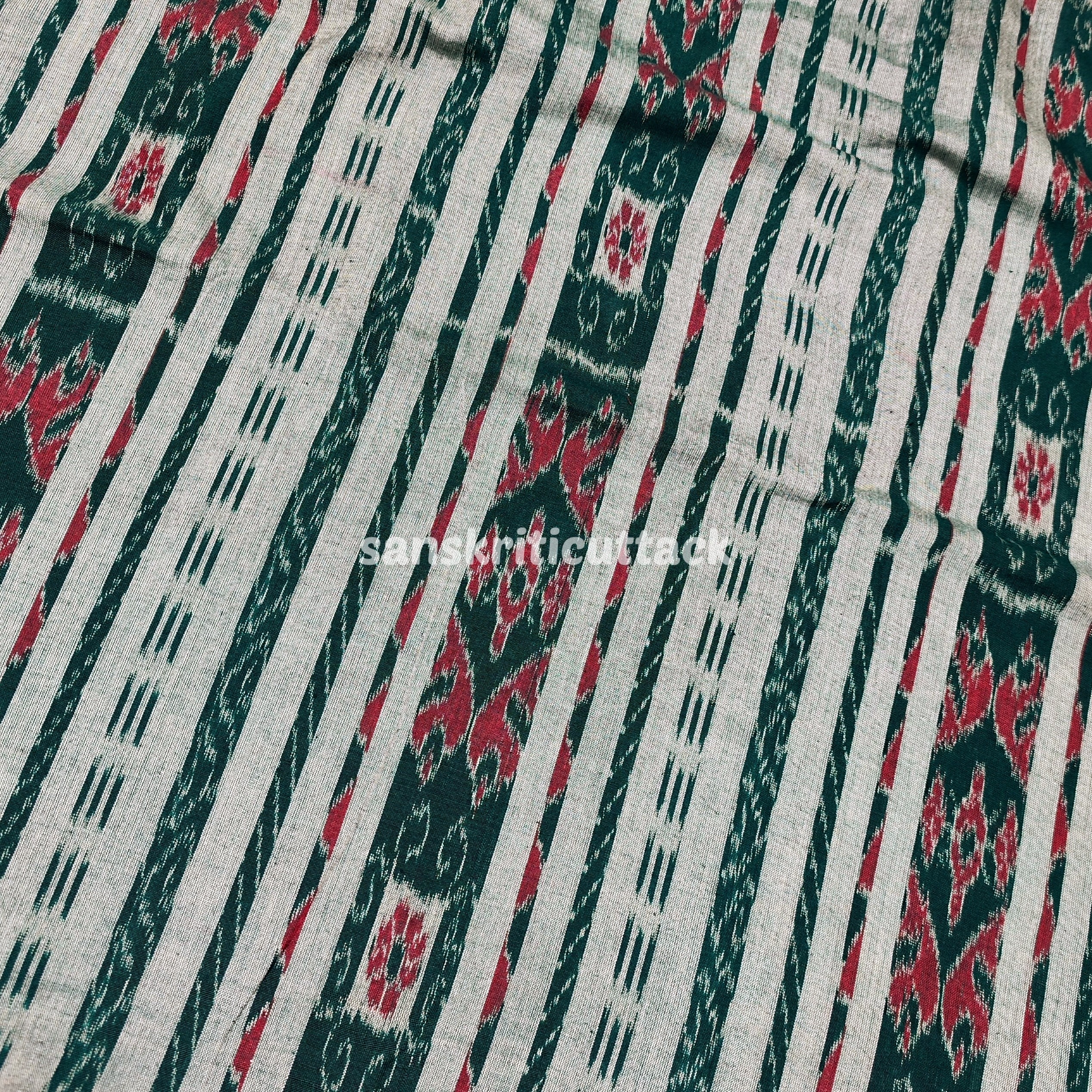 Elevate your fashion creations with our Handloom Sambalpuri Green Cotton Ikat Fabric. Meticulously crafted using traditional techniques, this fabric showcases the rich heritage of the renowned Sambalpuri handloom artistry. Made from premium quality cotton, it offers a soft and breathable texture, perfect for creating comfortable and stylish garments. The vibrant green hue adds a touch of freshness and versatility to your designs, making it ideal for both casual and formal wear. Whether you’re a passionate designer or a craft enthusiast, this fabric is sure to inspire your creativity. Experience the beauty and elegance of authentic handloom art with our exquisite Sambalpuri Ikat fabric.