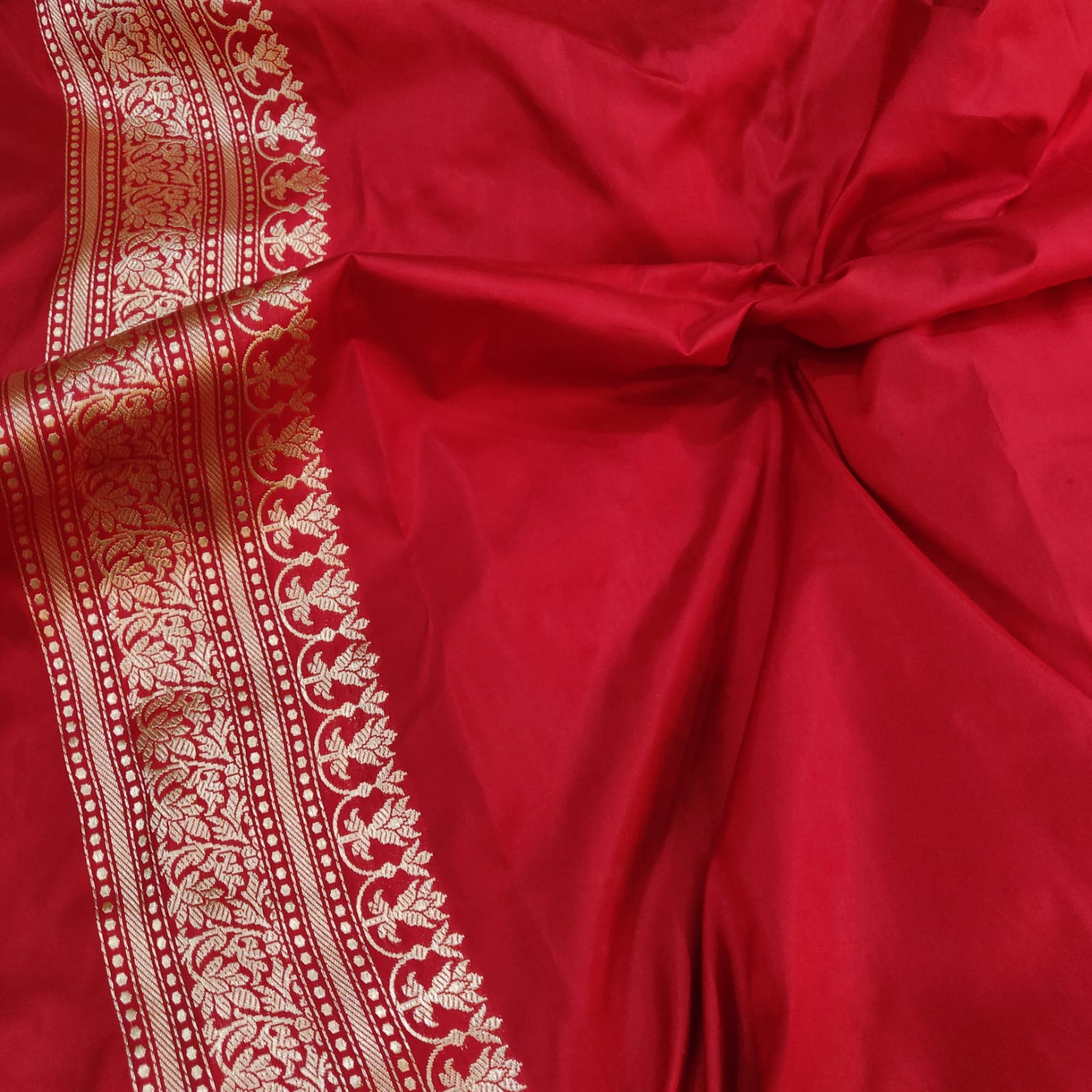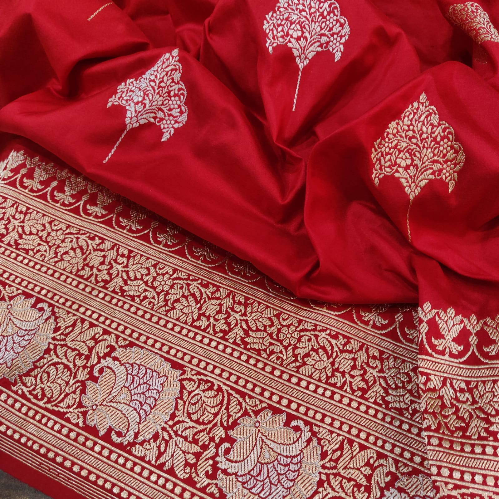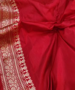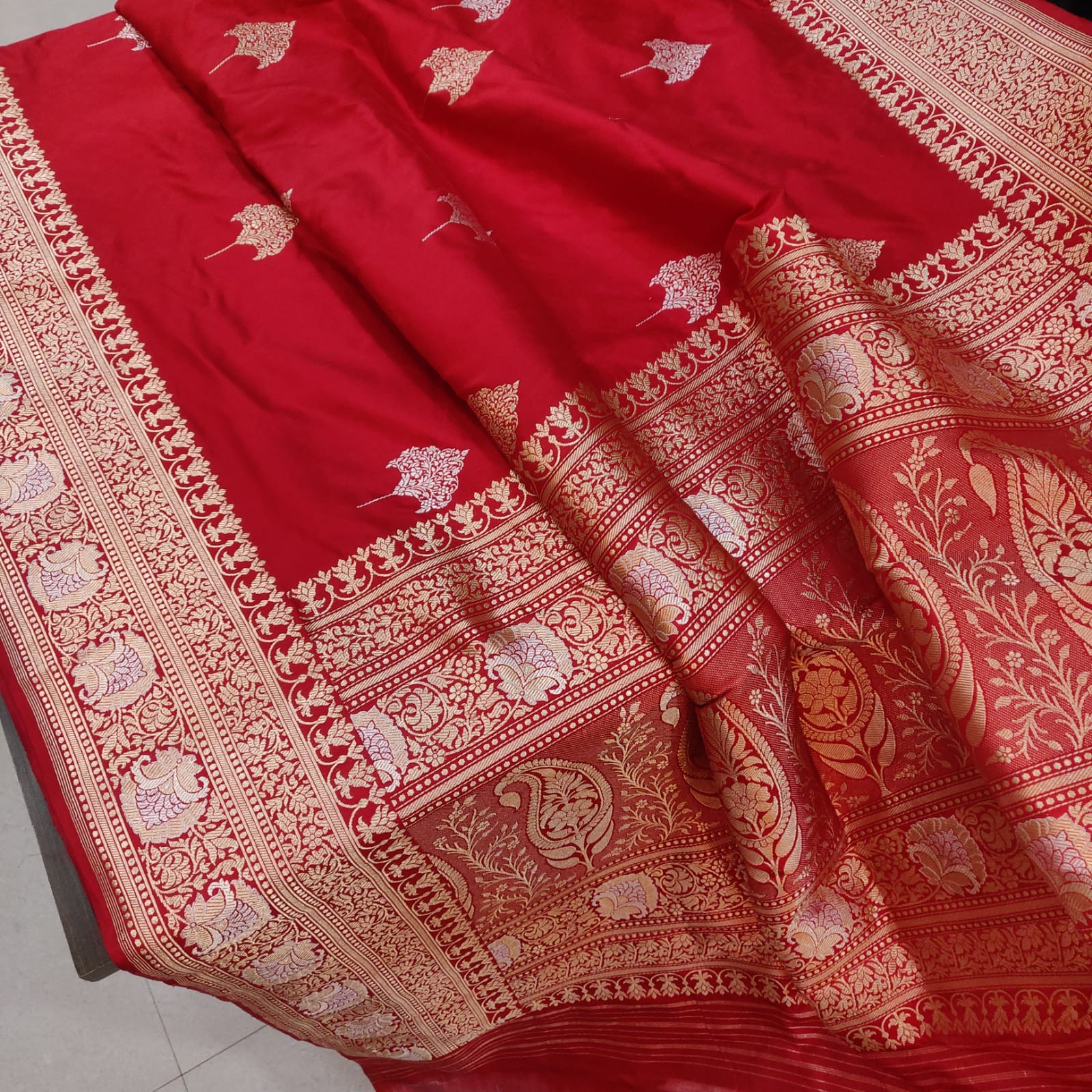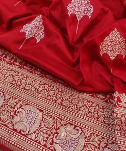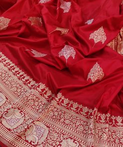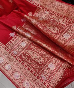 Discover opulence in our handwoven red katan silk Banarasi saree. Intricately crafted through kadwa weaving, it boasts a symphony of silver and gold zari bootas that exude royal charm and enrich its texture. The lavish designer alfi border and paisley pallu, woven with silver and gold zari, magnify the saree’s allure, transforming it into a true statement of elegance.