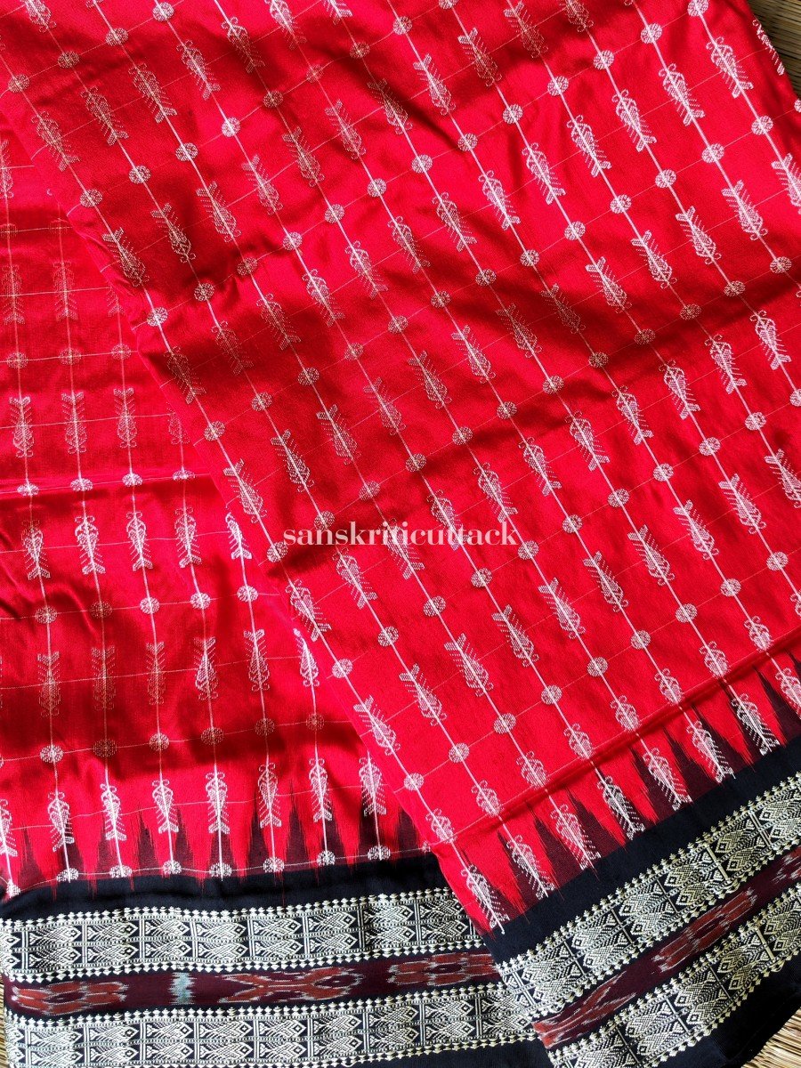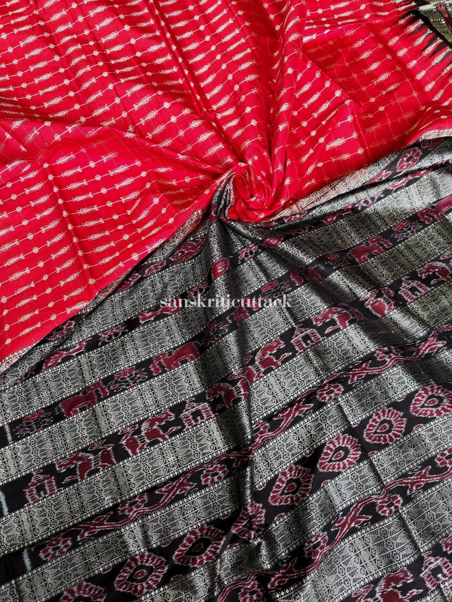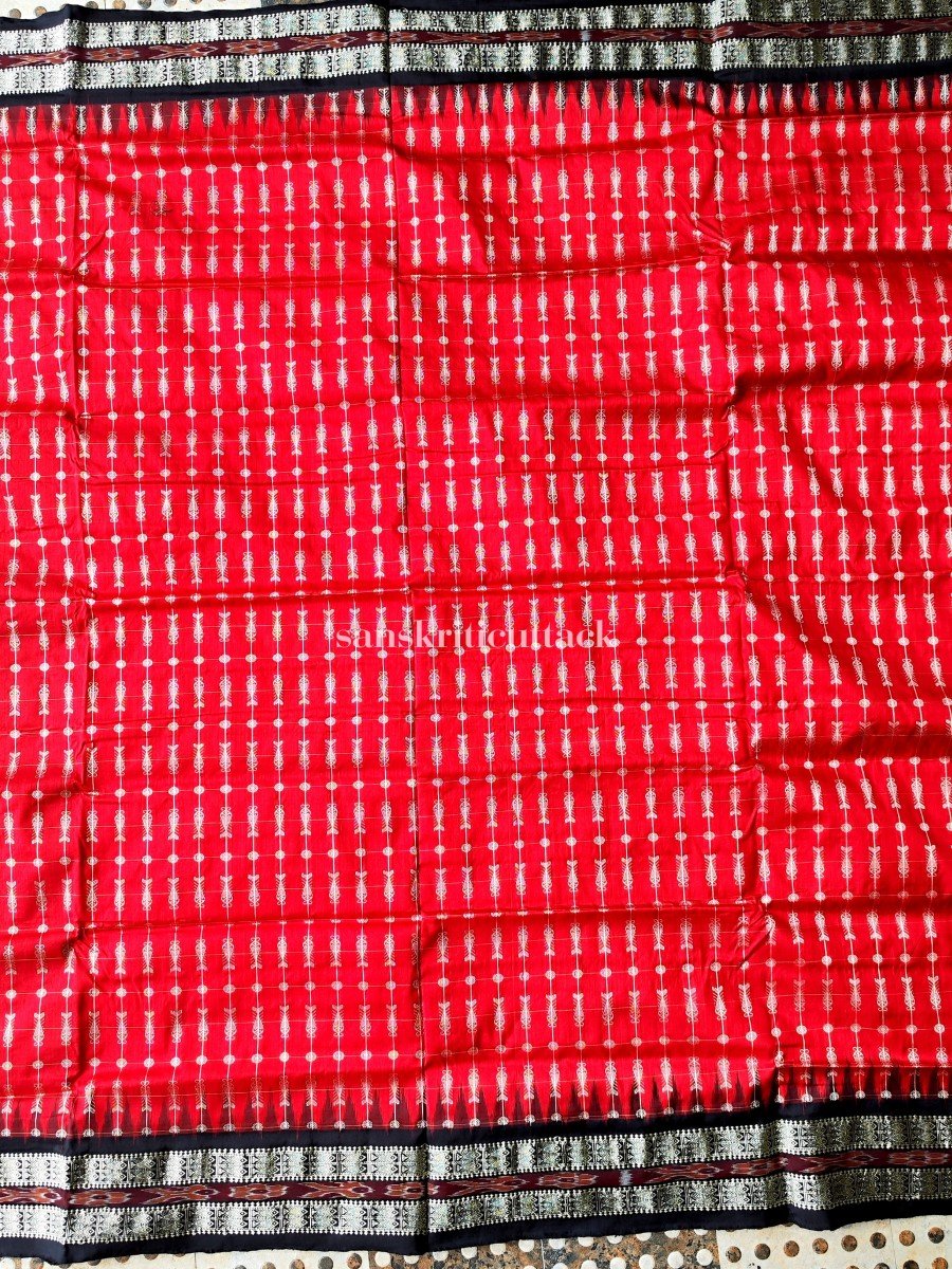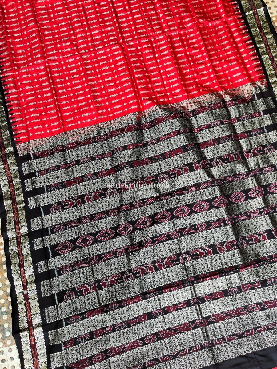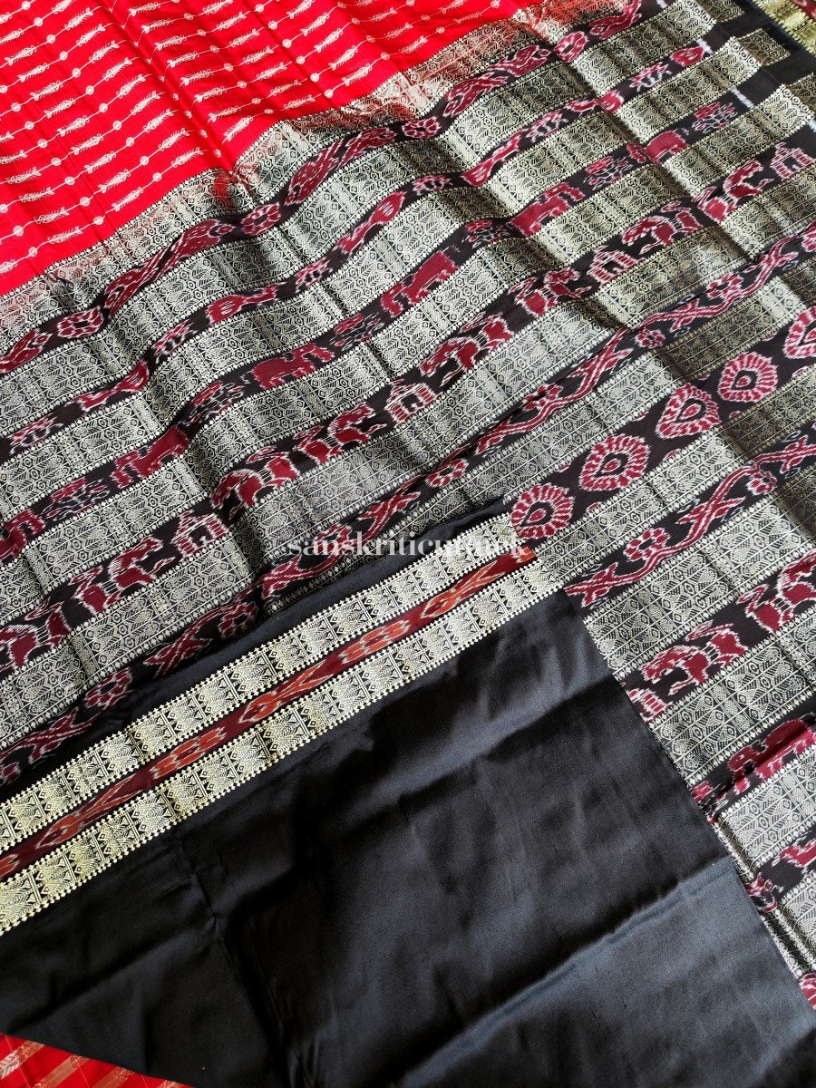 The border of the saree is adorned with traditional temple motifs, adding to the beauty of the craftsmanship. The combination of red and black colors creates a stunning and mesmerizing effect that is sure to impress.