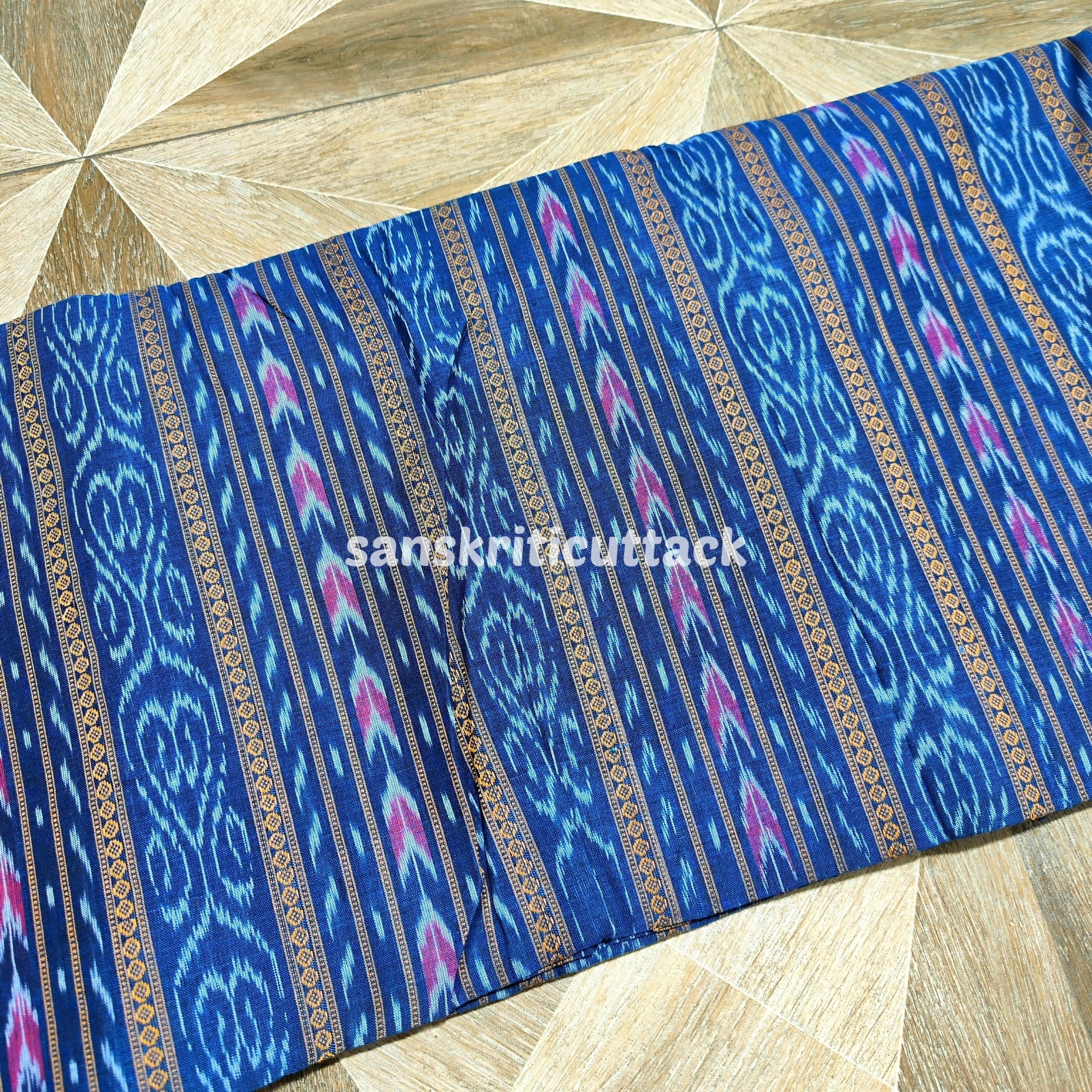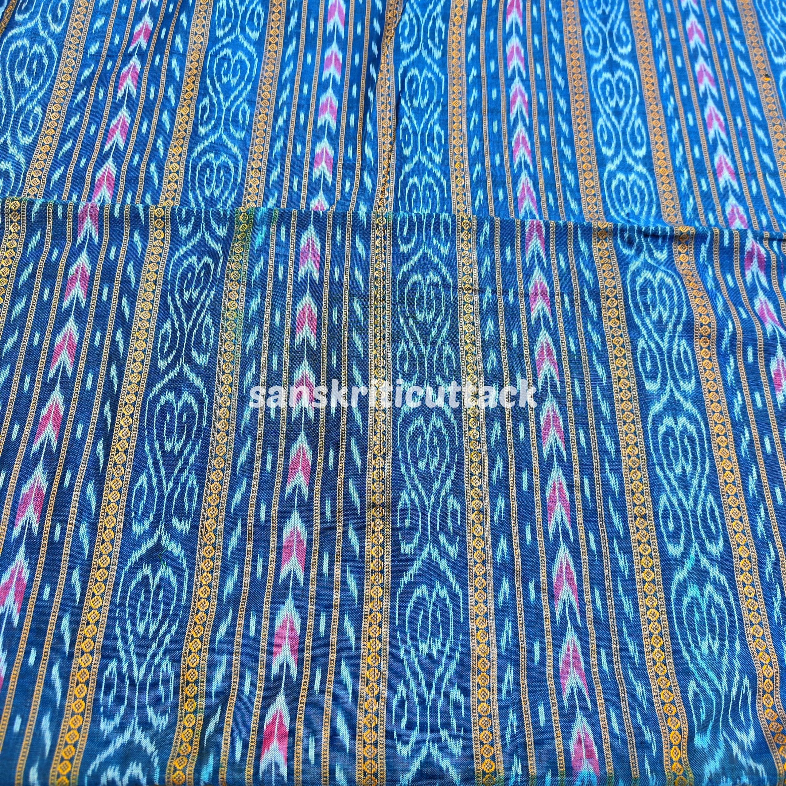 Indigo Handloom Cotton Sambalpuri Ikat Fabric is a stunning piece of handwoven textile art featuring the traditional Sambalpuri Ikat Pattern. Handwoven with the Ikat technique, this cotton fabric showcases joyful colours that are sure to brighten up any wardrobe. Ikat (Ikkat) is a resist dyeing process similar to tie-dye, creating world-famous patterns that are renowned for their beauty, texture, and designs. With its rich cultural heritage and exquisite craftsmanship, Sambalpuri fabric is a must-have for any textile enthusiast. Elevate your style with this exquisite Ikat fabric today!This handloom cotton Sambalpuri Ikat fabric is a masterpiece created by skilled artisans who have been practicing the traditional Ikat weave for generations. The fabric is made using natural dyes, making it eco-friendly and sustainable. The intricate Ikat pattern is created using a resist dyeing technique, which involves tying and dyeing the threads before weaving them into the fabric. The fabric is lightweight, soft, and breathable, making it perfect for clothing. The vibrant indigo color and unique Ikat print make it a great choice for creating ethnic wear and other fashionable items. Our artisanal Ikat fabric is a symbol of the rich cultural heritage of India and its skilled artisans. Each piece is made with care and attention to detail, ensuring that you receive a high-quality and durable fabric. With its unique Ikat design and sustainable production process, this fabric is perfect for anyone looking for a colorful and eco-friendly addition to their wardrobe or textile collection.