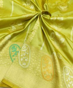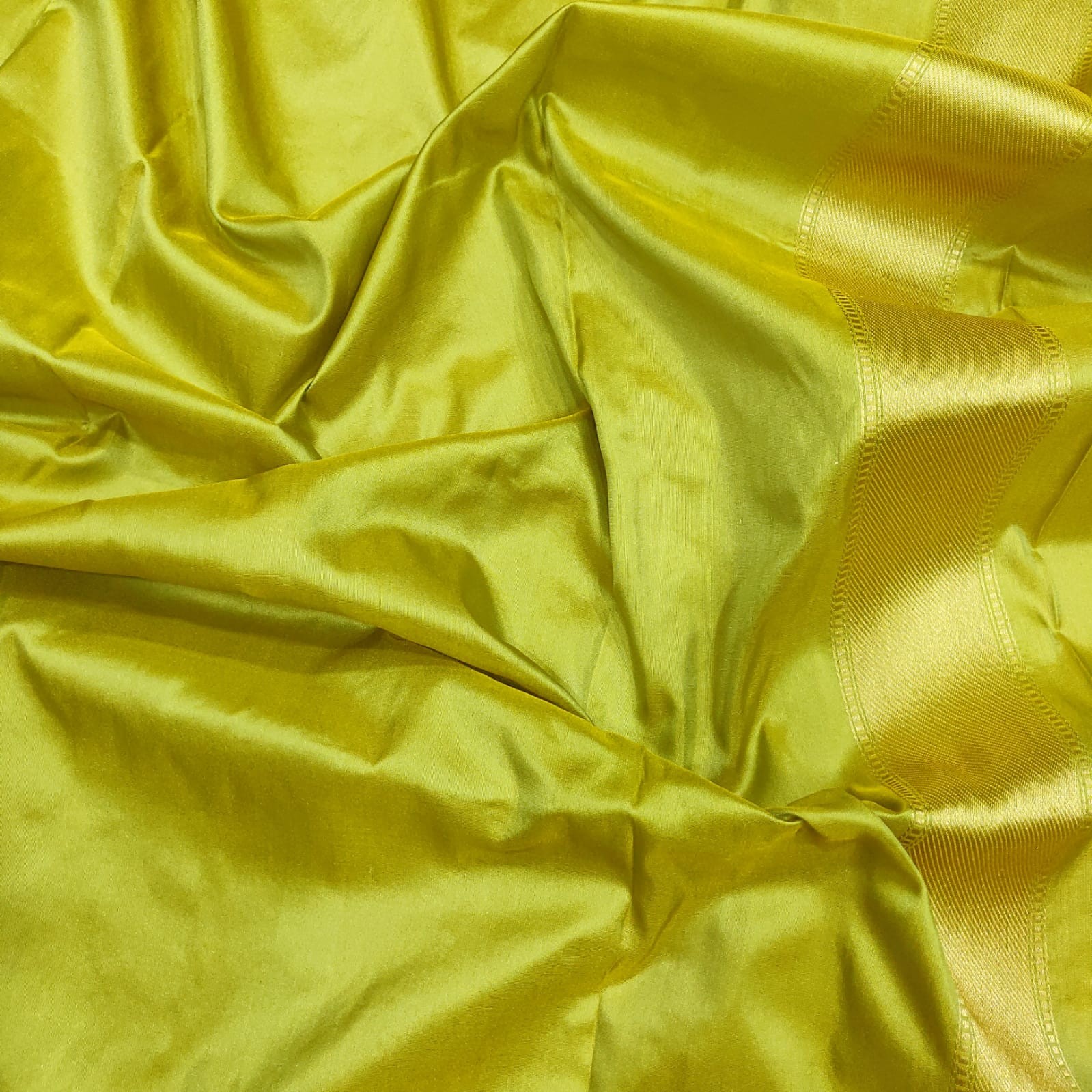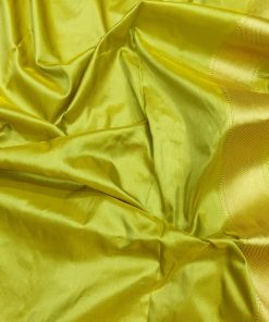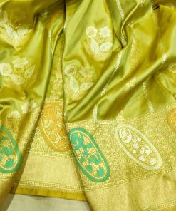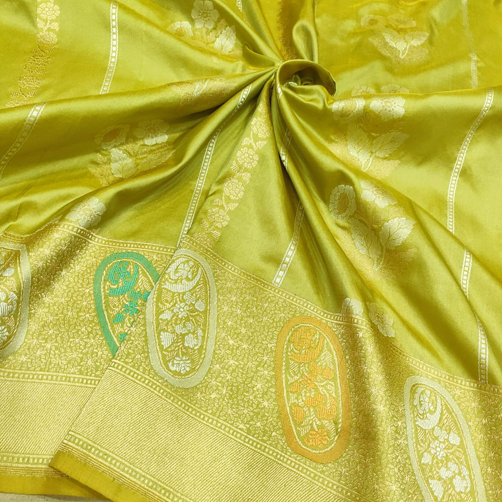 Introducing our latest collection, the Lime Green Banarasi Katan Silk Saree with Silver and Gold Zari Bootas and Stripes. This saree is a true masterpiece, crafted with utmost care and precision by our skilled artisans. The lime green color adds a refreshing touch to the saree, making it perfect for any occasion.