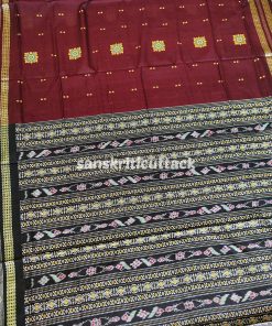 Embrace classic elegance with our Maroon Black Bomkai Cotton Saree. Meticulously handwoven, this saree showcases intricate maroon patterns on a black canvas, while the stunning black pallu and border add a touch of sophistication. The lightweight and breathable cotton fabric ensures comfort throughout the day. Whether it’s a formal event or a casual gathering, this saree is a versatile choice. Please note, this saree comes without a blouse piece, allowing you to pair it with your favorite blouse for a personalized look. Elevate your style and make a statement with this exquisite piece that seamlessly blends tradition with modernity.