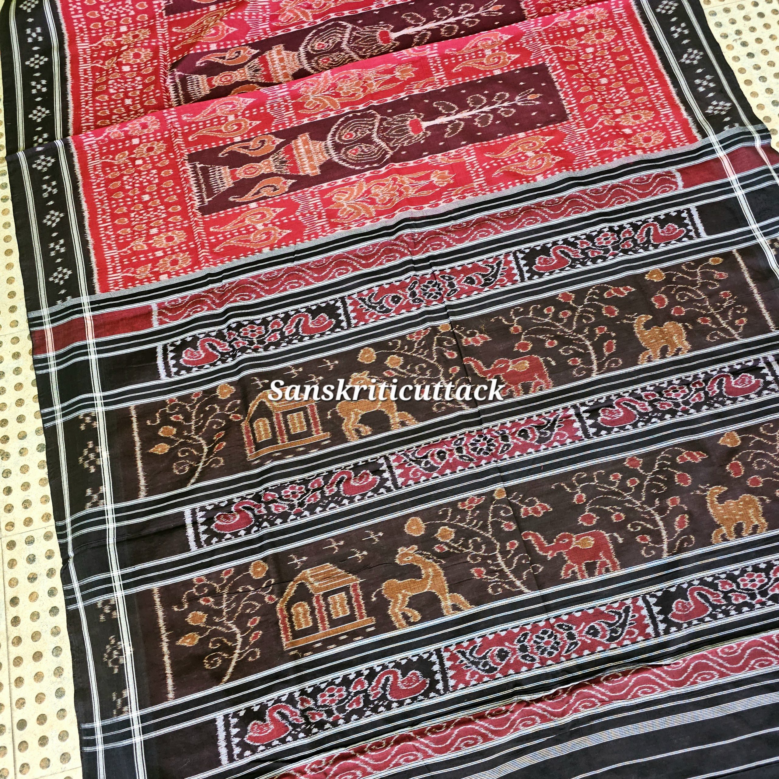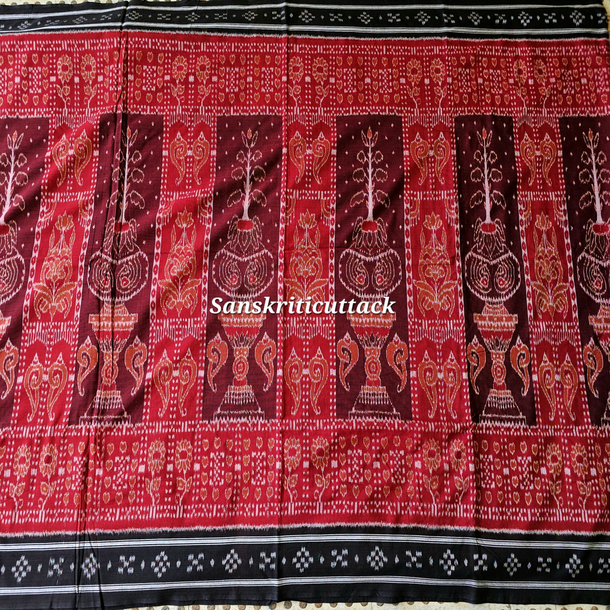 Draped in a rich maroon body adorned with delicately woven ikat motifs — including conch shells, floral vases, and blossoms — this saree is a celebration of soulful design and cultural devotion. The deep black border, detailed with refined pasapali (checkerboard) motifs, gracefully complements the elegant pallu, highlighting the artisanal precision synonymous with Odisha’s ikat heritage.