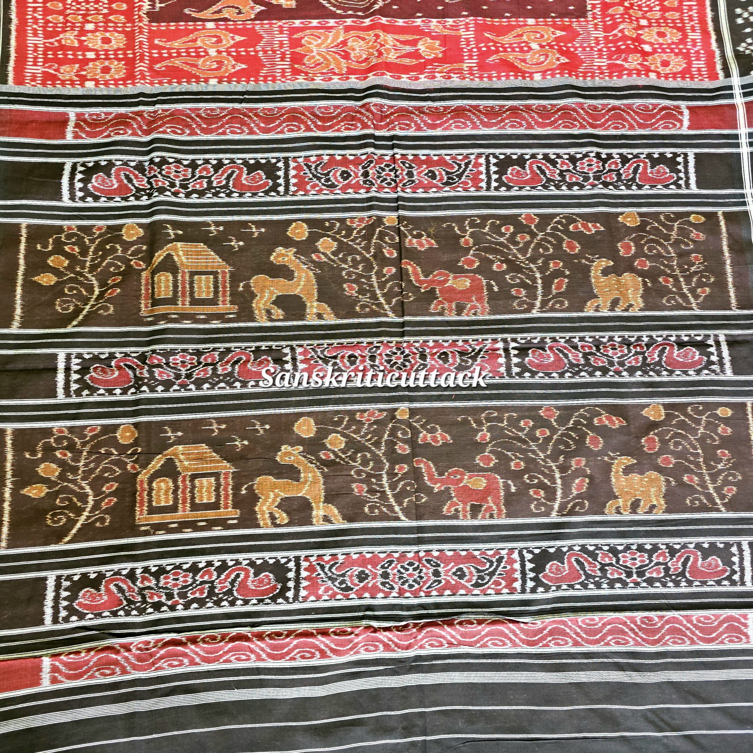Immerse yourself in the timeless artistry of Odisha with this Maroon Black Nuapatna Ikat Cotton Saree by Sanskriti Cuttack, an exquisite handloom creation woven in the historic weaving village of Nuapatna, Cuttack District. Known for its serene villages of master weavers and the sacred Bandha Ikat technique, Nuapatna saris carry centuries of tradition in every thread.