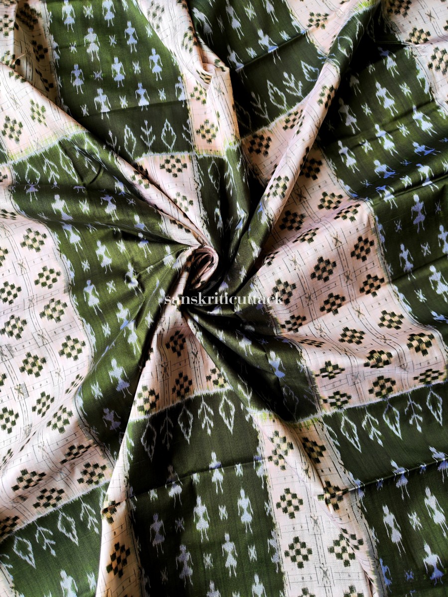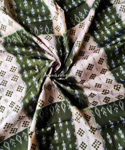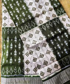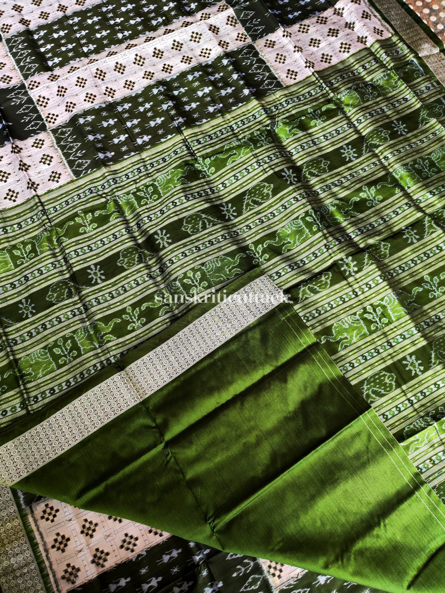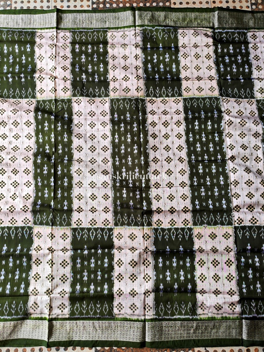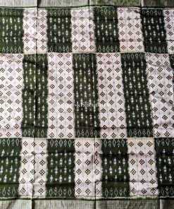 Indulge in the allure of our Off White Olive Silk Sambalpuri Pasapalli Saree, a true masterpiece that embodies the essence of tradition and artistic finesse. The pristine white and olive-hued body adorned with tribal dancers, pasapalli, and floral motifs captivates the eye, while the olive border, pallu, and blouse add a touch of contemporary charm.