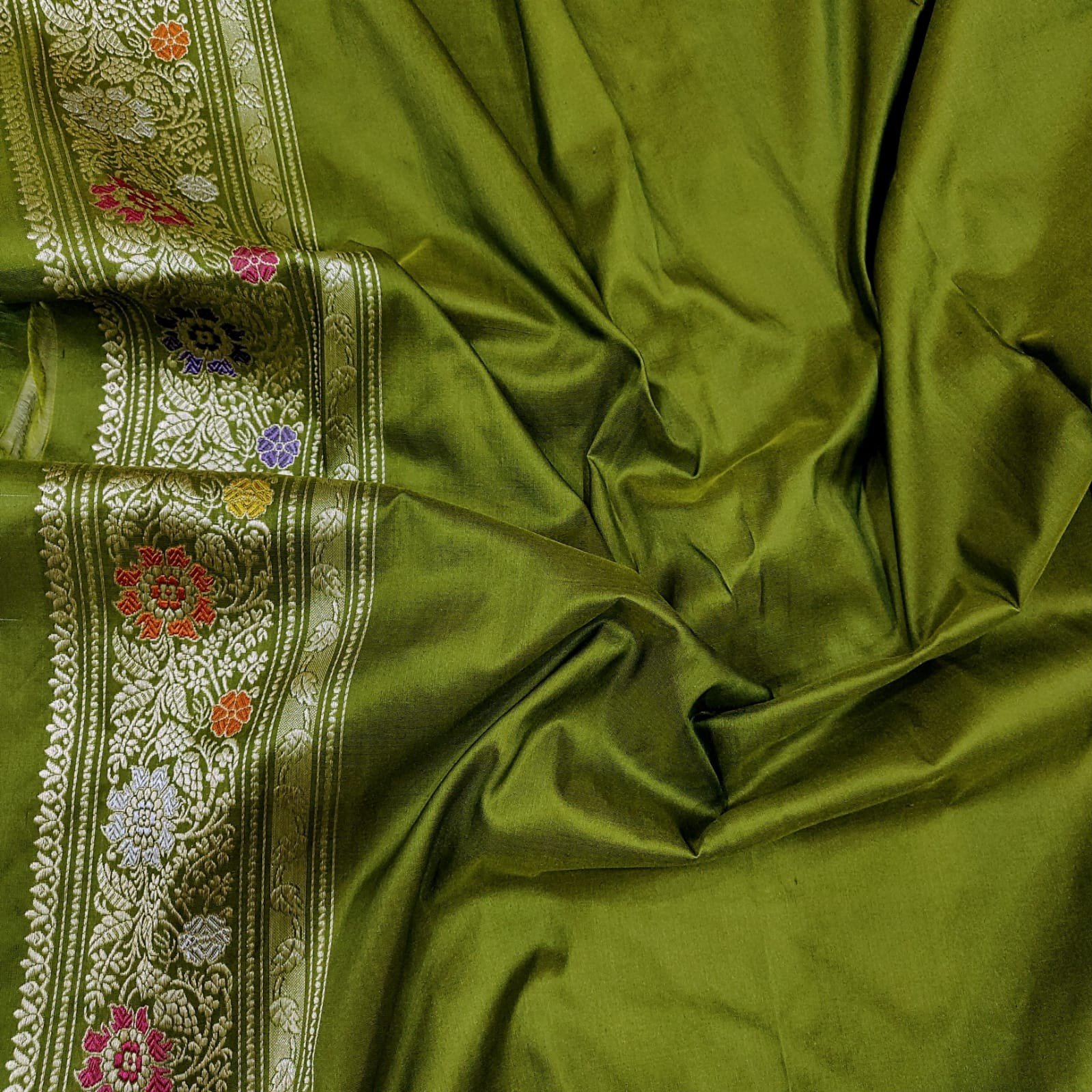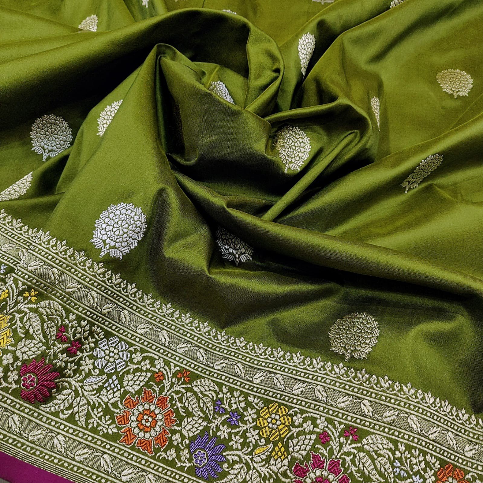 Olive Banarasi Katan Silk Saree with Multicolor Resham Meenakari Border