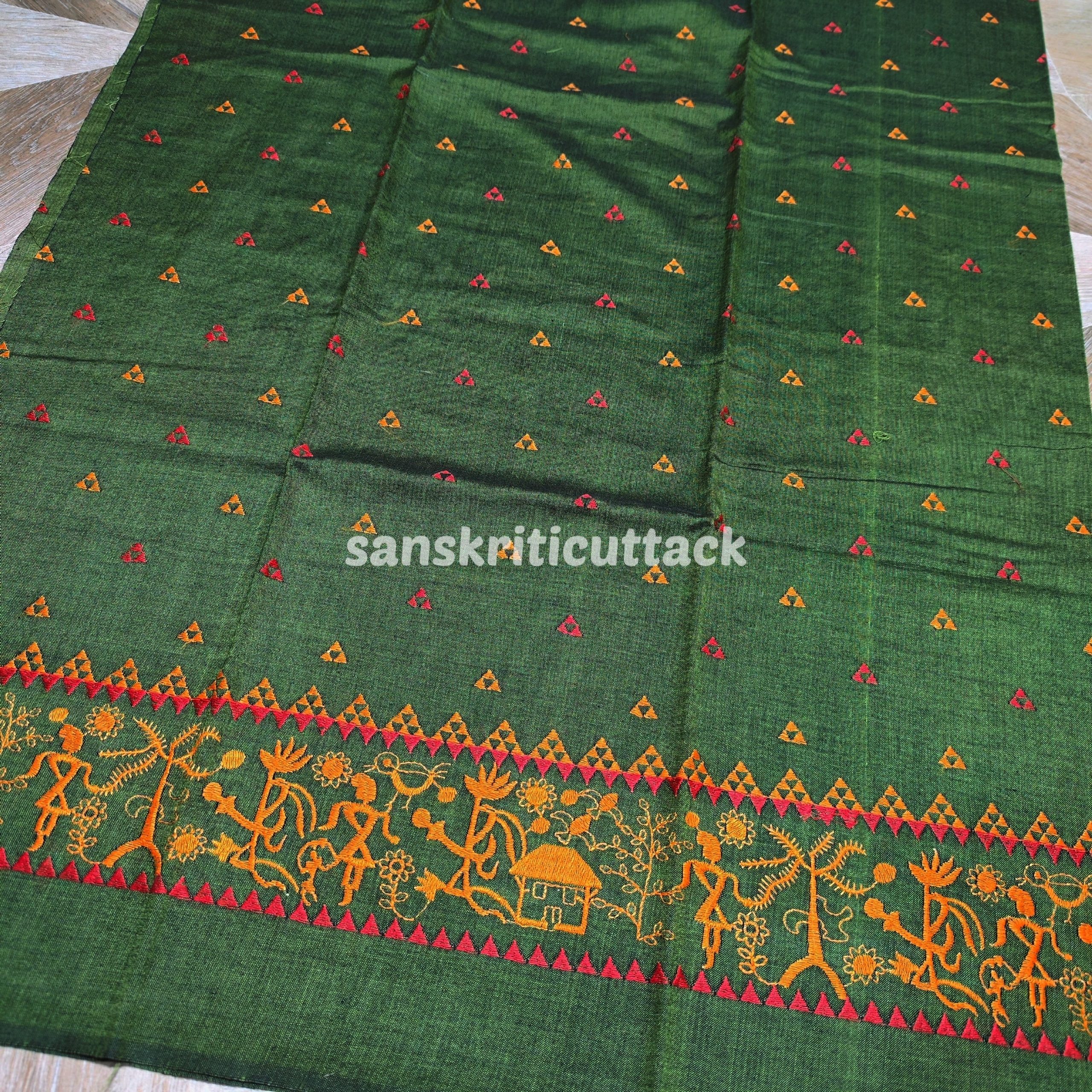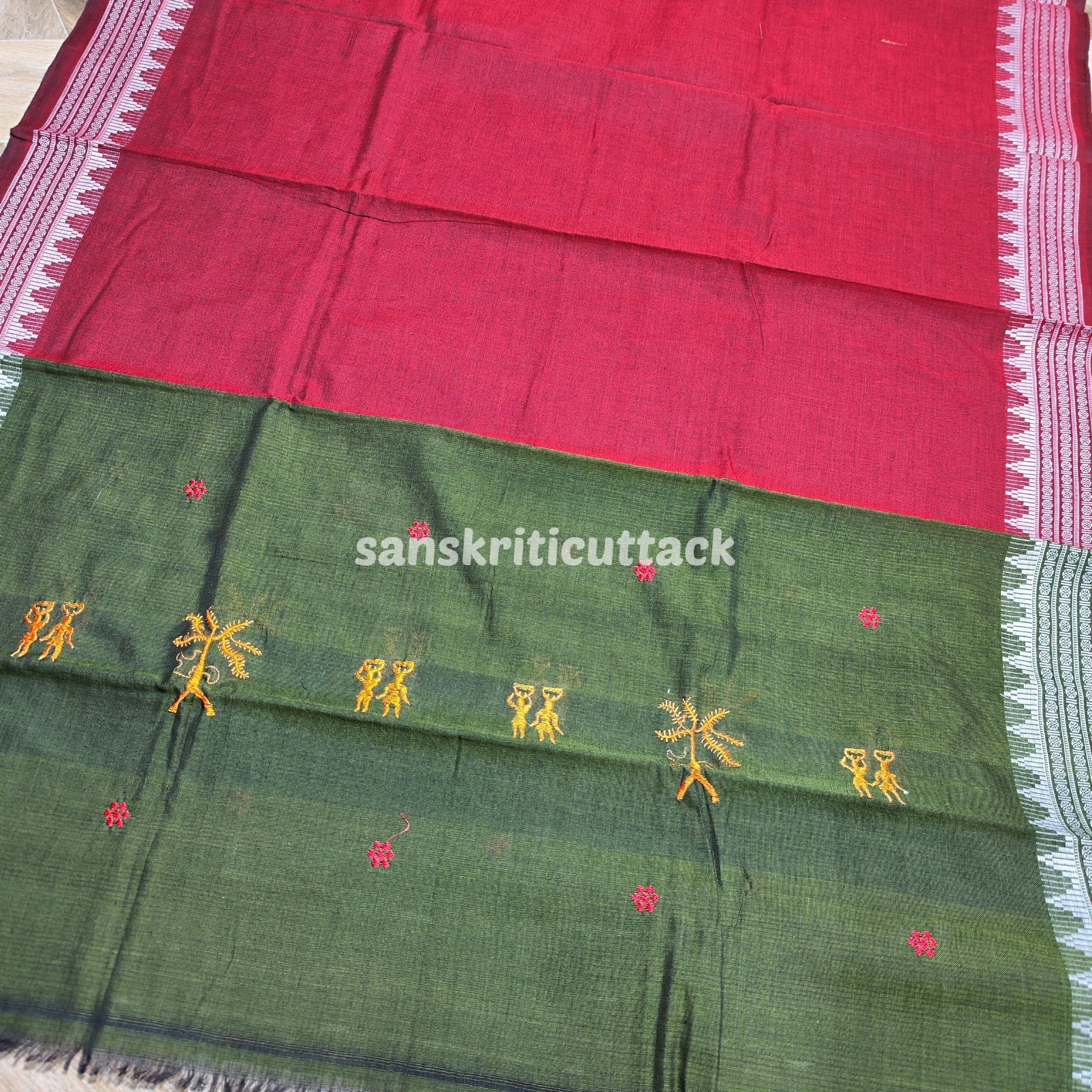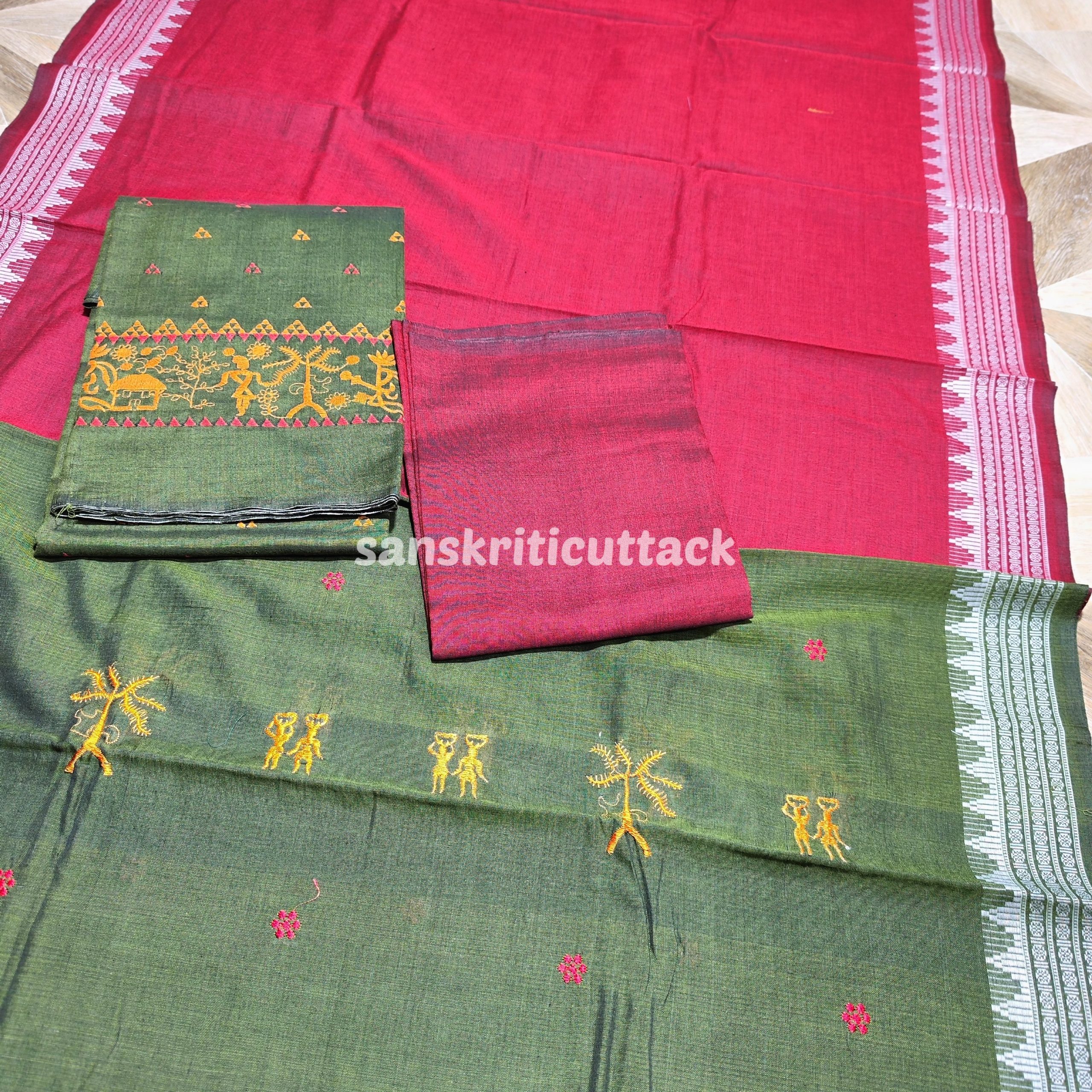 Step into a world of timeless grace and ethnic charm with our Olive Maroon Nuapatna Embroidery Handloom Cotton Dress Material. This exquisite dress material is a perfect blend of traditional craftsmanship and contemporary design.