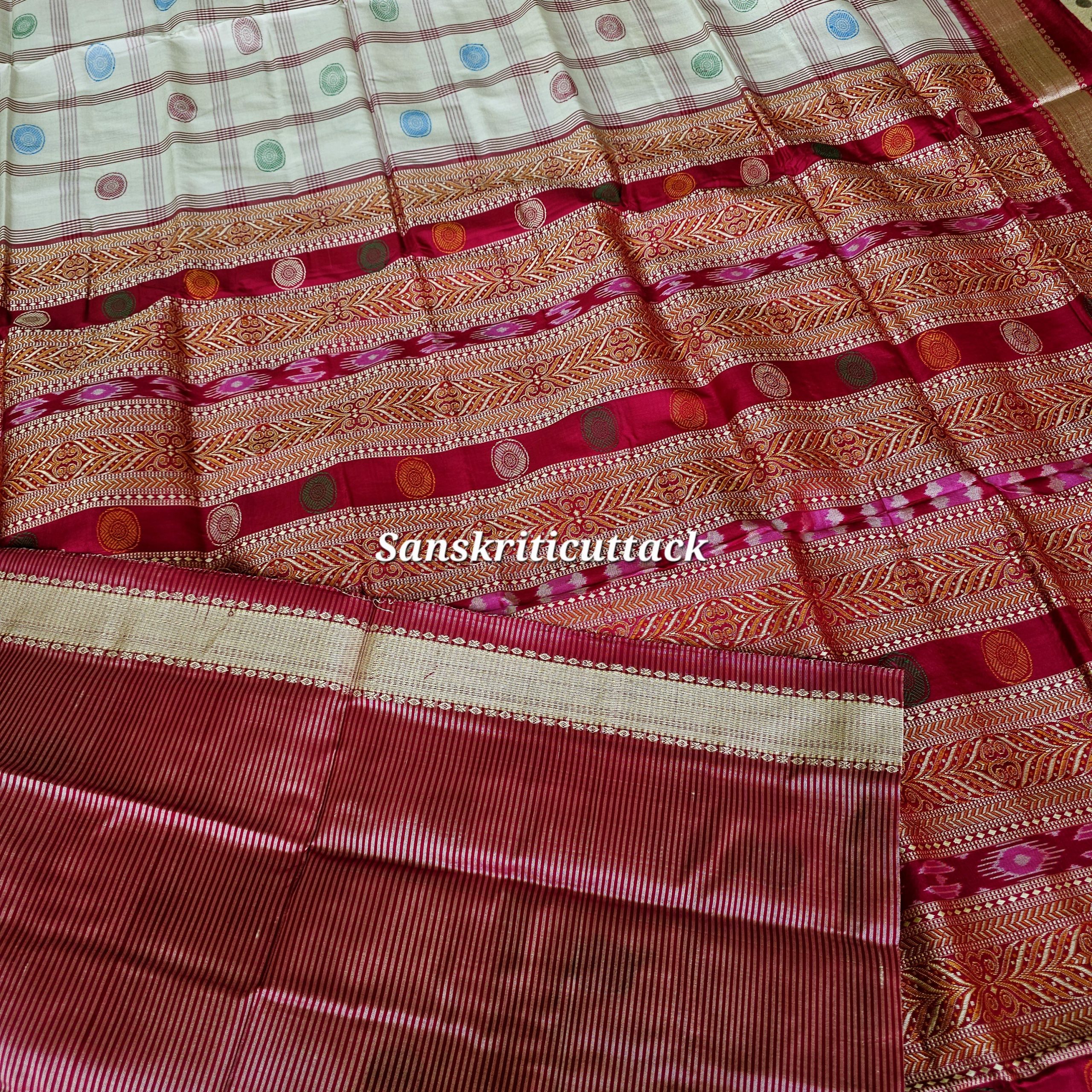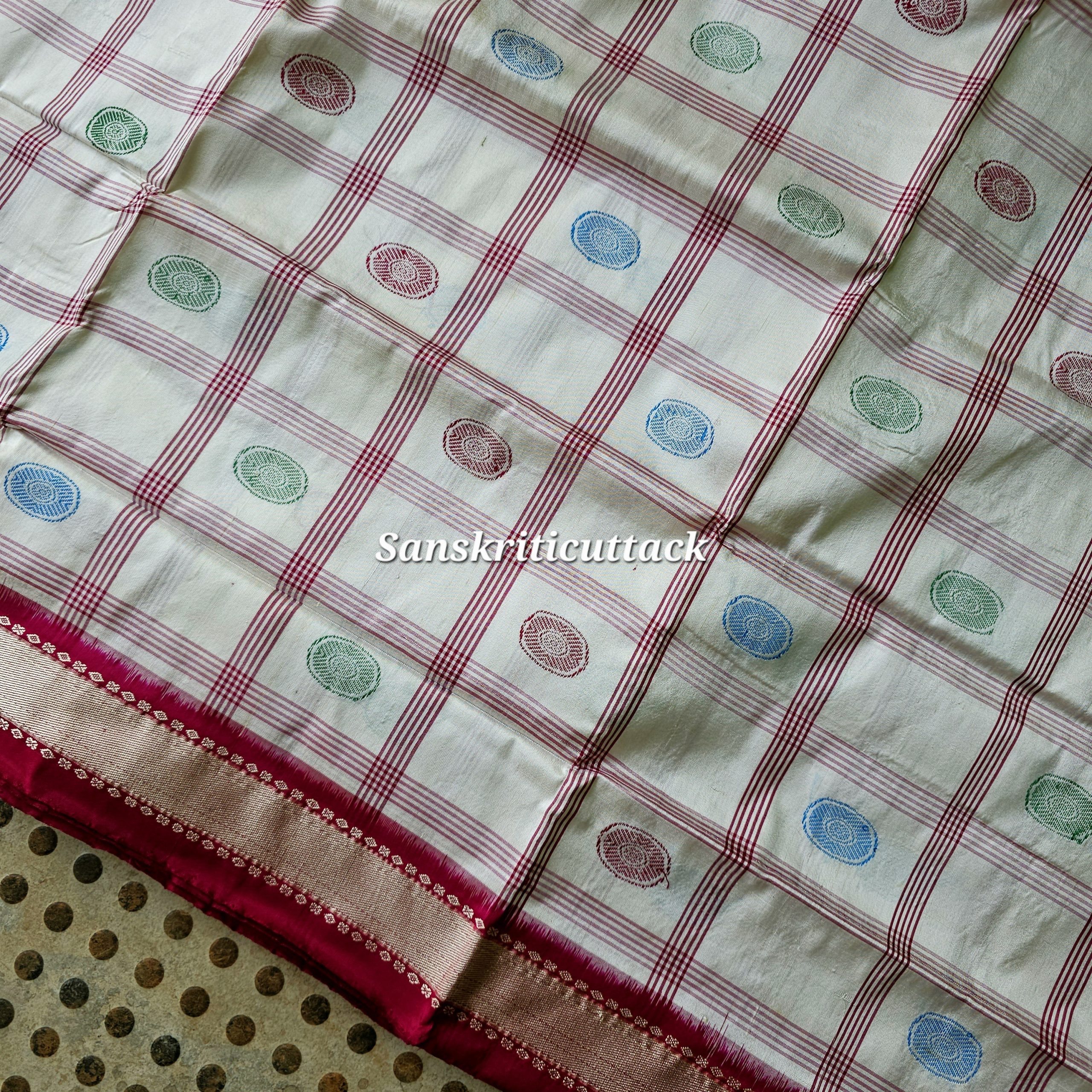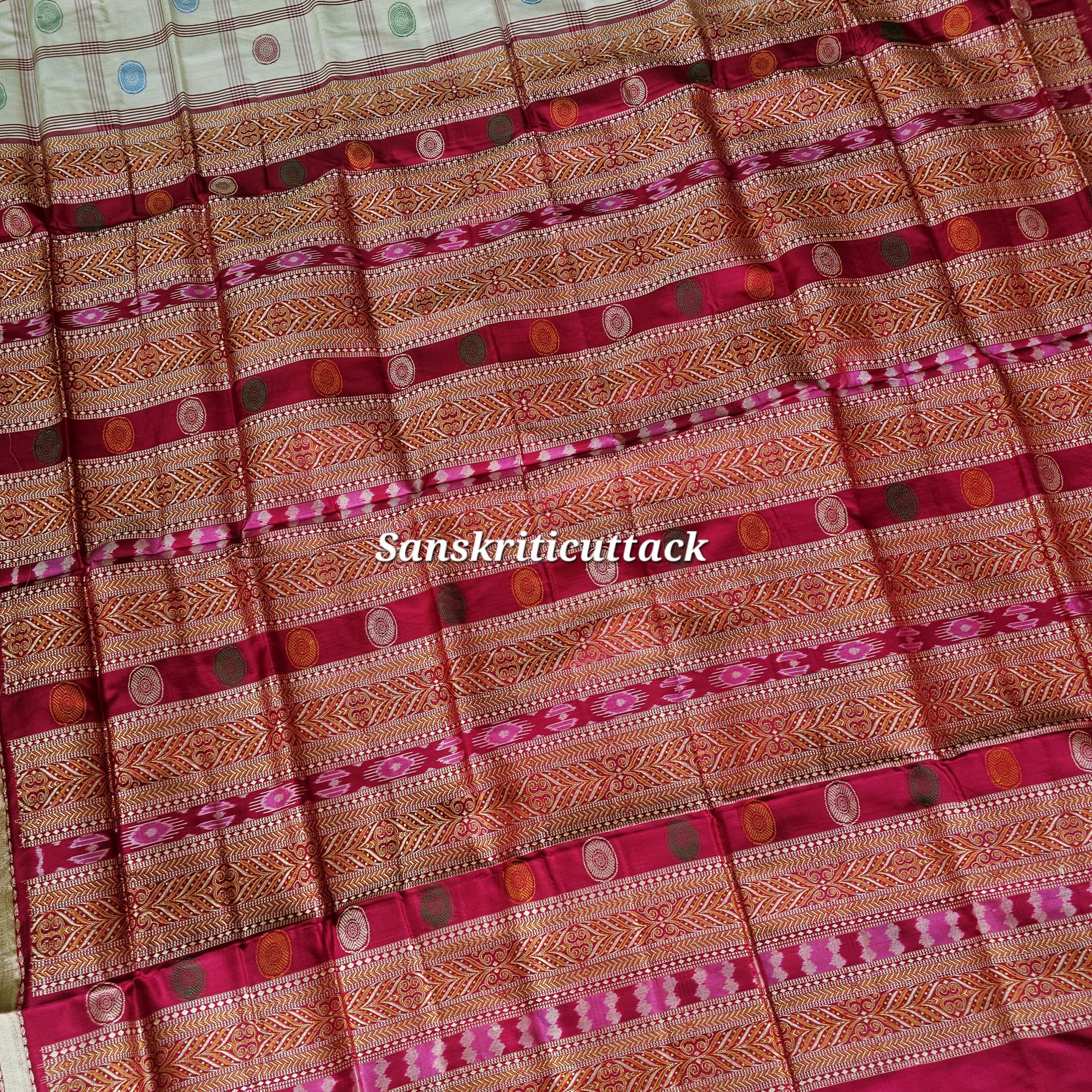 Indulge in timeless elegance with the Sanskriti Cuttack Premium Bomkai Silk Saree — a masterpiece of traditional Indian handloom artistry. The pearl white silk body features classic box motifs and intricate “wheel” designs, showcasing refined craftsmanship. The rich magenta Bomkai pallu is woven using the acclaimed extra weft technique — an age-old Odisha weaving tradition prized worldwide.