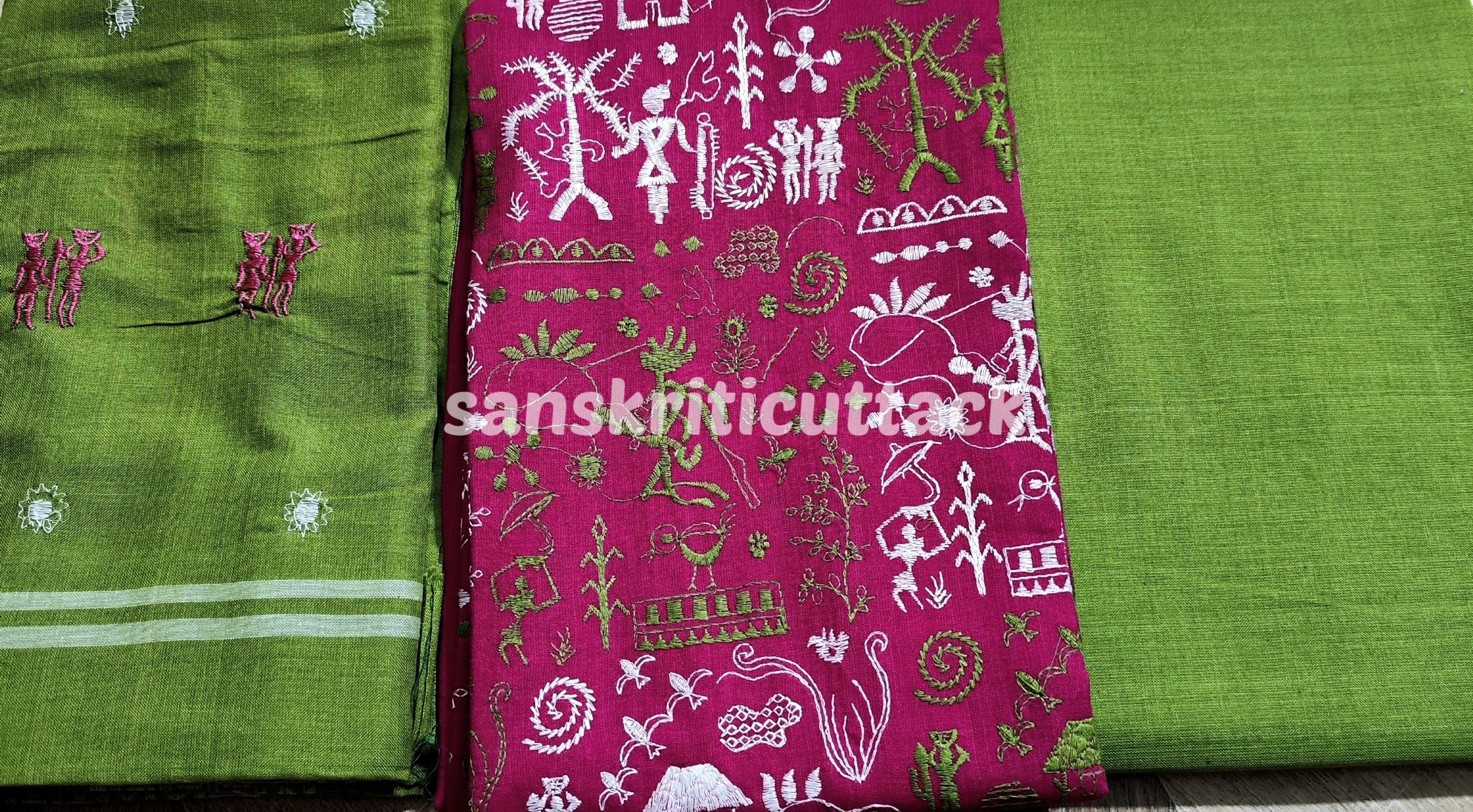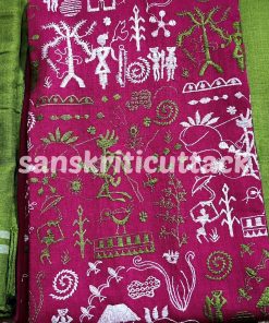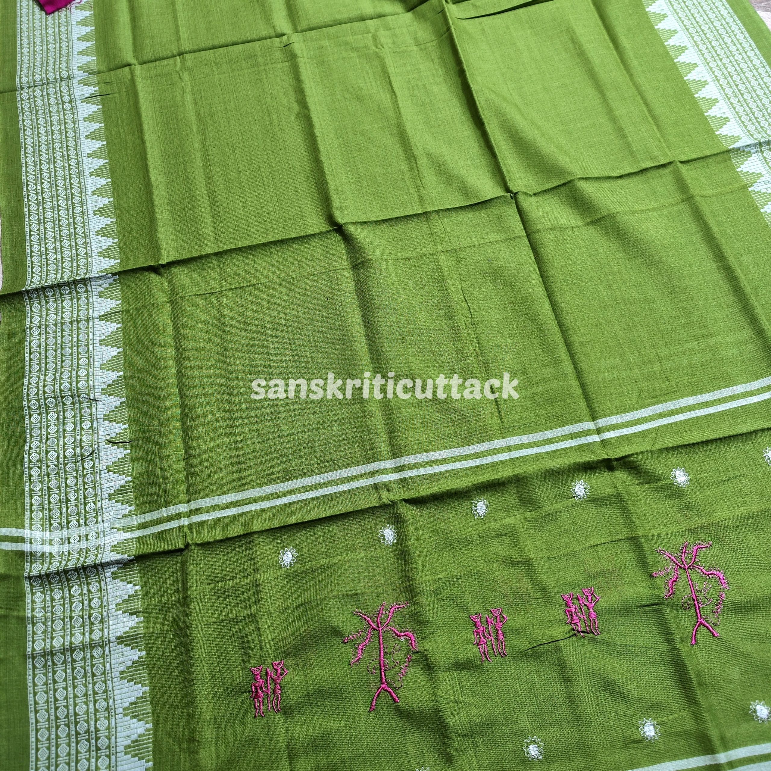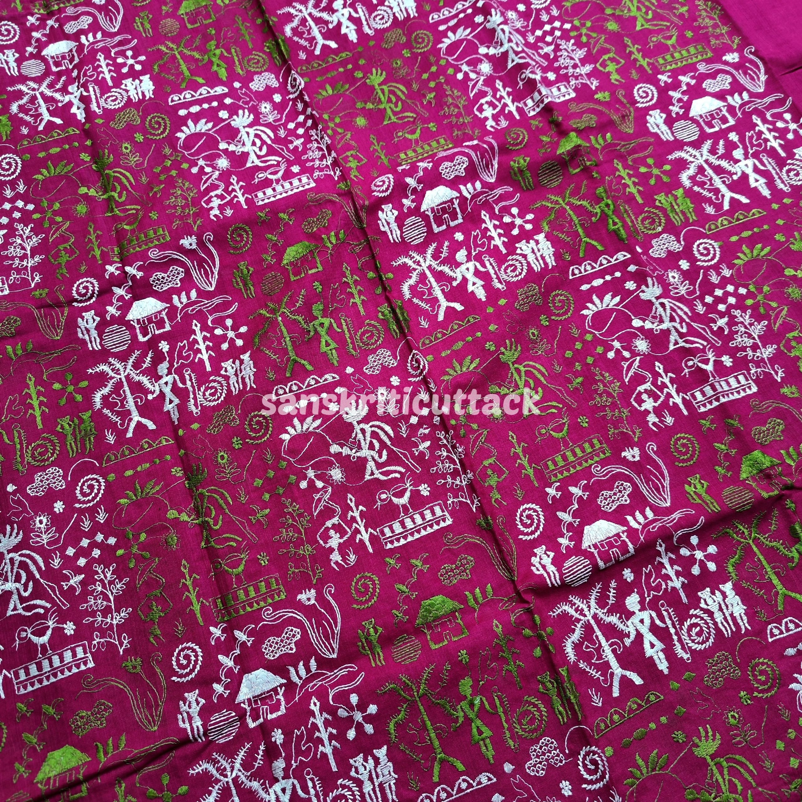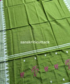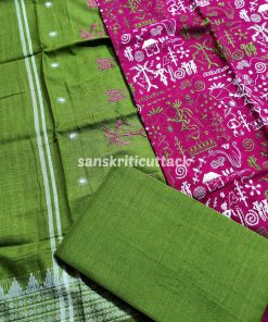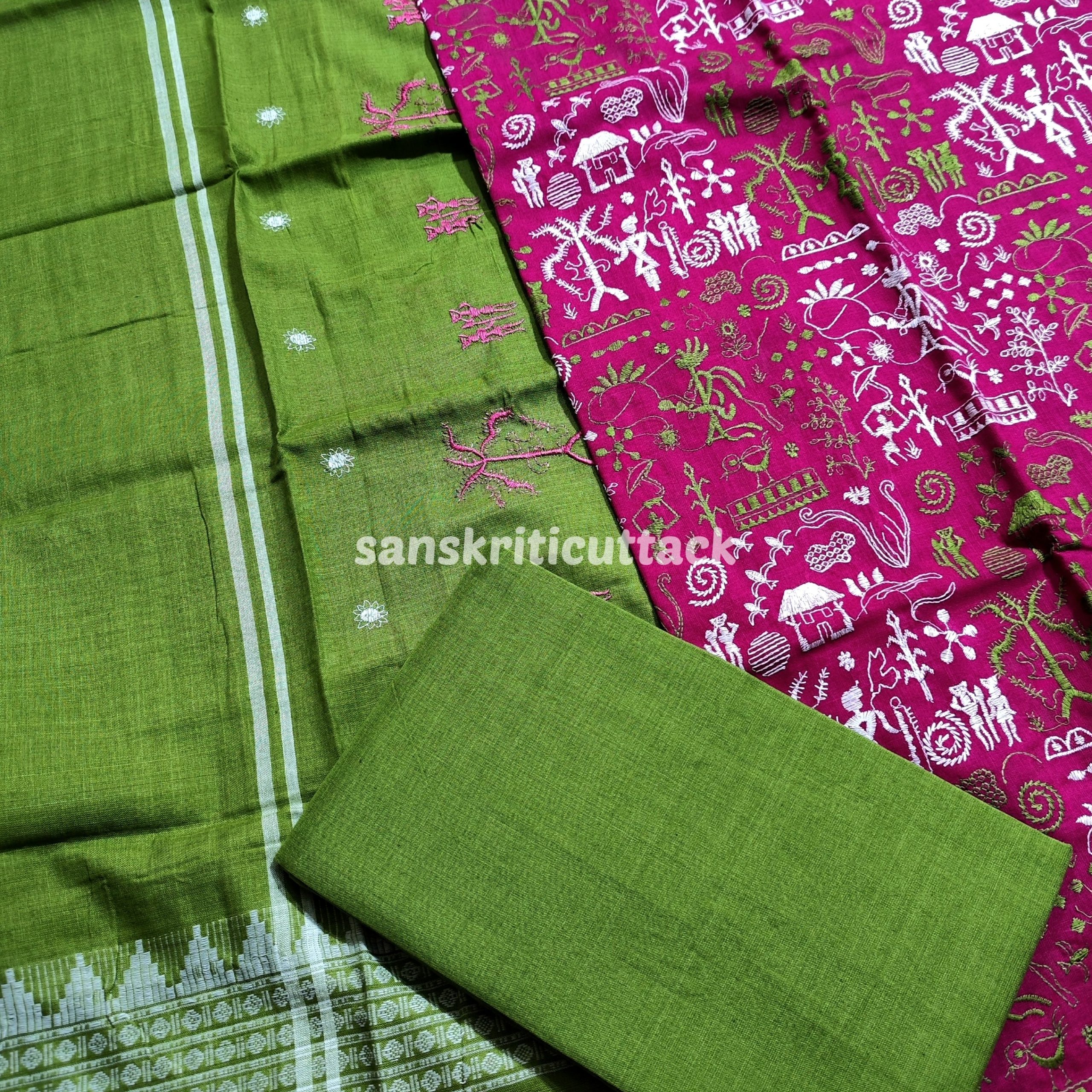 Elevate your ethnic wardrobe with our Pink Olive Green Embroidery Nuapatna Handloom Cotton Dress Material. This 3-piece suit material set is meticulously woven by the skilled master weavers of Nuapatna, Odisha, showcasing their fine craftsmanship. The dress material features delicate tribal embroidery that adds a touch of elegance to the outfit. The Olive Green Dupatta is adorned with embroidery on both edges, enhancing its beauty.