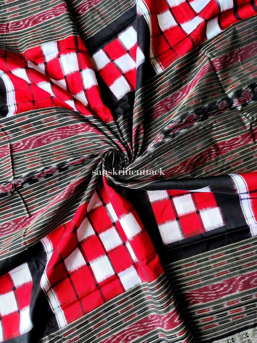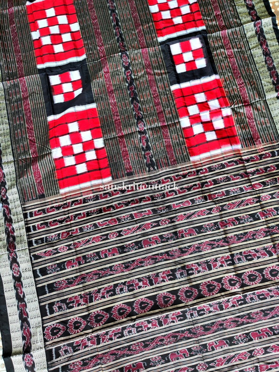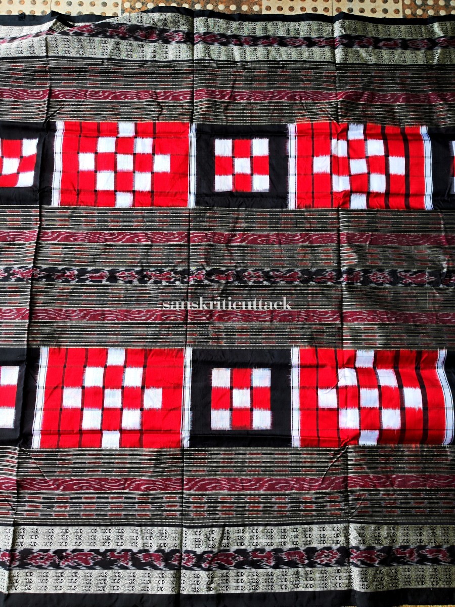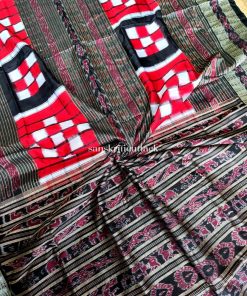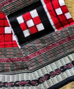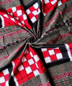 Elevate your ethnic style with our Red and Black Handloom Ikat Bichitrapuri Silk Pasapalli Saree. Crafted with finesse, this resplendent saree features mesmerizing hand-woven silk thread motifs and double borders that add a touch of opulence. The striking traditional border in the middle sets this saree apart, creating a stunning visual contrast. Enveloped in elegance, the Bichitrapuri Saree celebrates the rich heritage of Indian craftsmanship.
