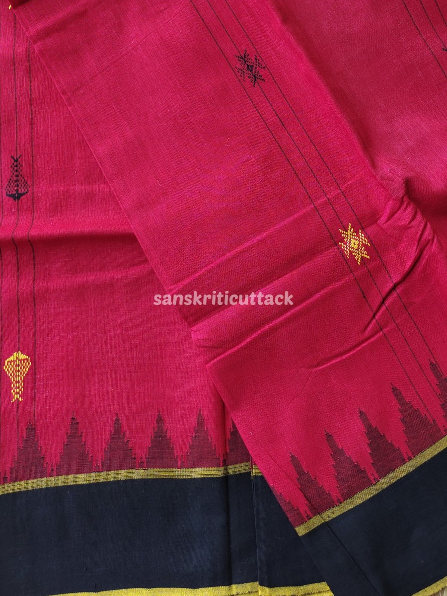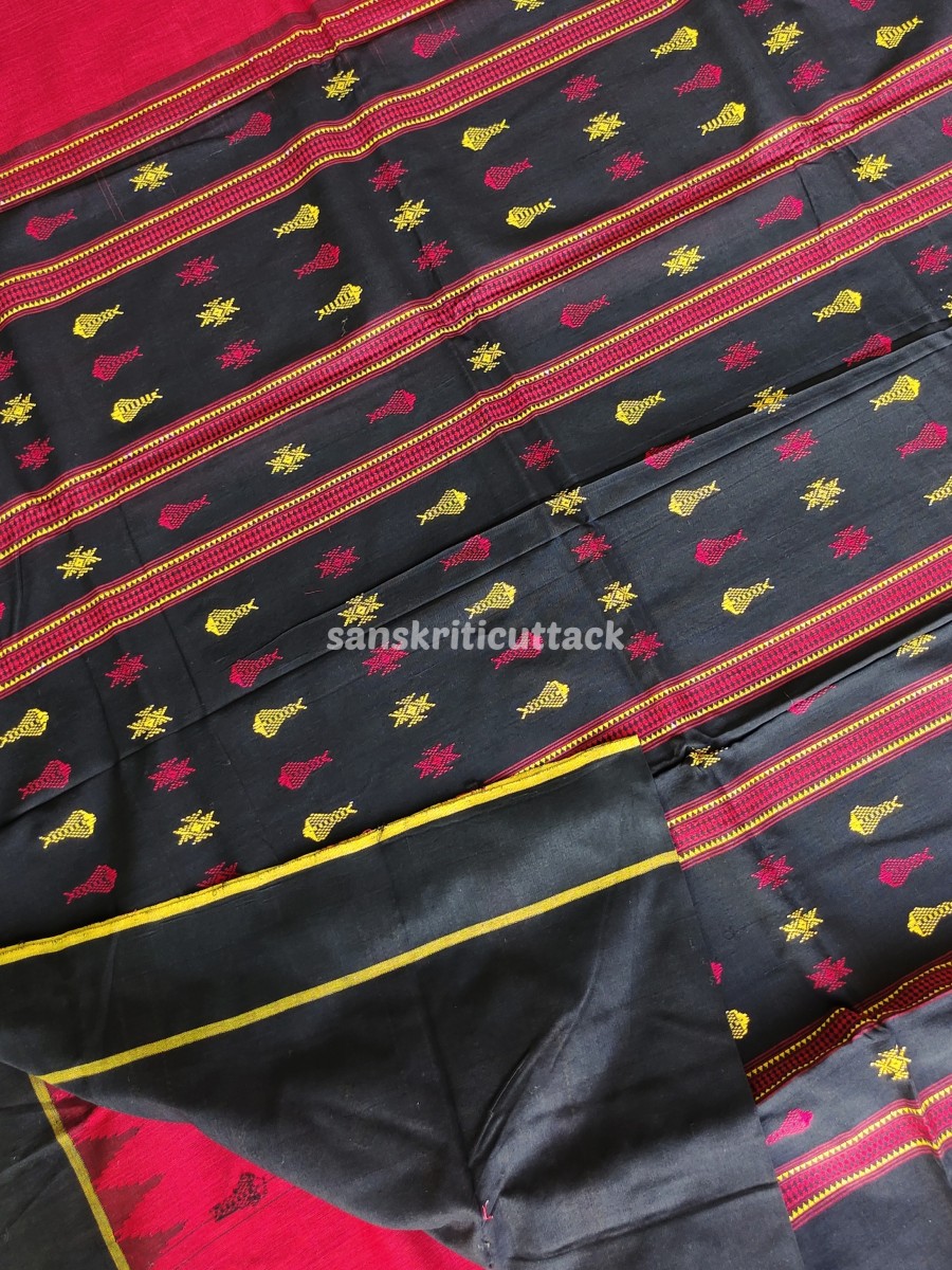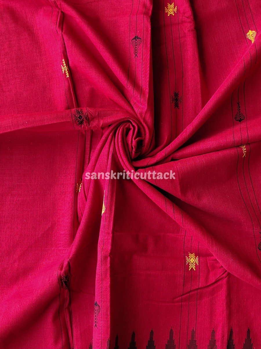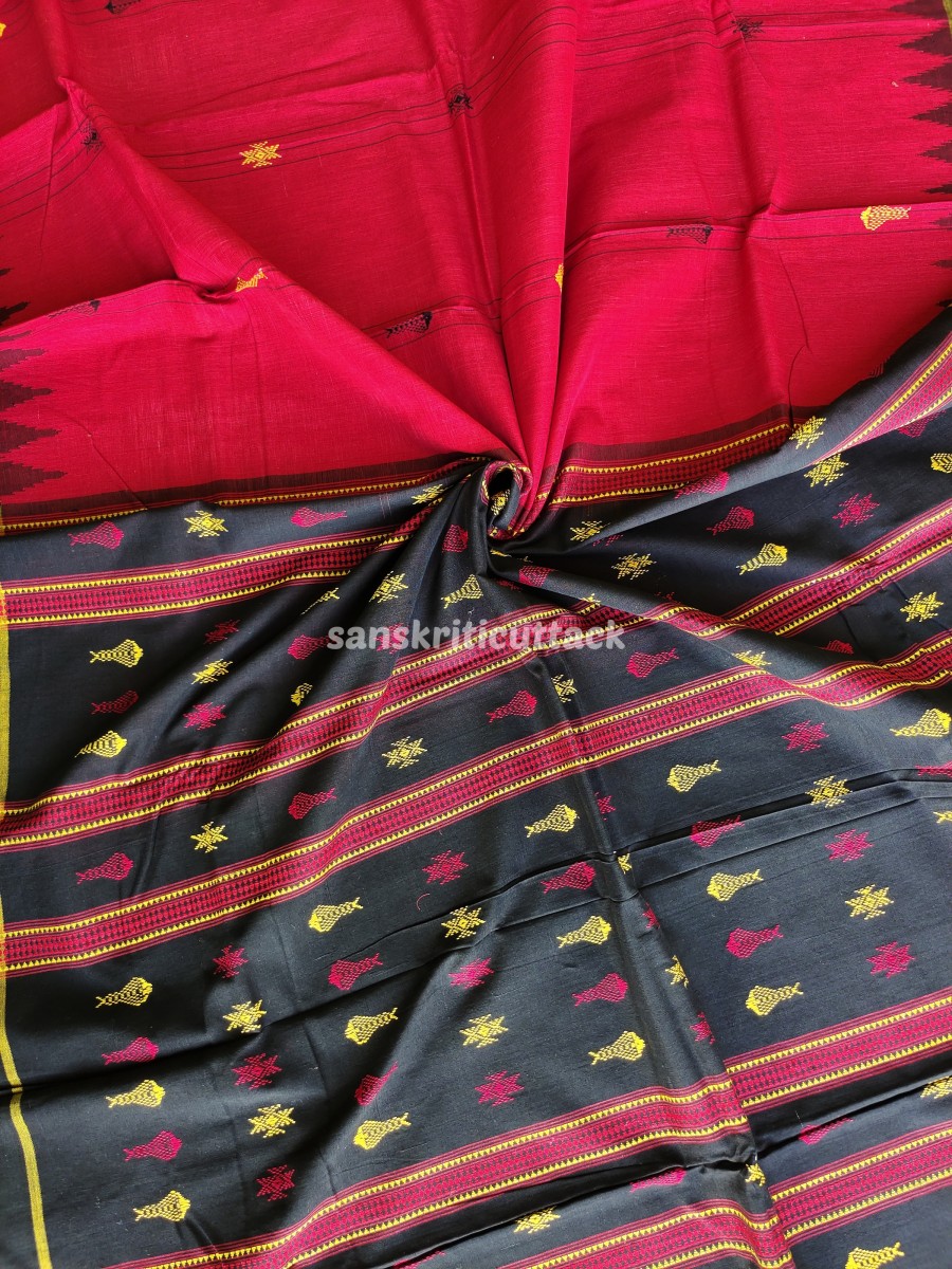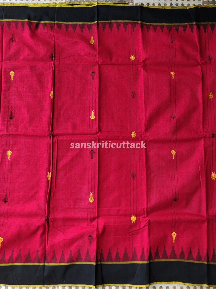 The bold red and black color combination beautifully intertwines in a captivating pattern that draws attention while retaining classic sophistication. Traditional tribal motifs — emblematic of Odisha’s cultural artistry — are woven directly into the fabric, celebrating indigenous design in every thread.